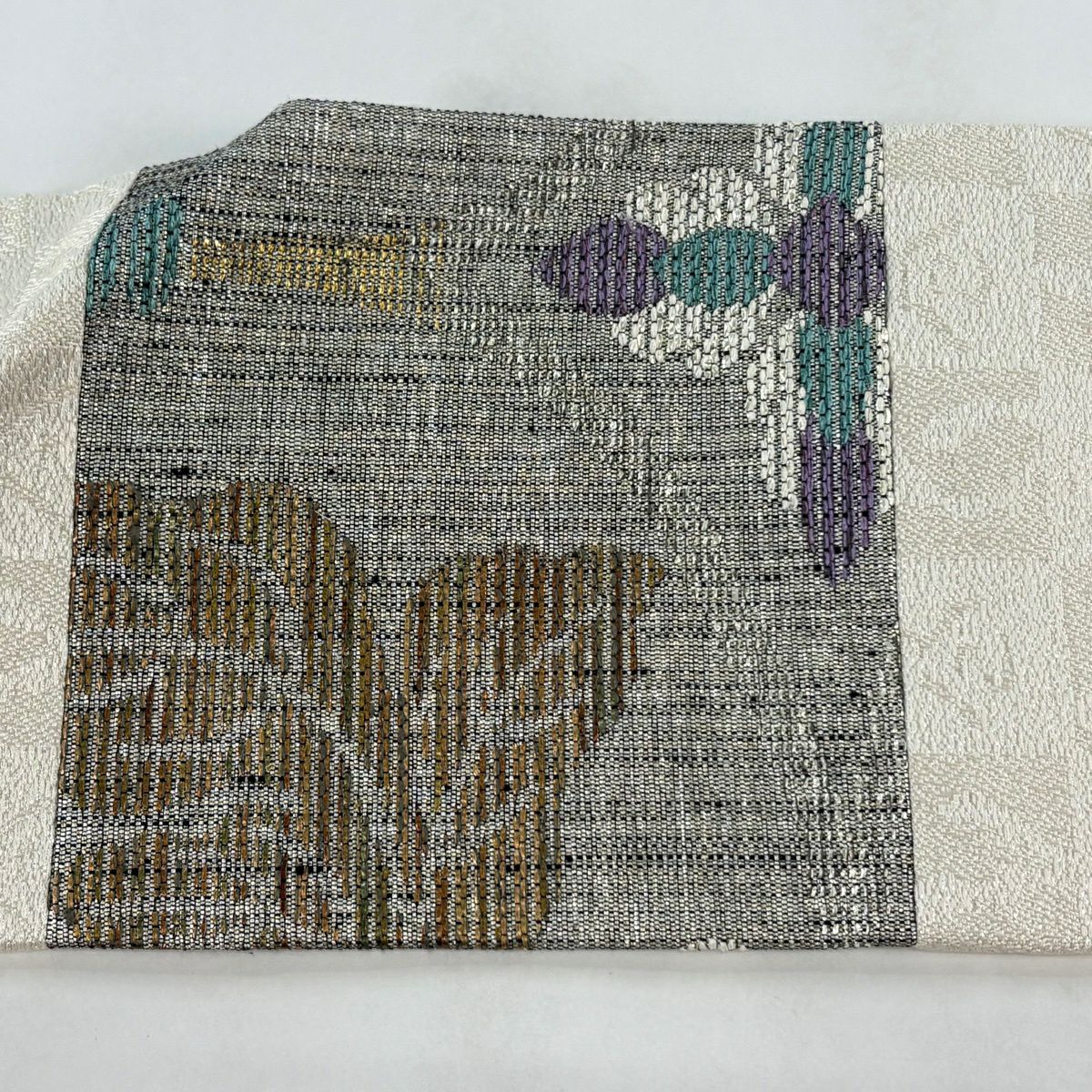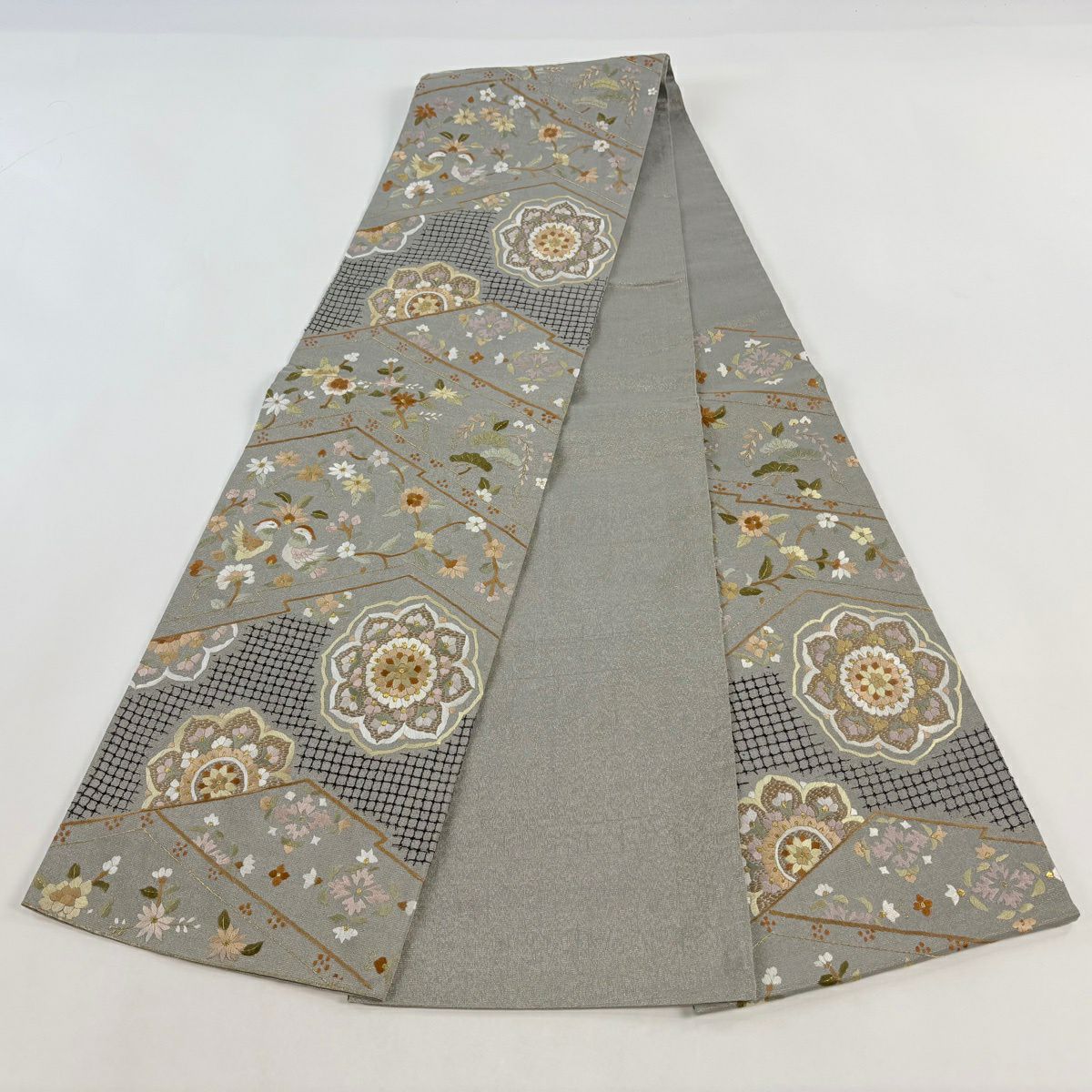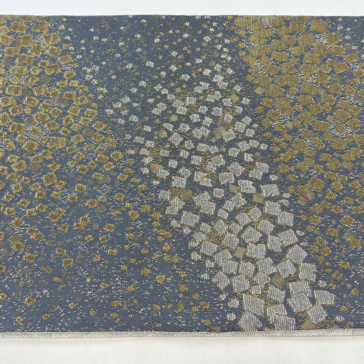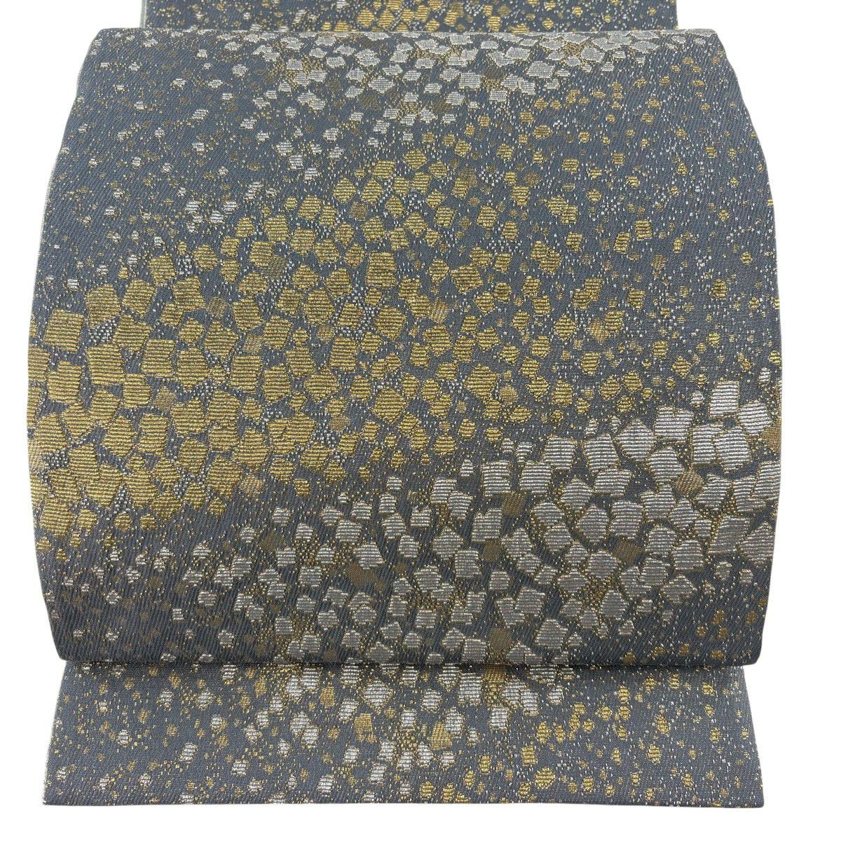 袋帯 逸品 牛首紬地 色紙 幾何学 金彩 灰色 全通 正絹