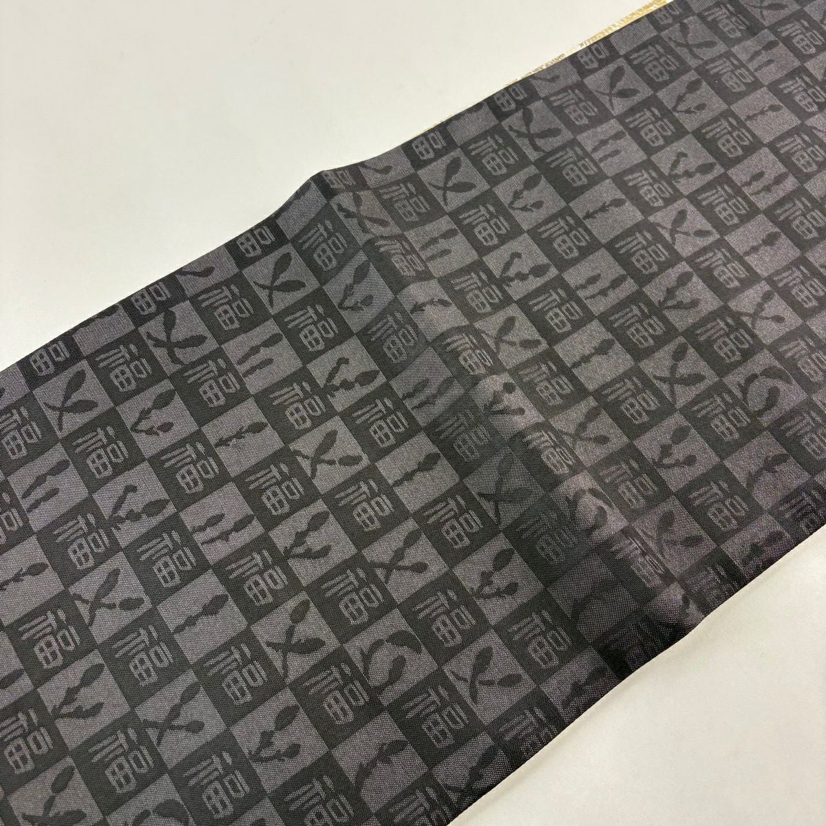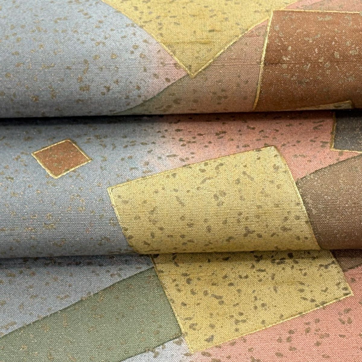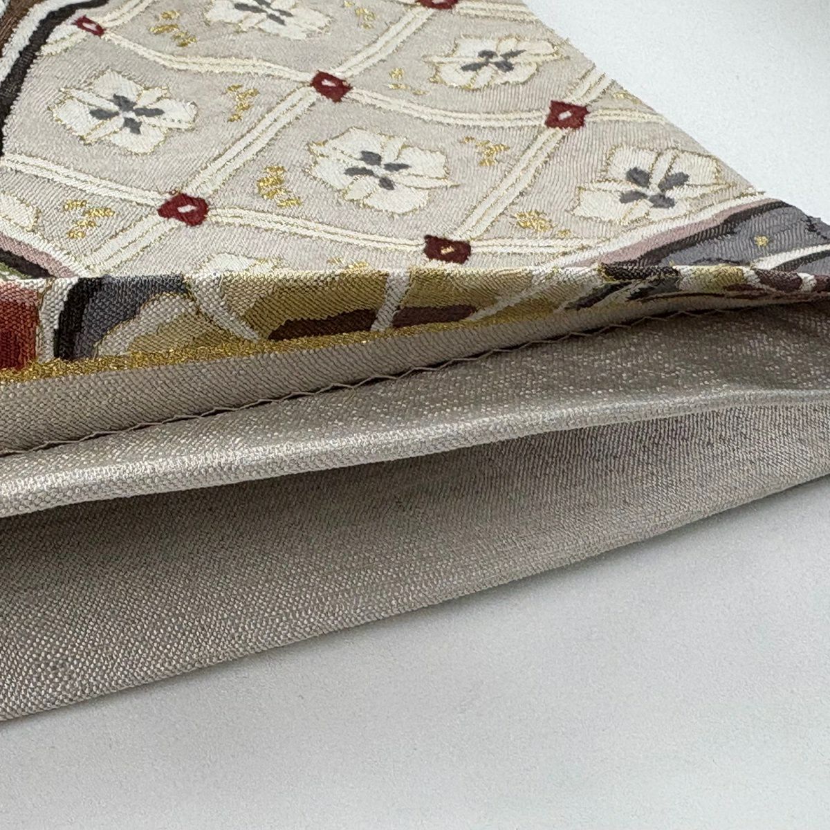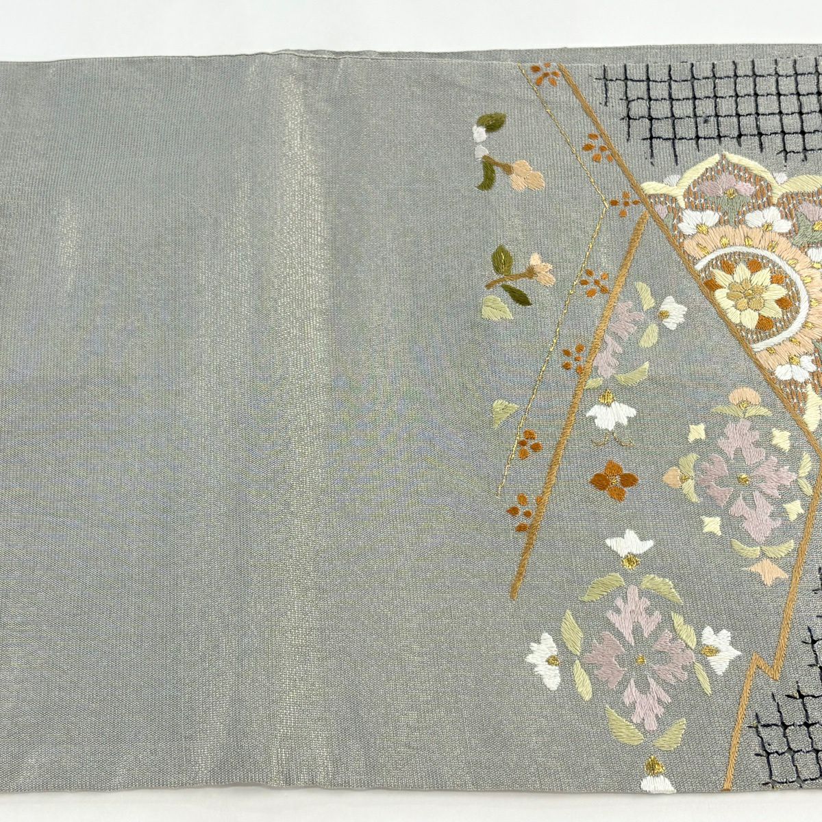 袋帯 逸品 牛首紬地 色紙 幾何学 金彩 灰色 全通 正絹