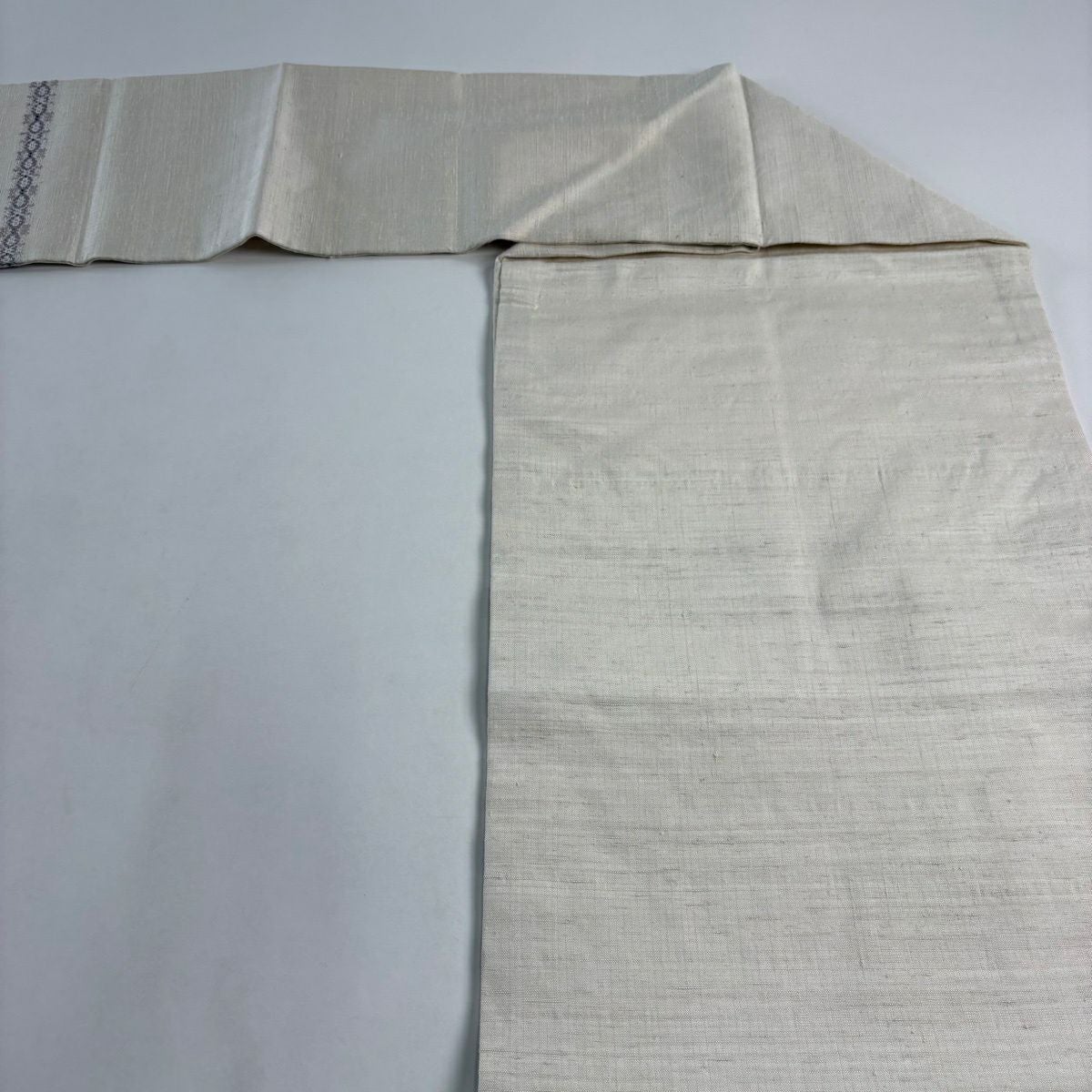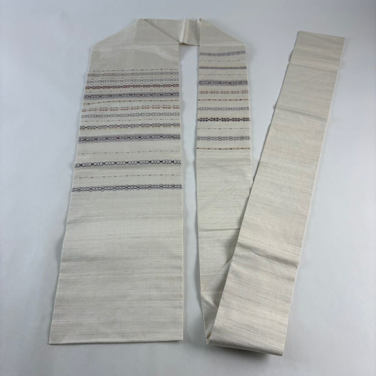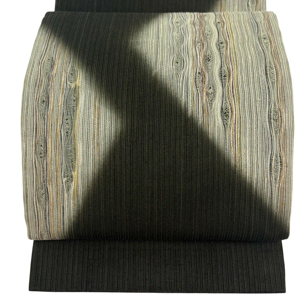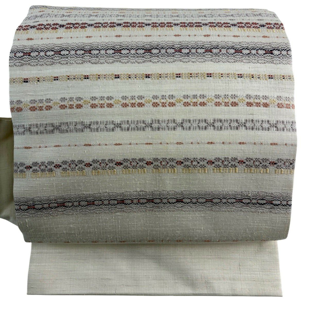 【美品】 名古屋帯 逸品 紬地 幾何学模様 縞 灰白 正絹