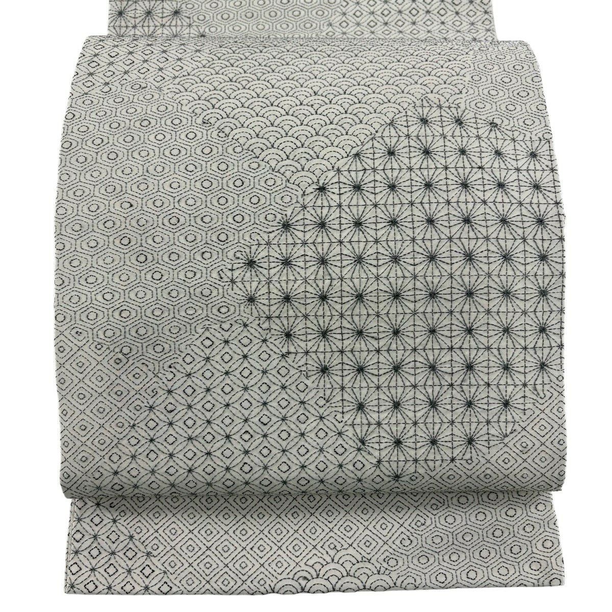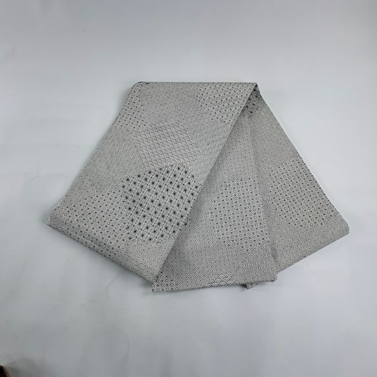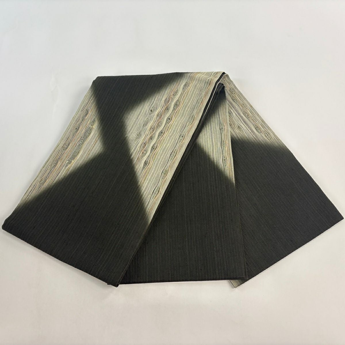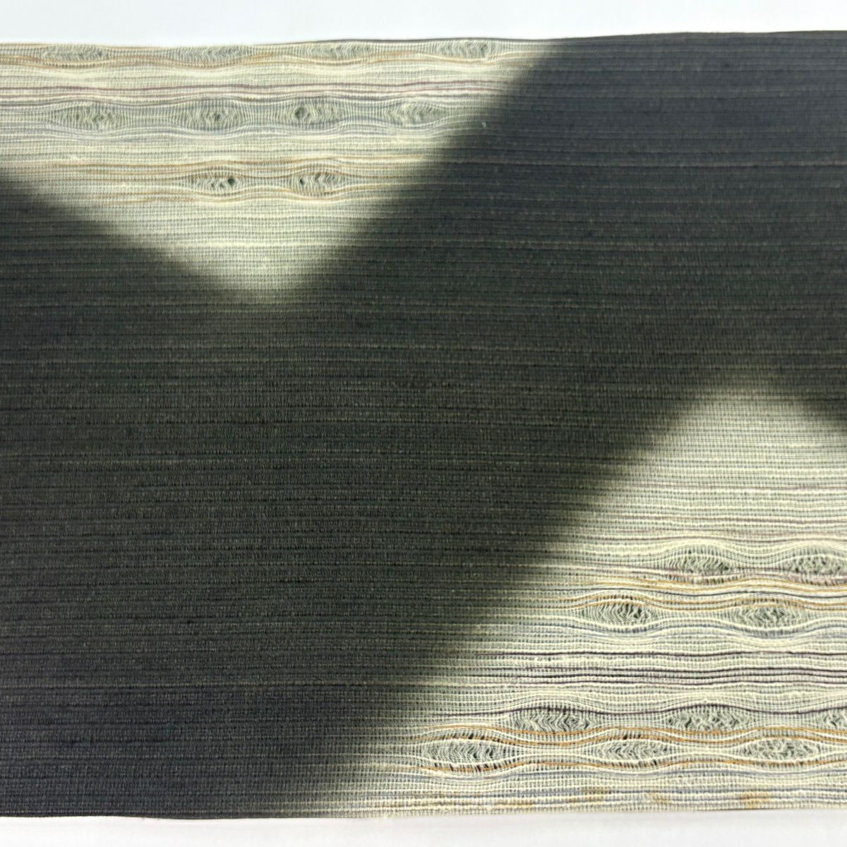 【美品】 名古屋帯 逸品 紬地 幾何学模様 縞 灰白 正絹