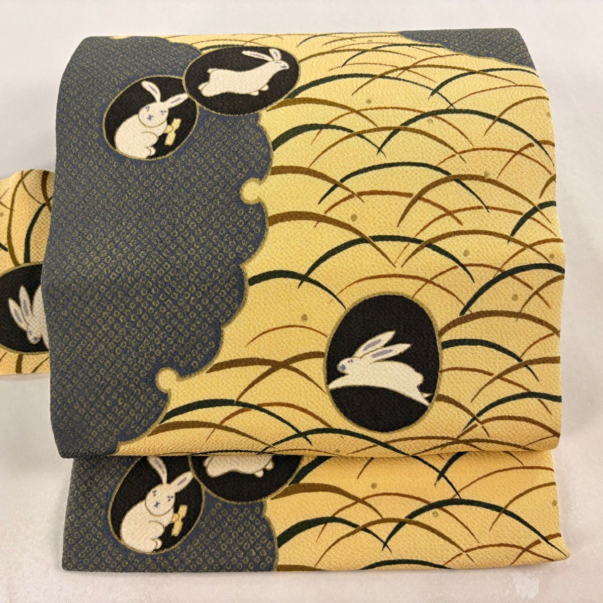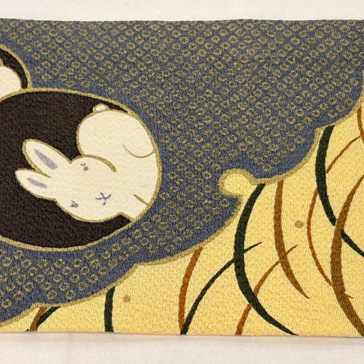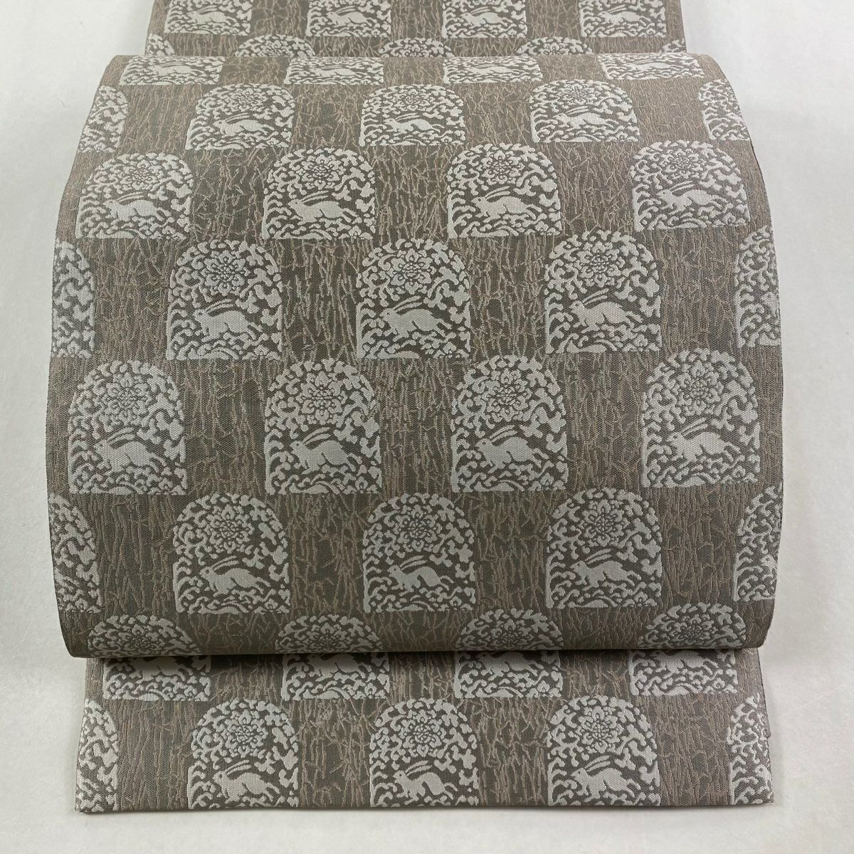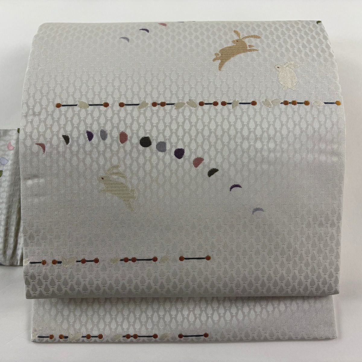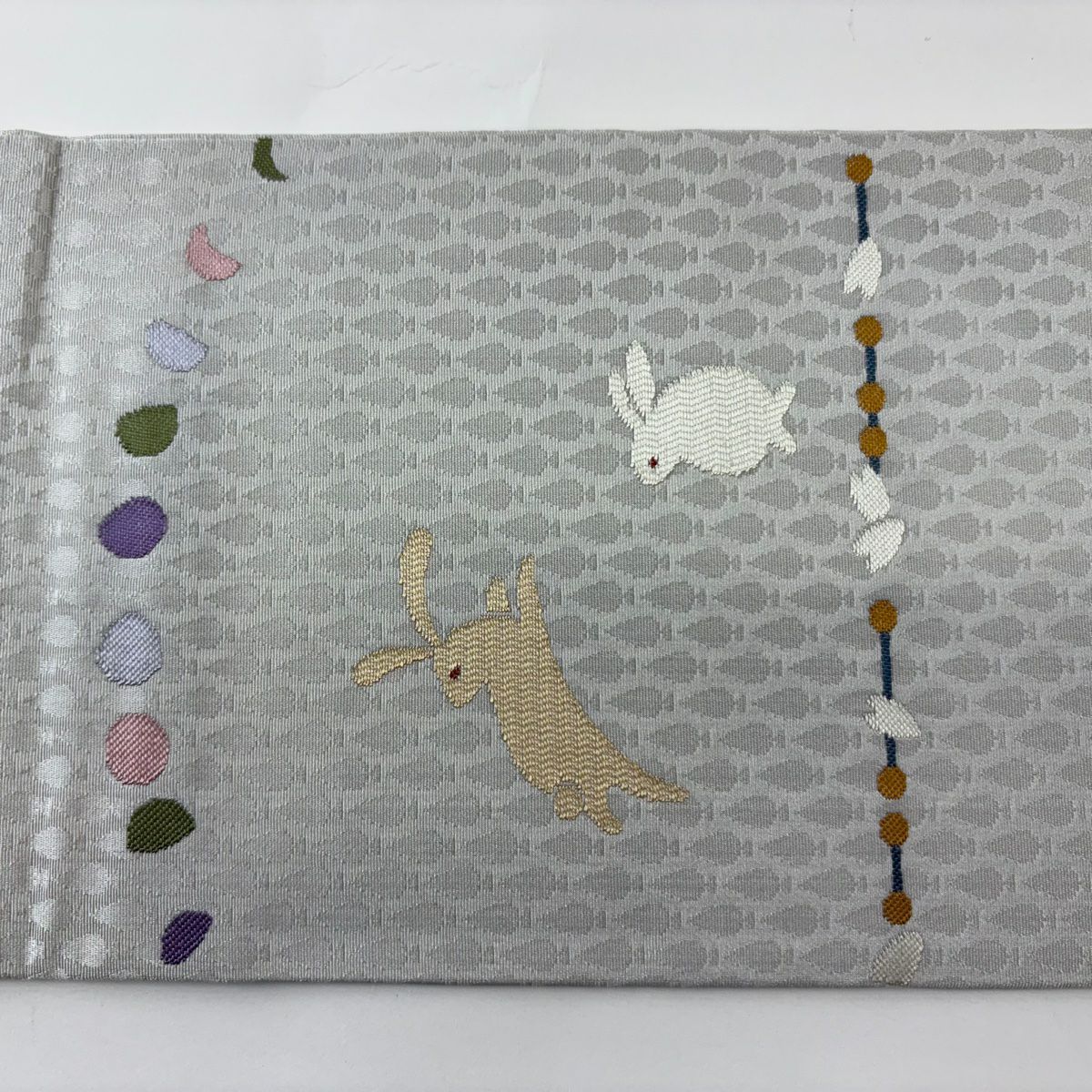 【美品】 名古屋帯 逸品 うさぎと月 花びら 灰色 正絹