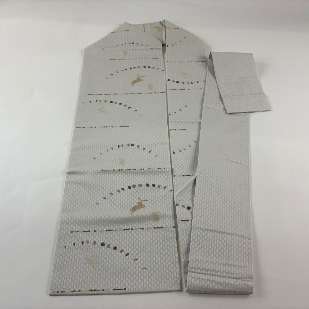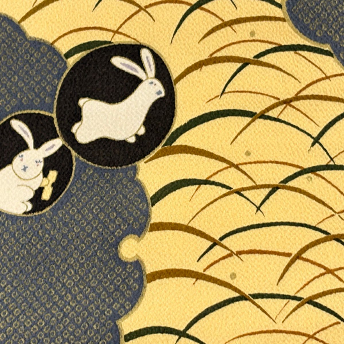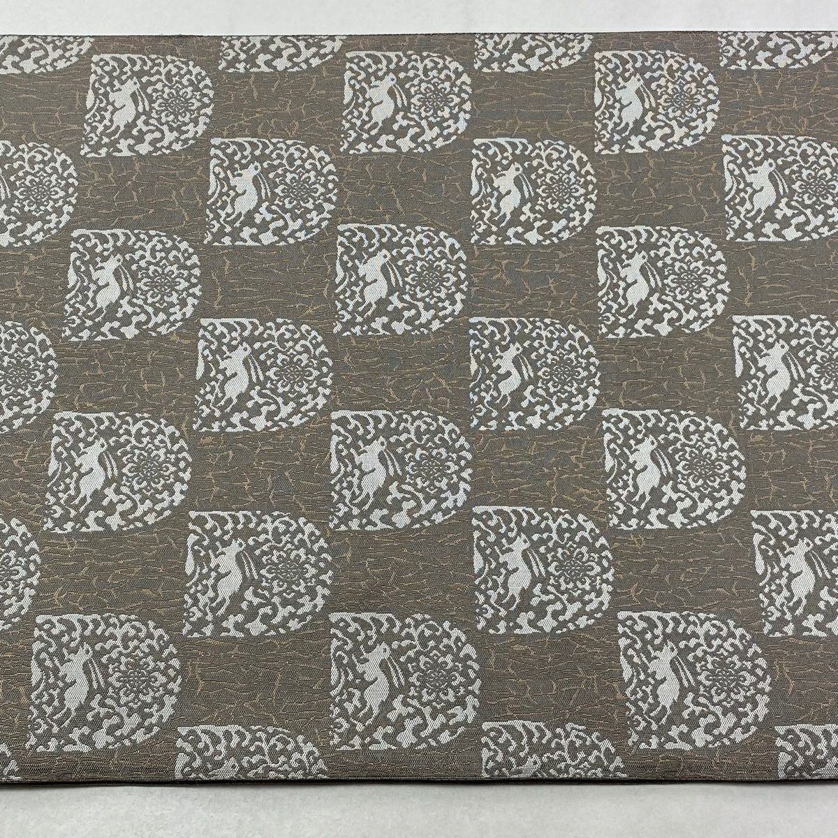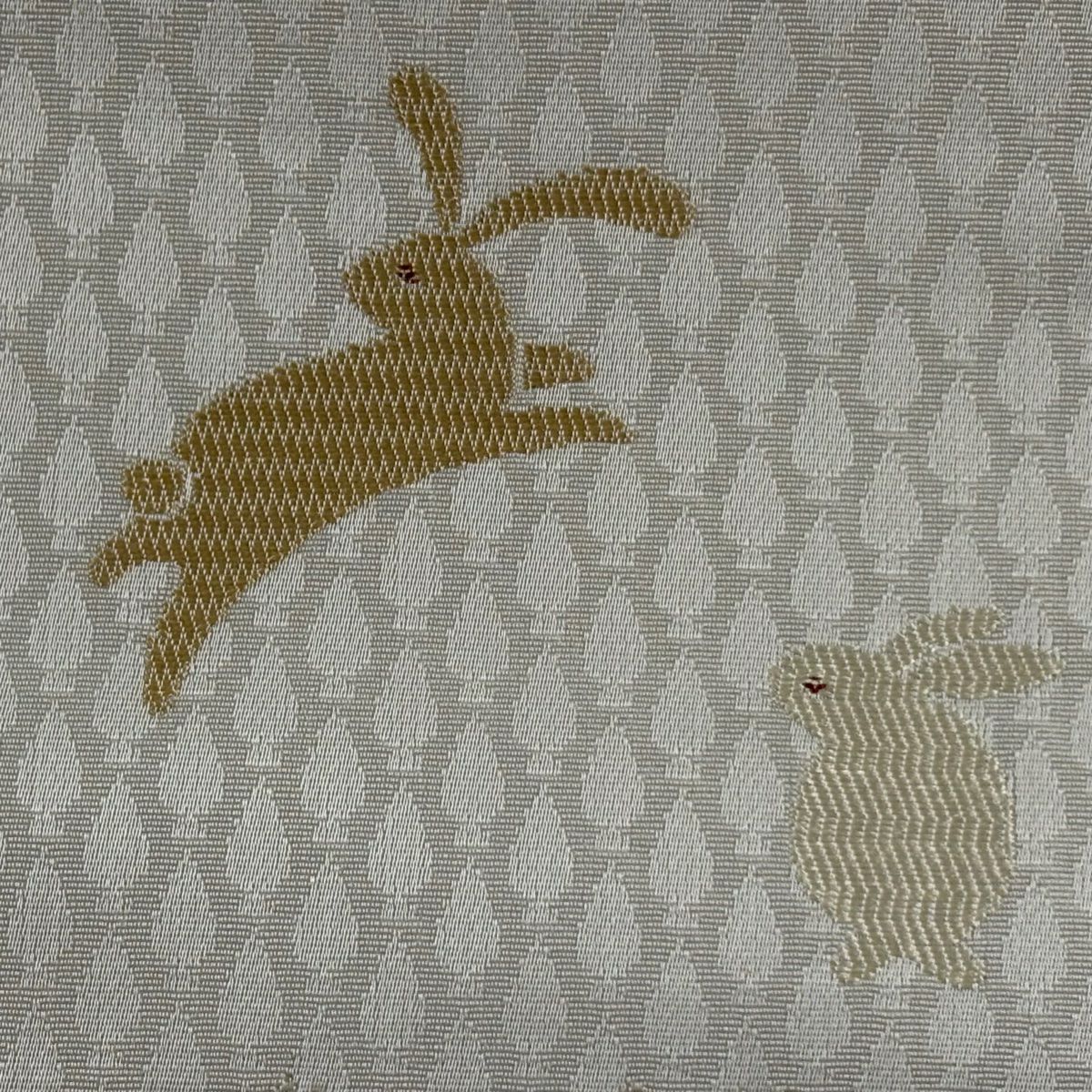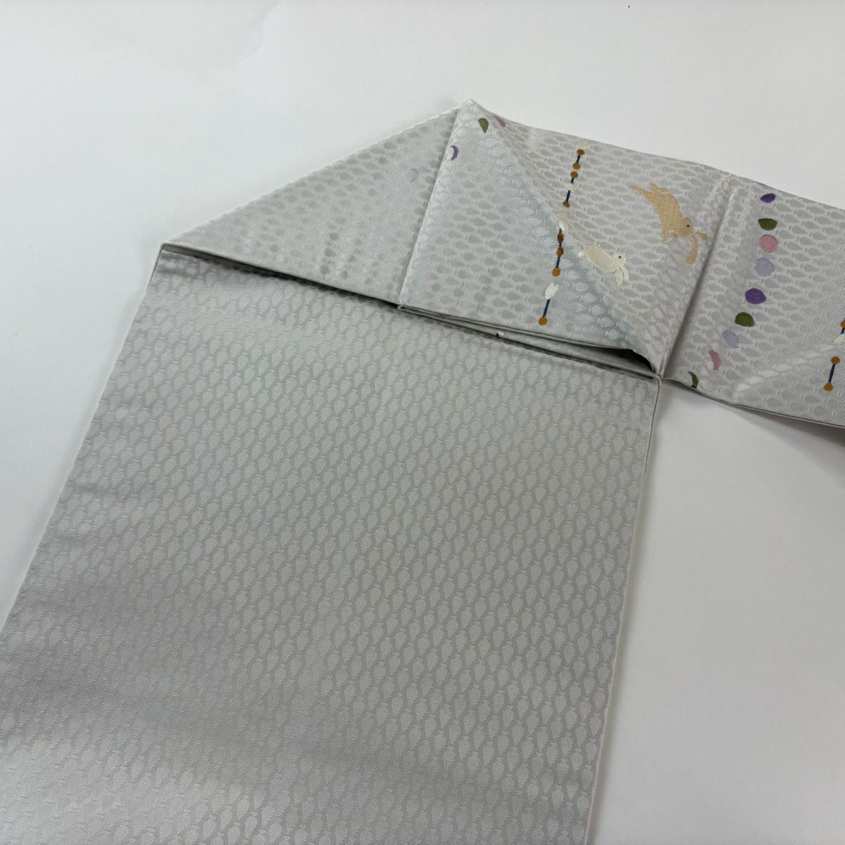 【美品】 名古屋帯 逸品 うさぎと月 花びら 灰色 正絹