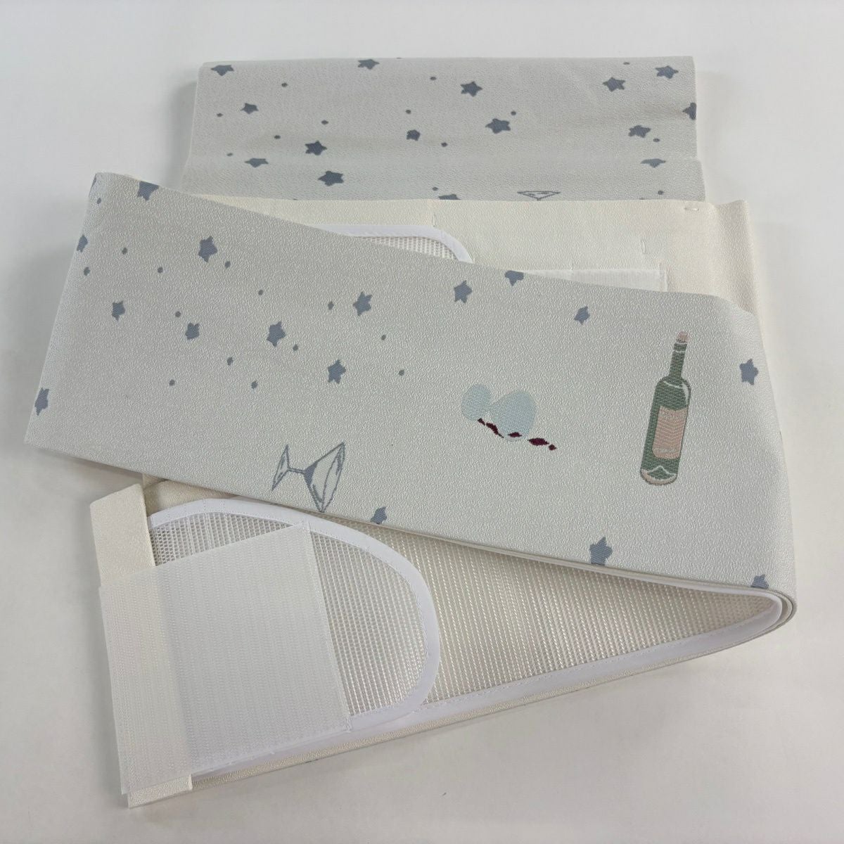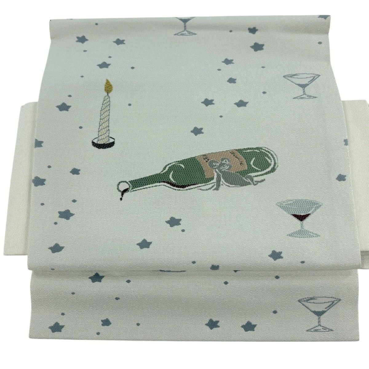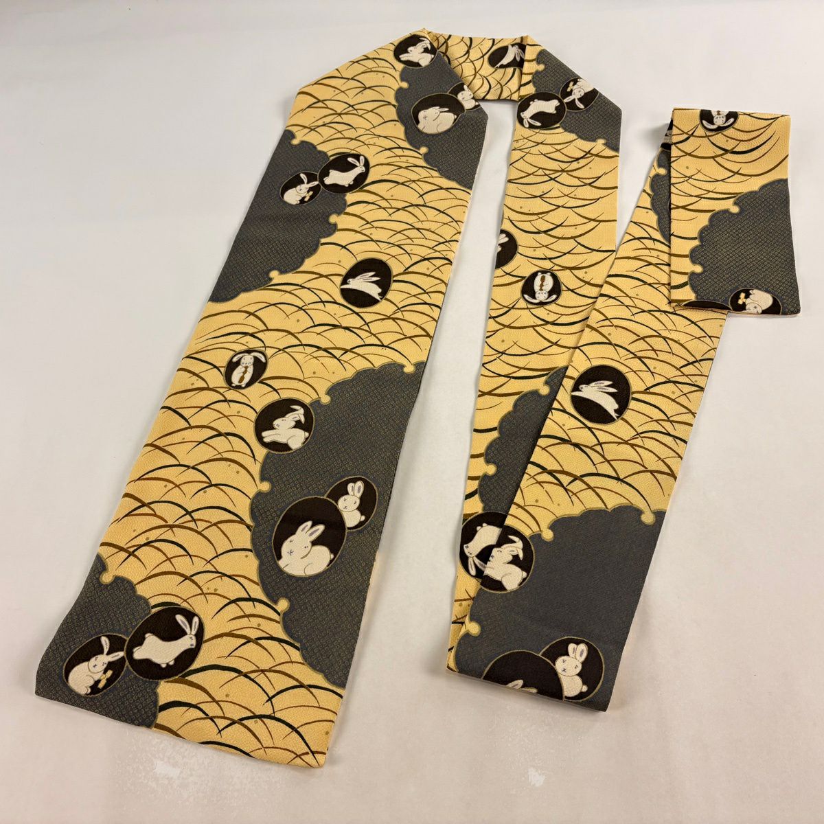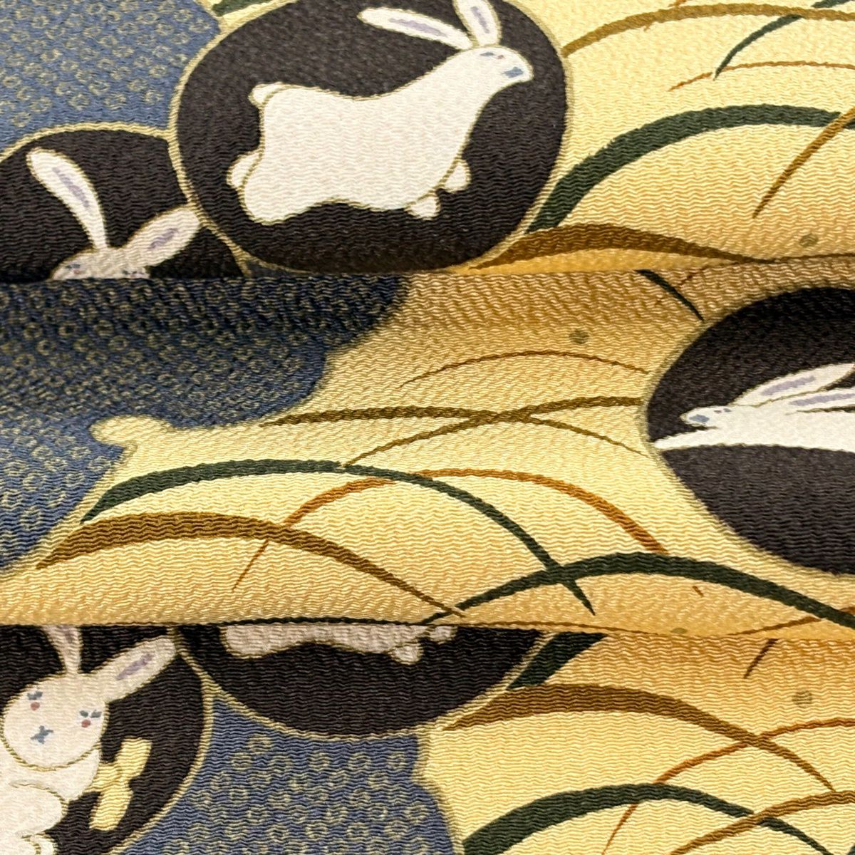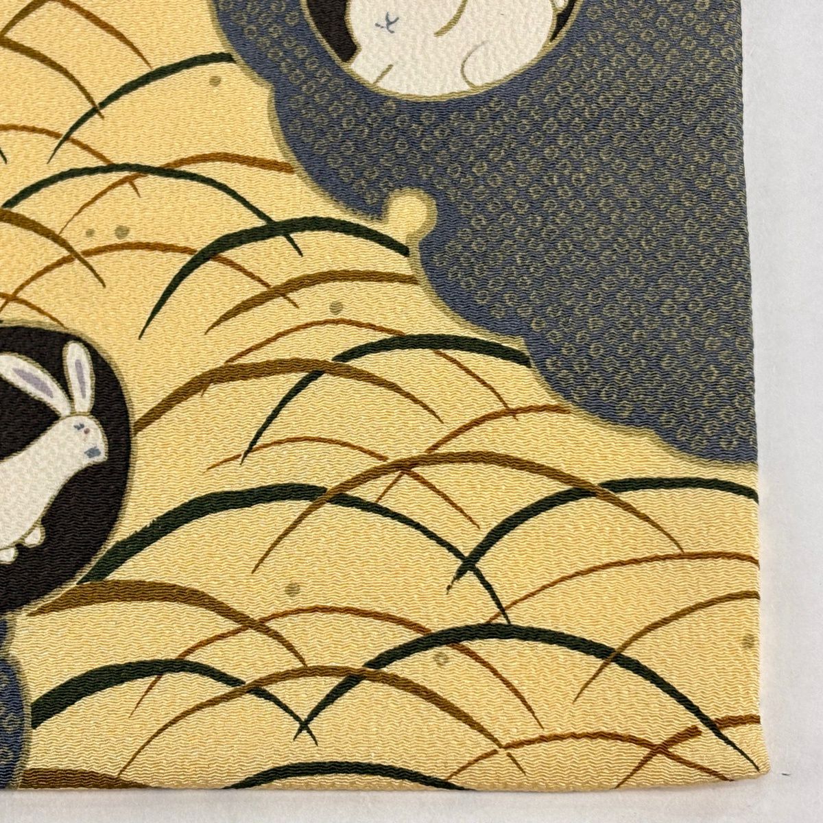 【美品】 名古屋帯 逸品 うさぎと月 花びら 灰色 正絹