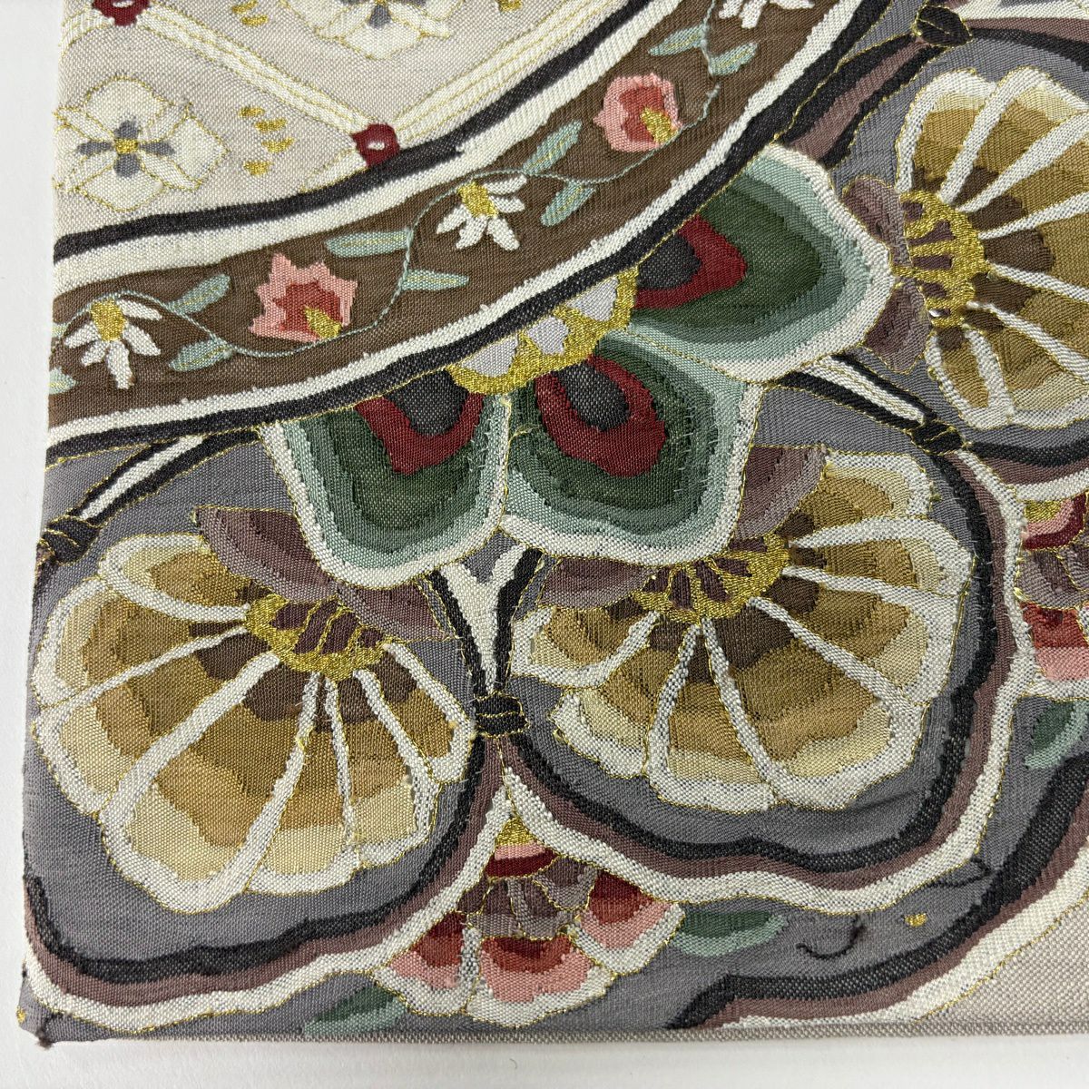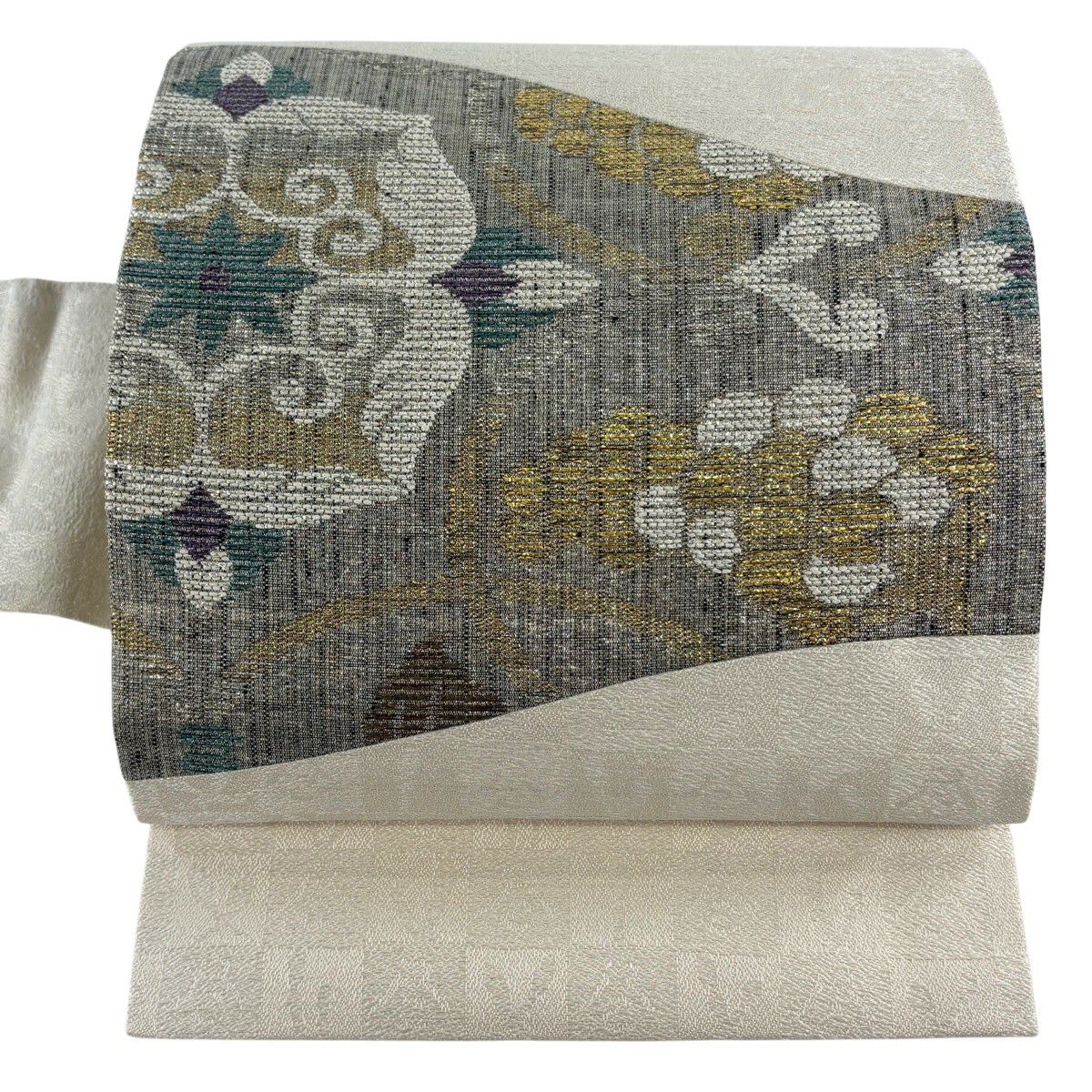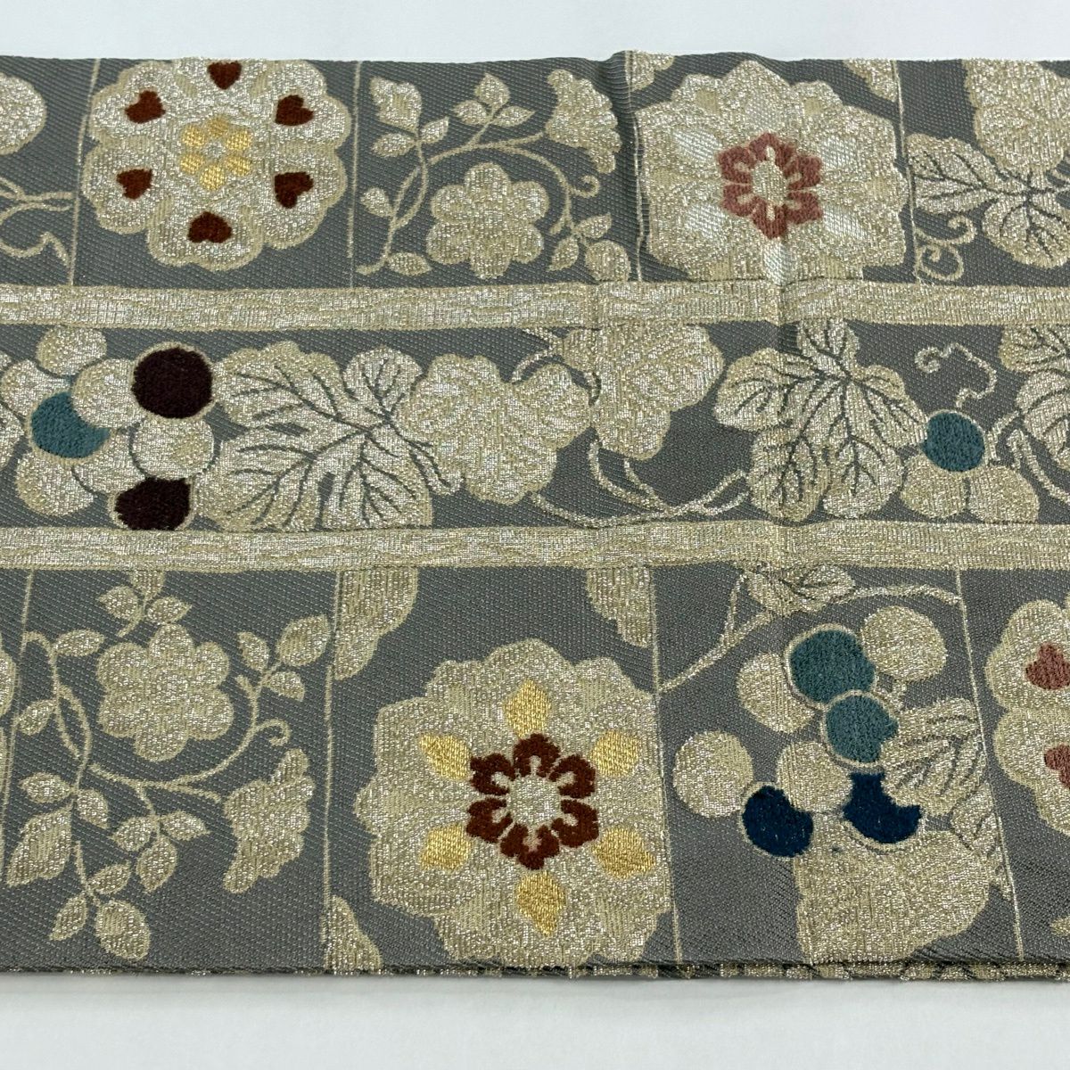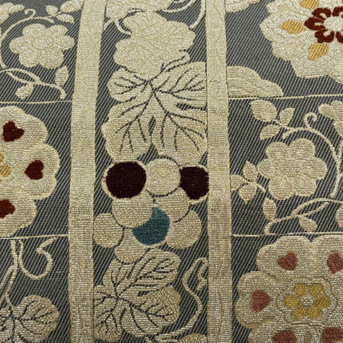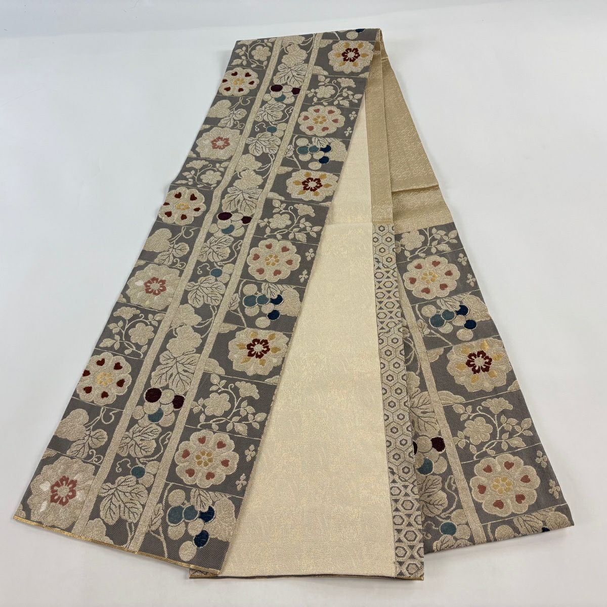 【美品】 名古屋帯 逸品 華文 葡萄 箔 銀糸 灰色 正絹