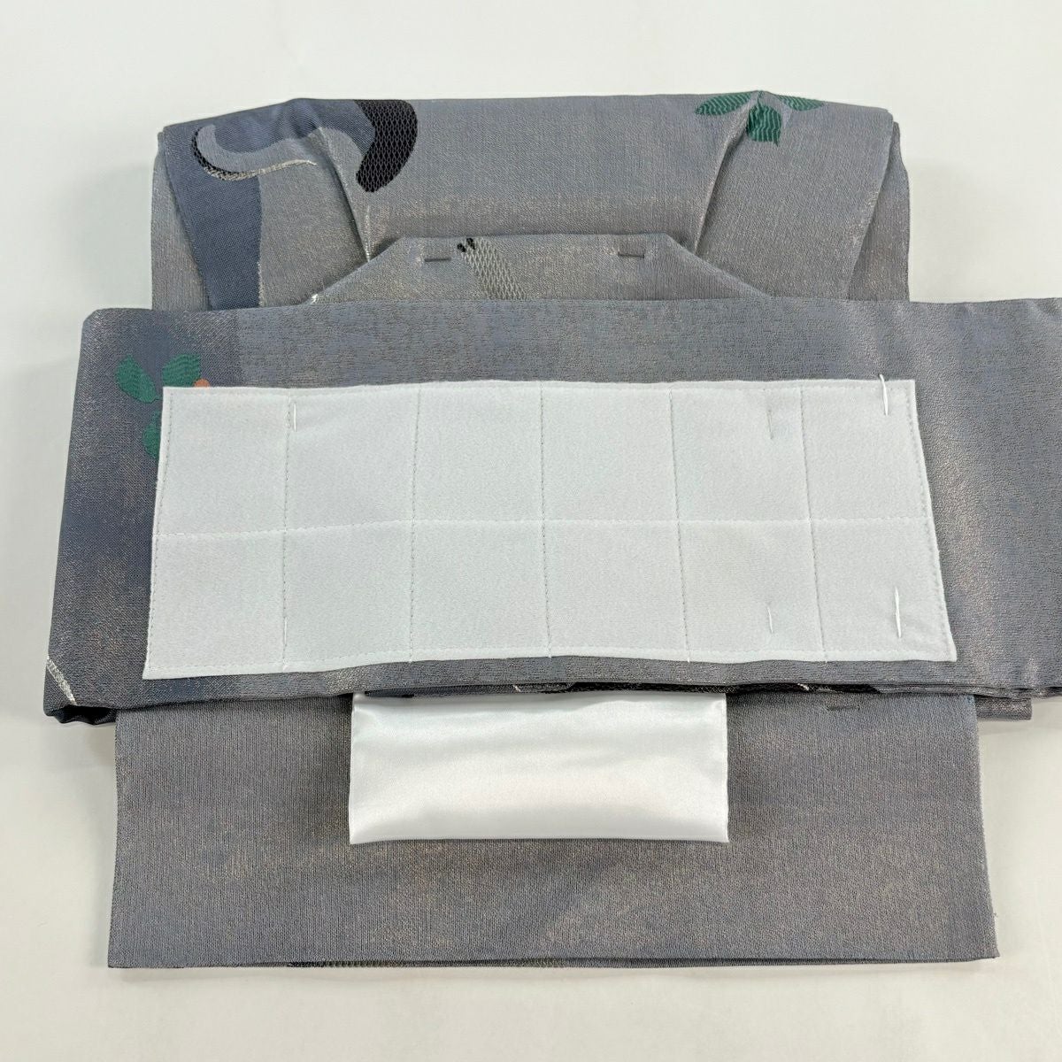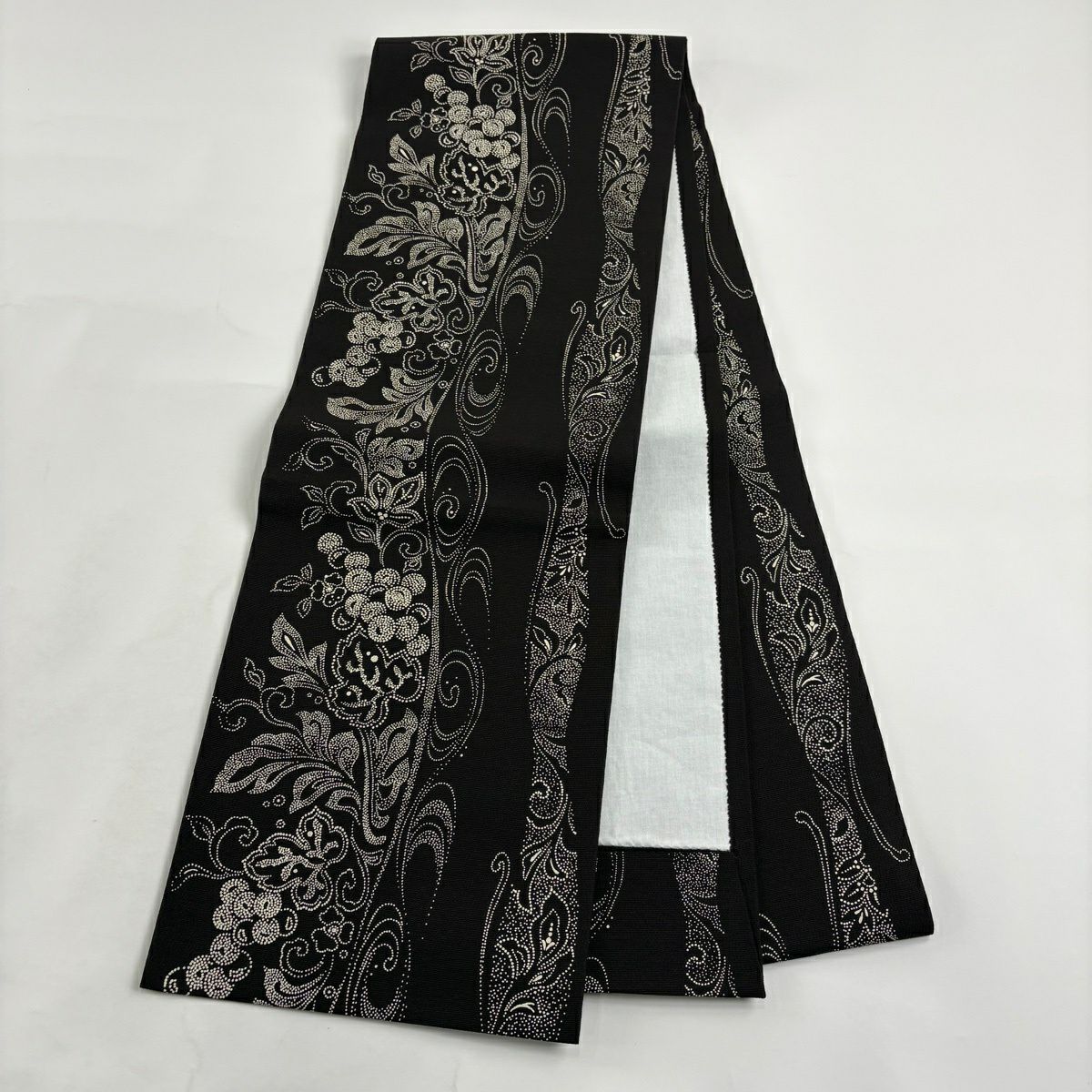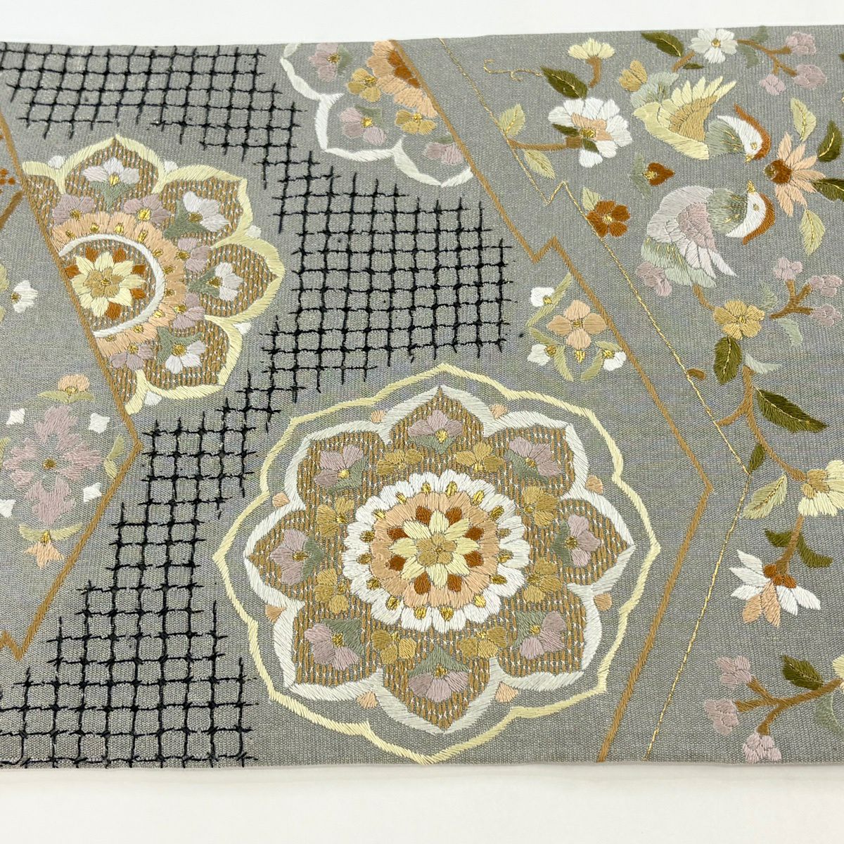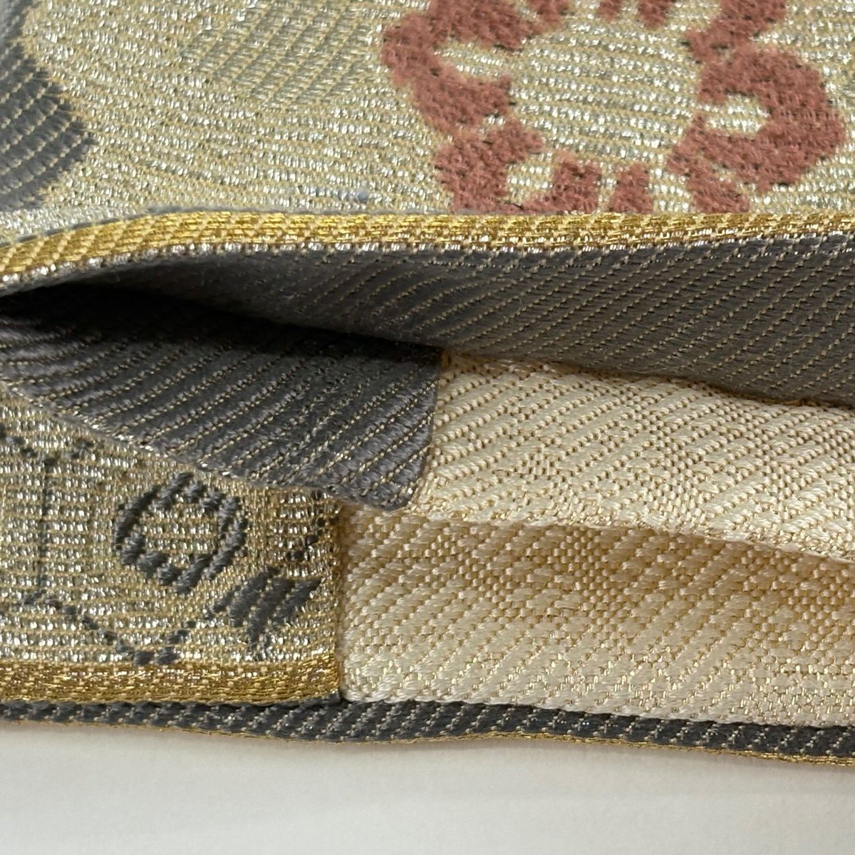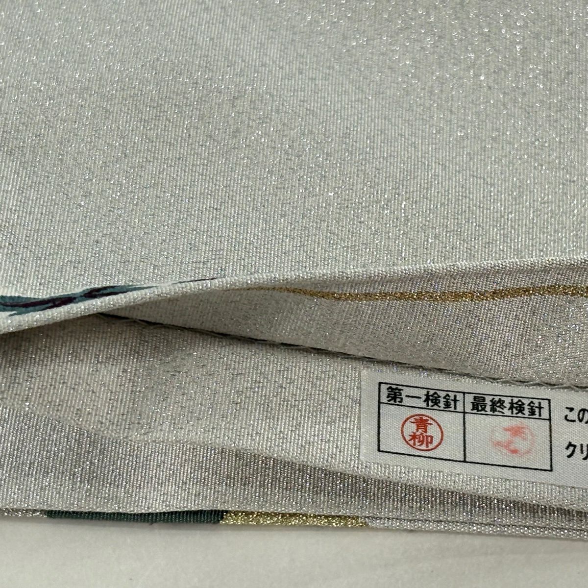 【美品】 名古屋帯 逸品 華文 葡萄 箔 銀糸 灰色 正絹