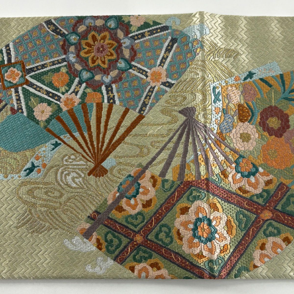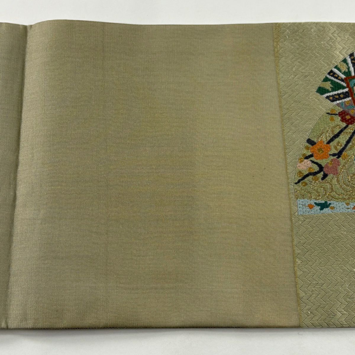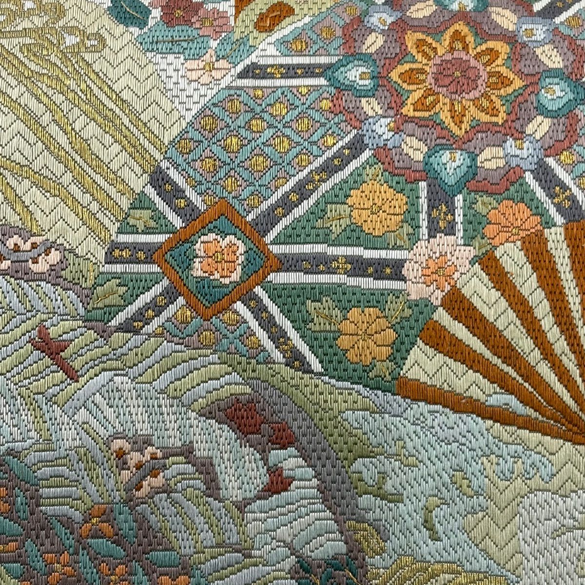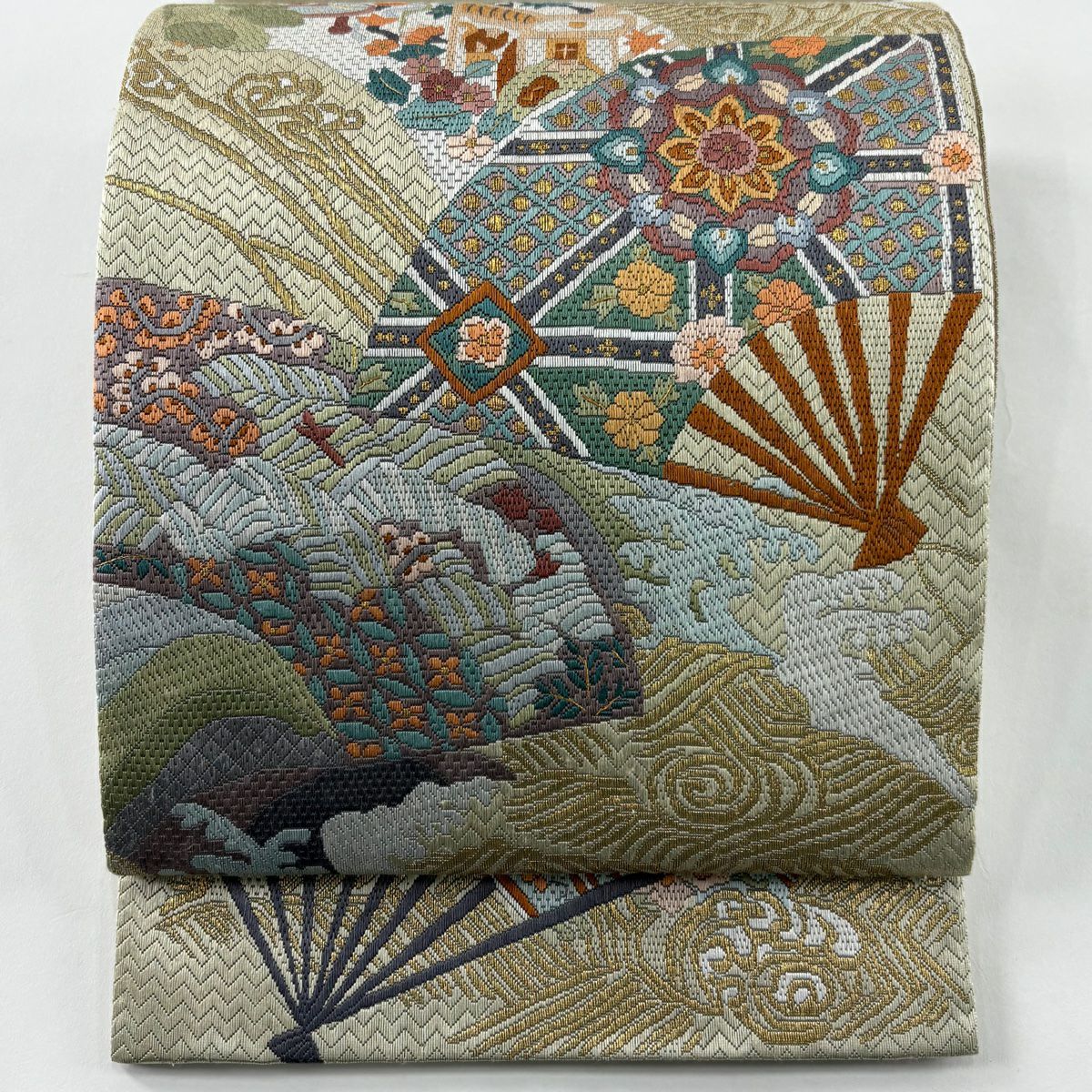 袋帯 逸品 扇 建物 金糸 絽刺し 灰緑 お太鼓柄 正絹