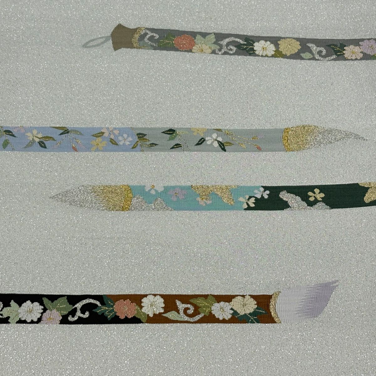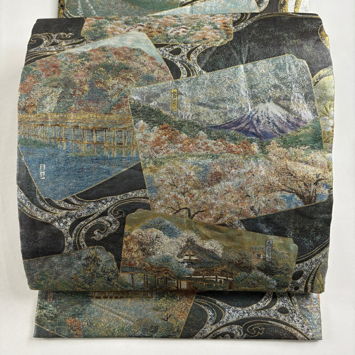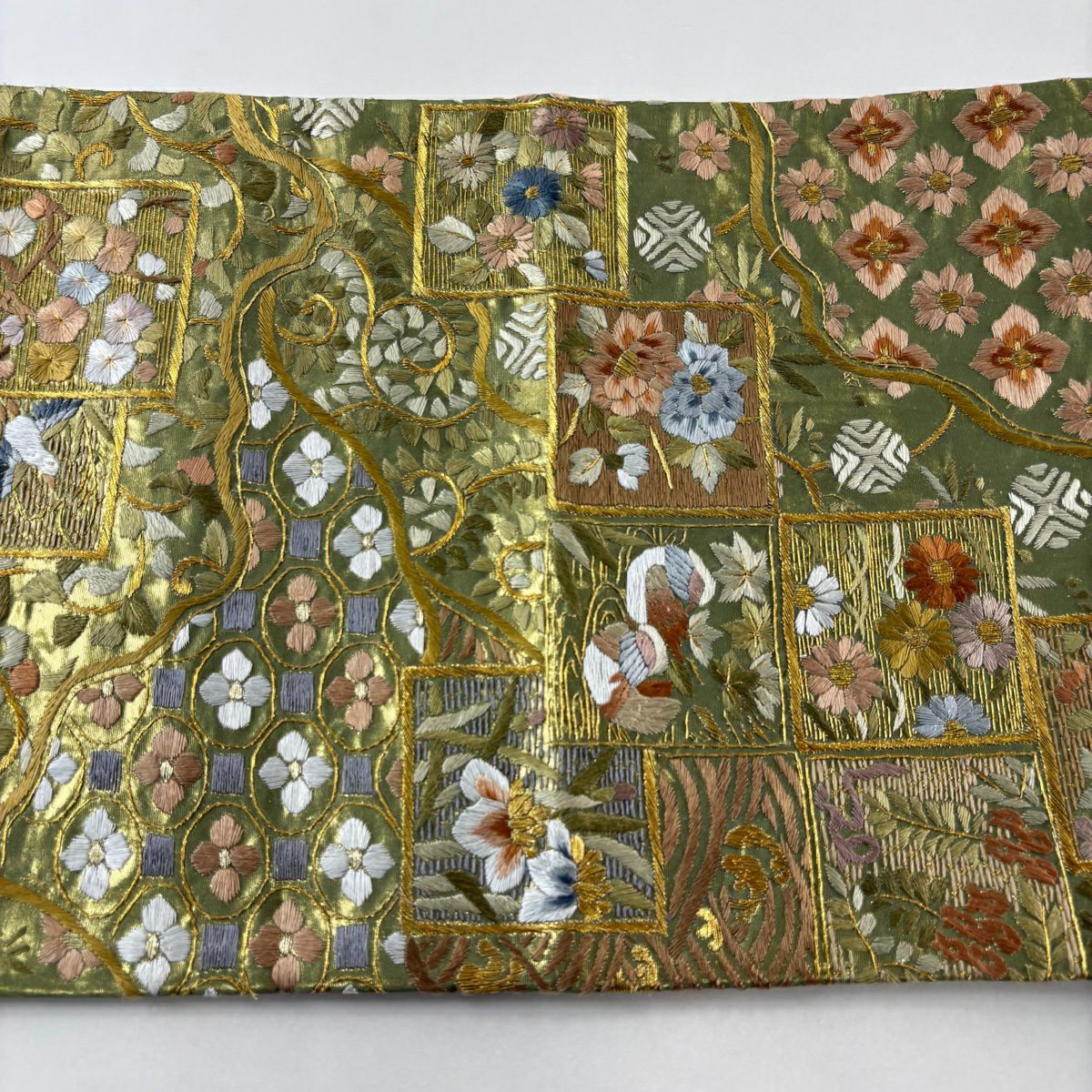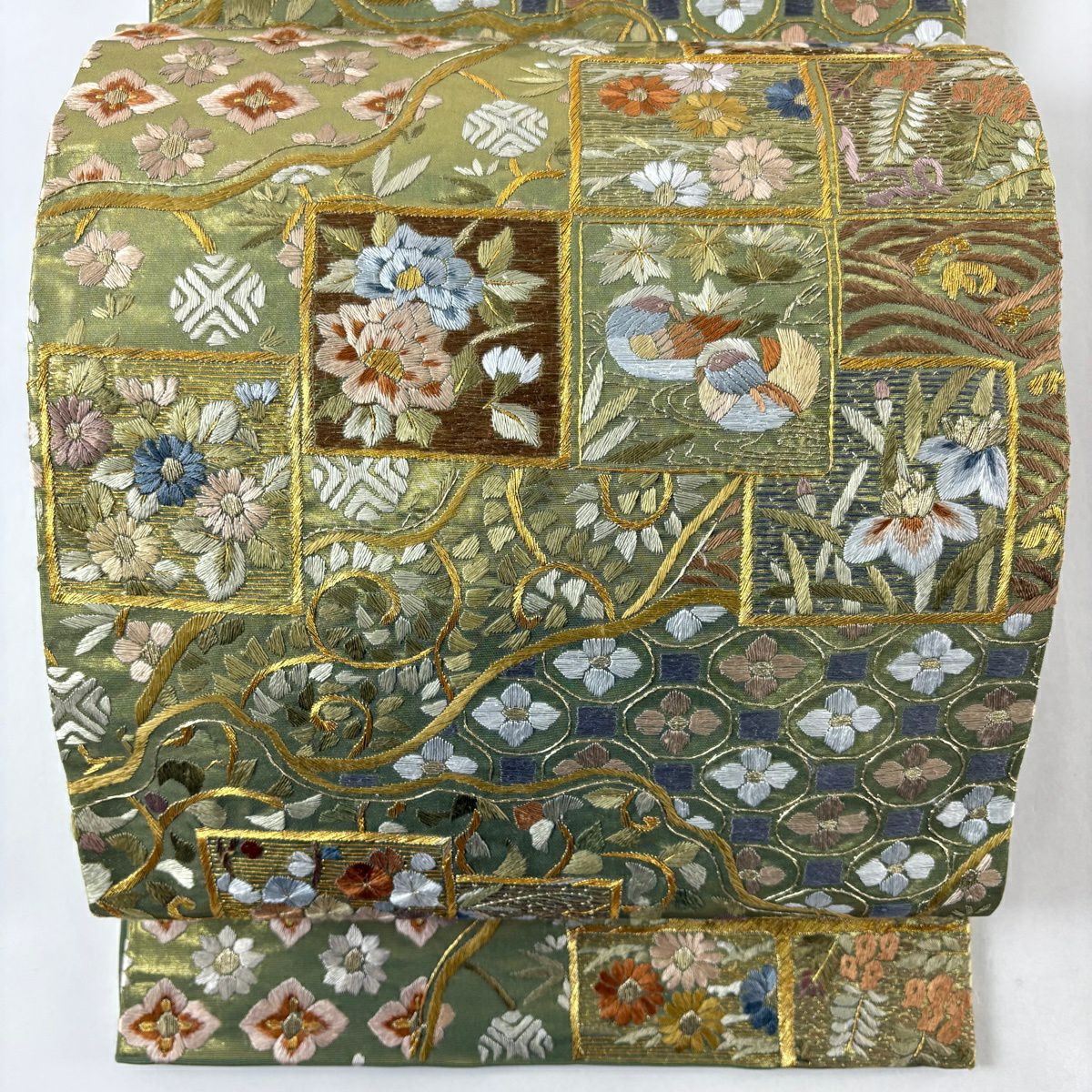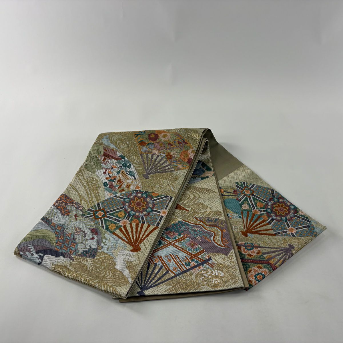 袋帯 逸品 扇 建物 金糸 絽刺し 灰緑 お太鼓柄 正絹