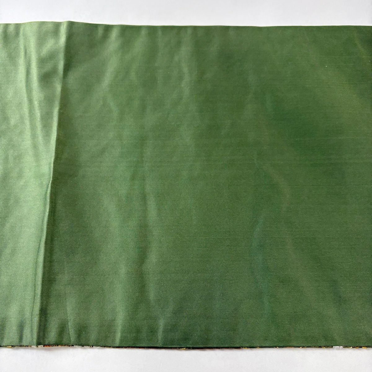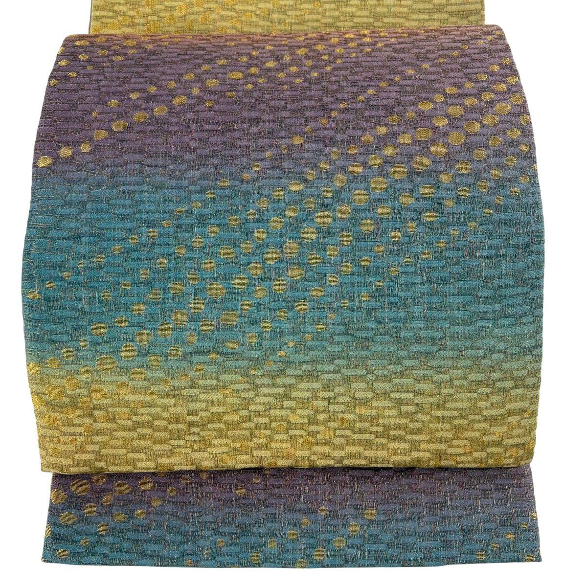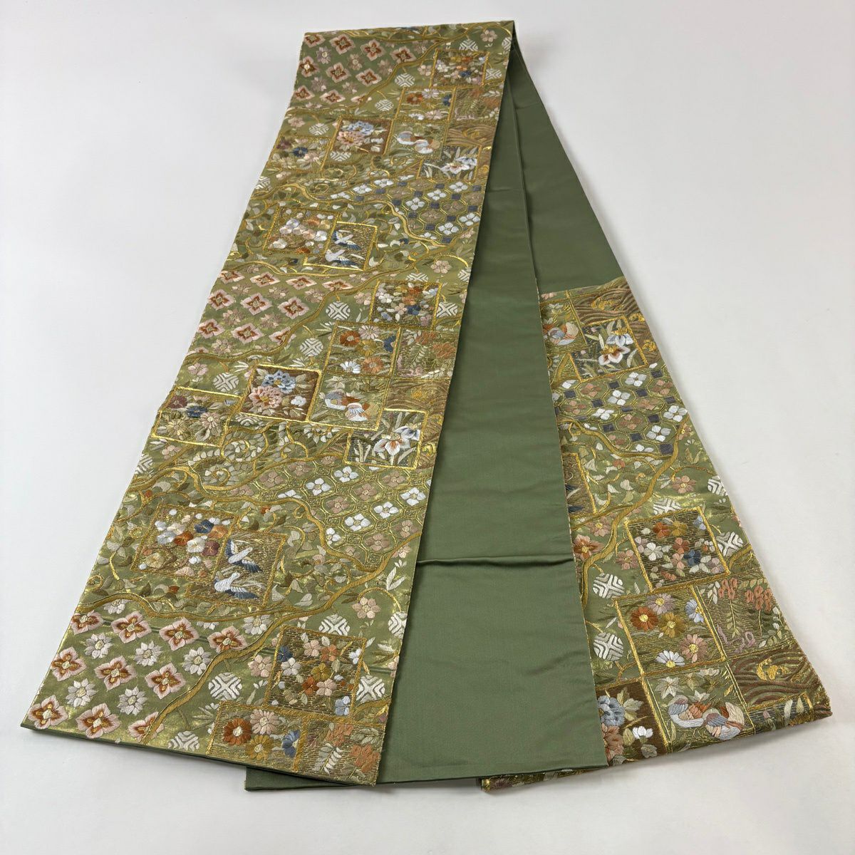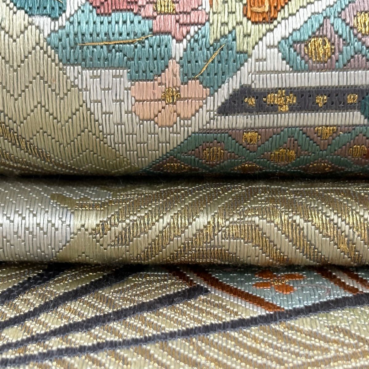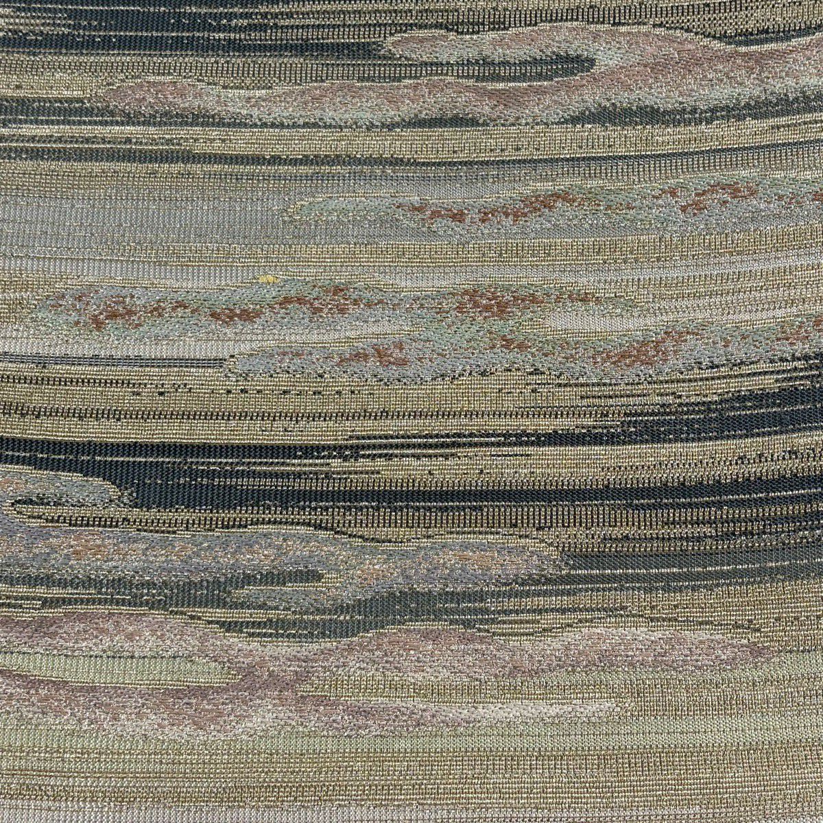 袋帯 逸品 夏帯 幾何学模様 金彩 茶緑色 お太鼓柄 正絹