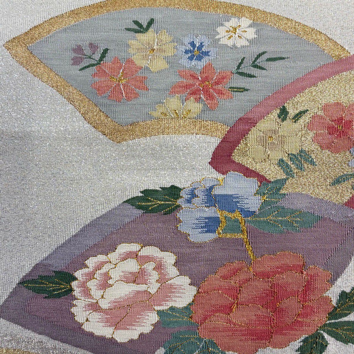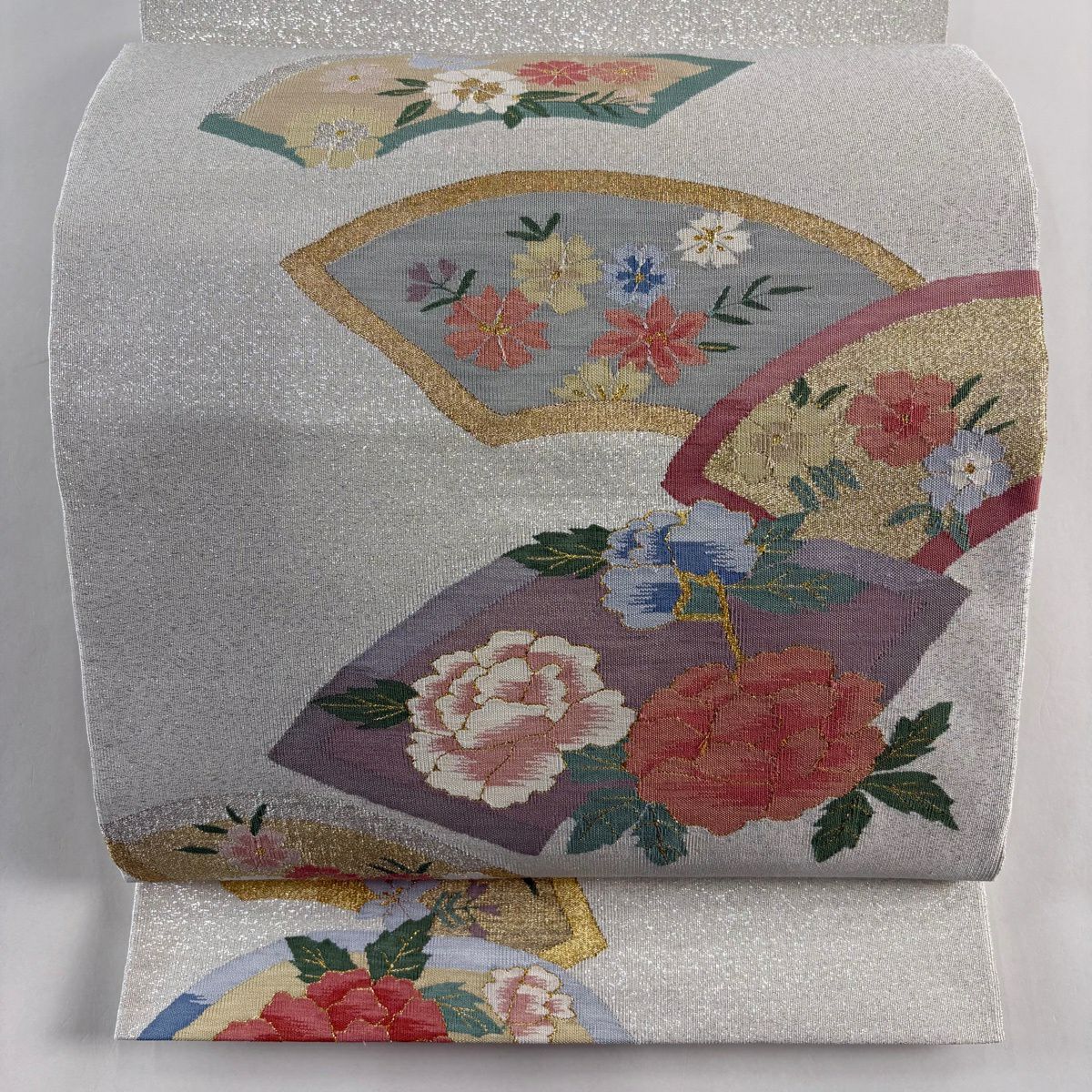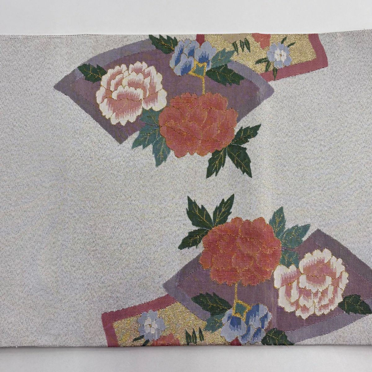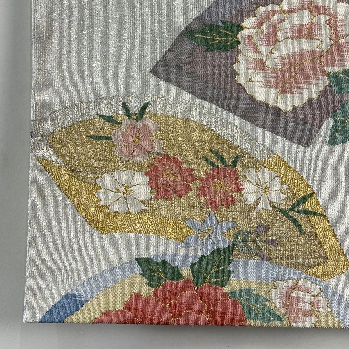 袋帯 逸品 牡丹 扇面 金銀糸 箔 銀色 お太鼓柄 正絹