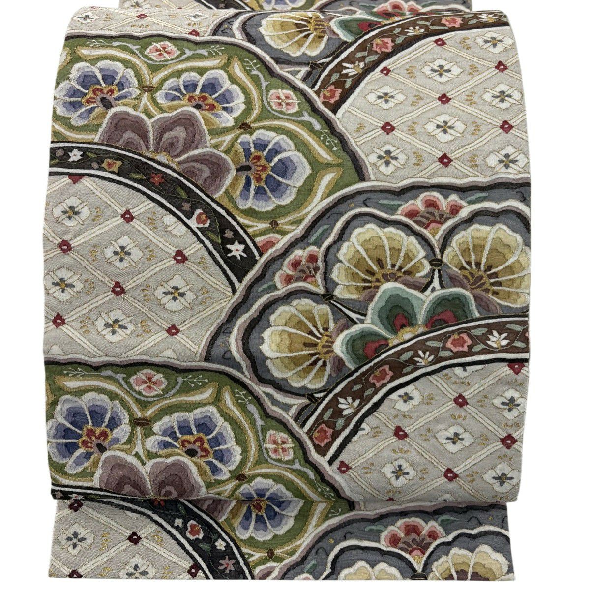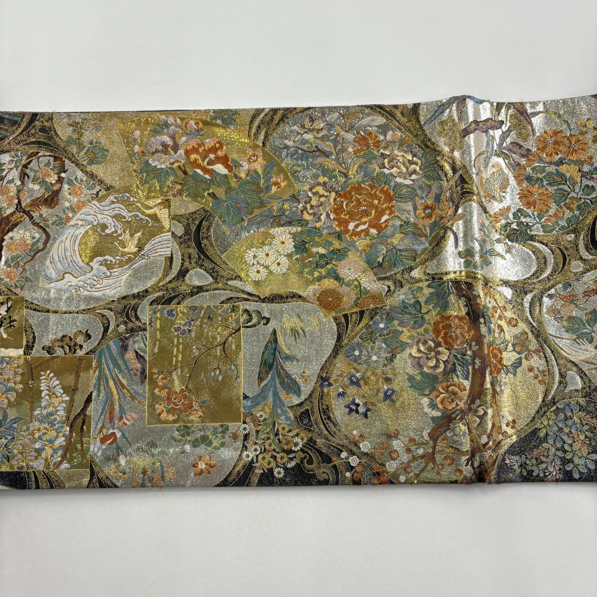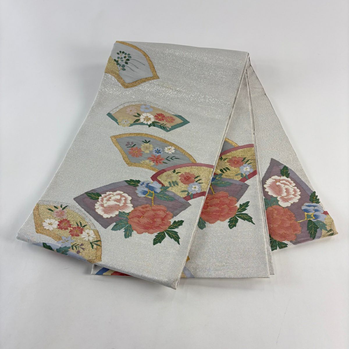 袋帯 逸品 牡丹 扇面 金銀糸 箔 銀色 お太鼓柄 正絹