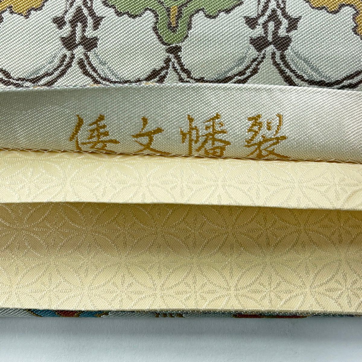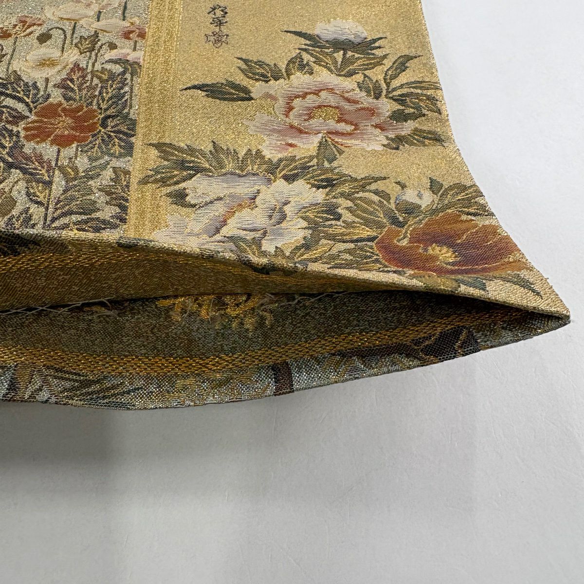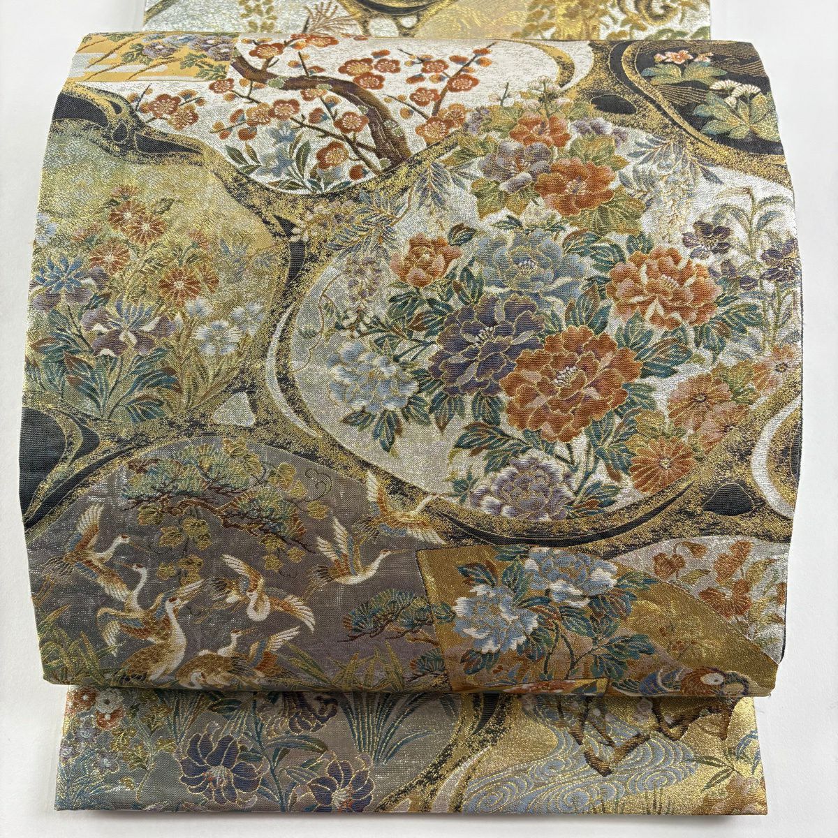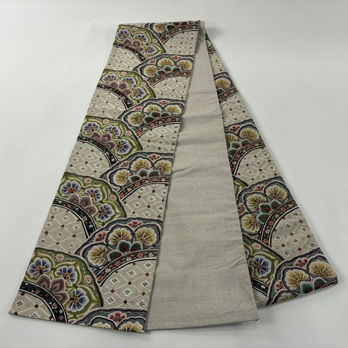 袋帯 逸品 牡丹 扇面 金銀糸 箔 銀色 お太鼓柄 正絹