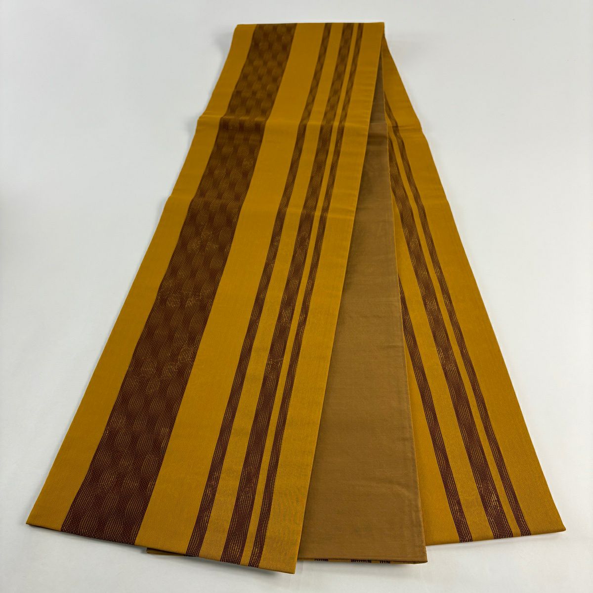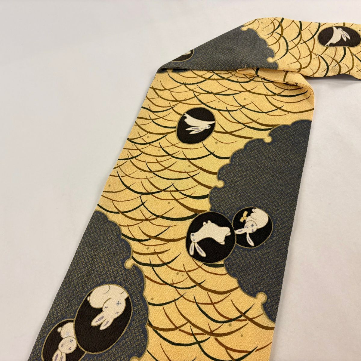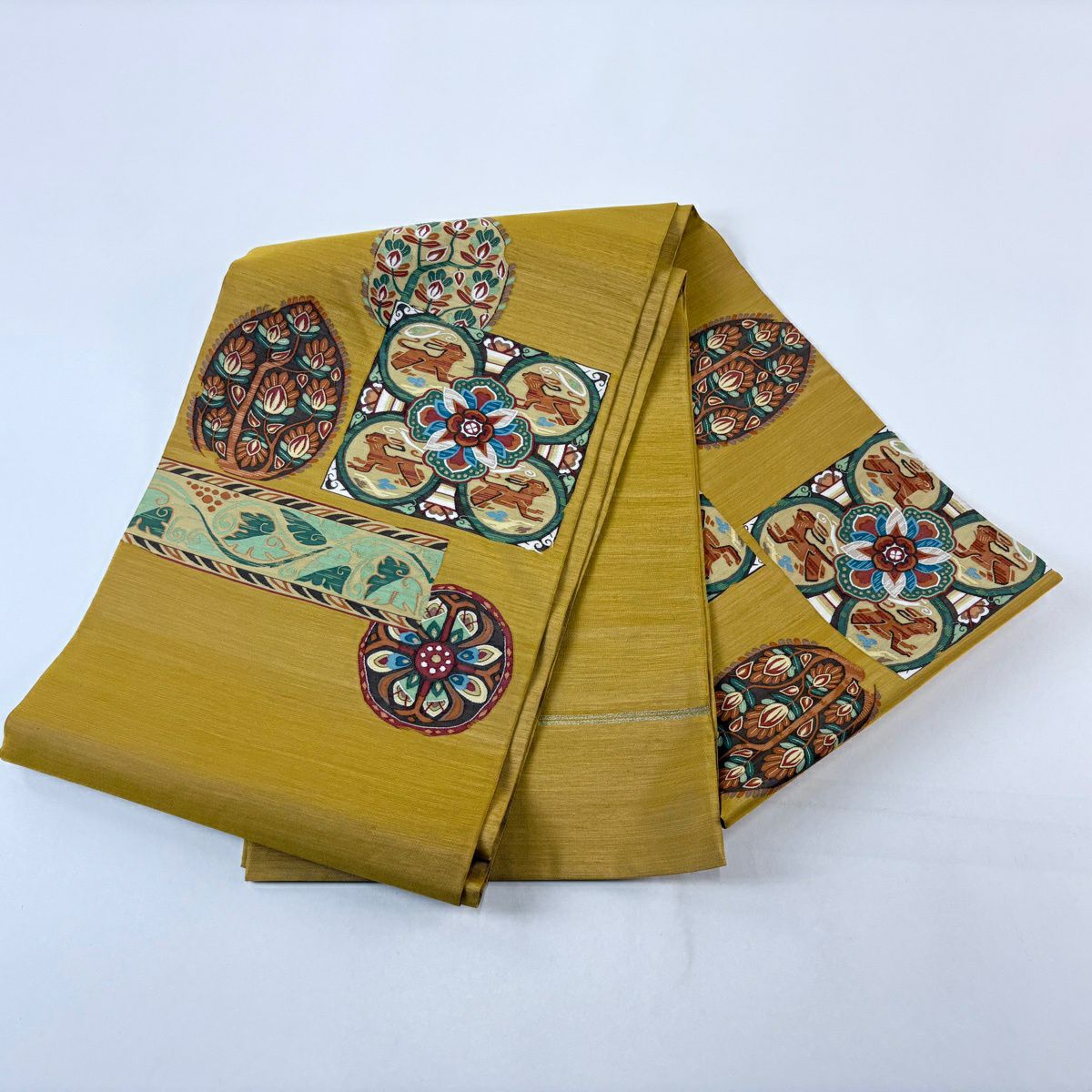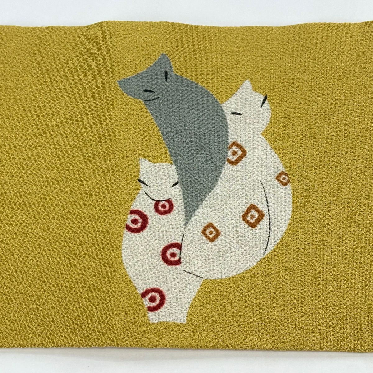 【美品】 名古屋帯 逸品 猫 幾何学 縮緬 からし色 正絹
