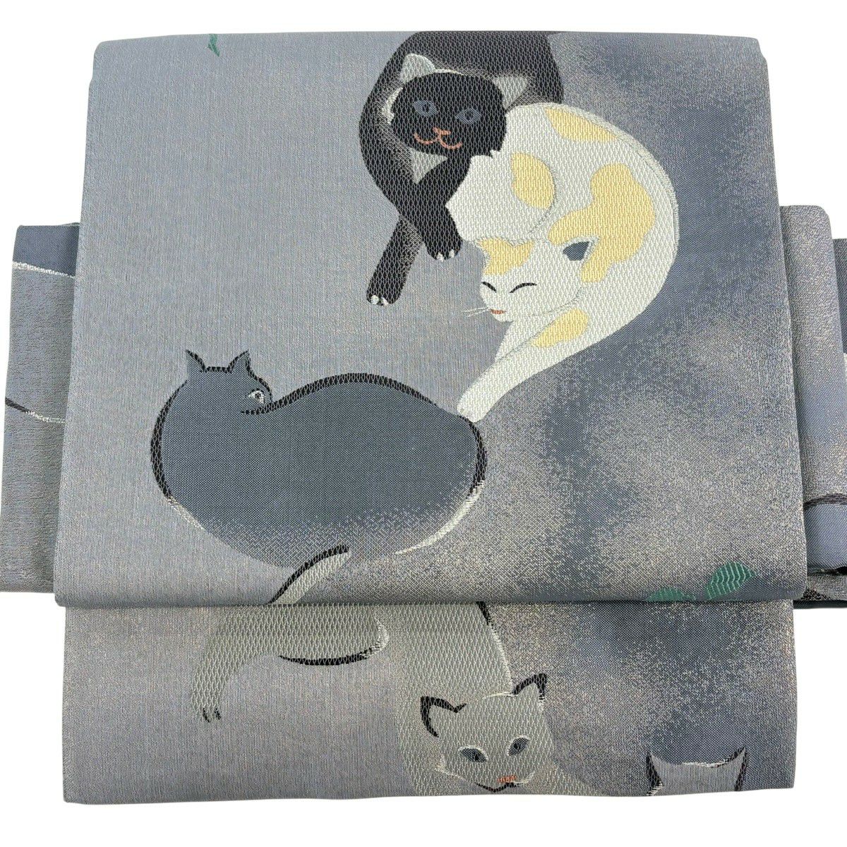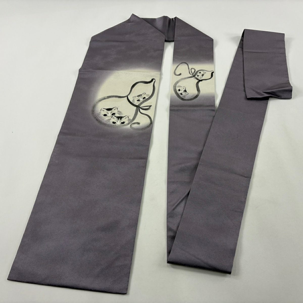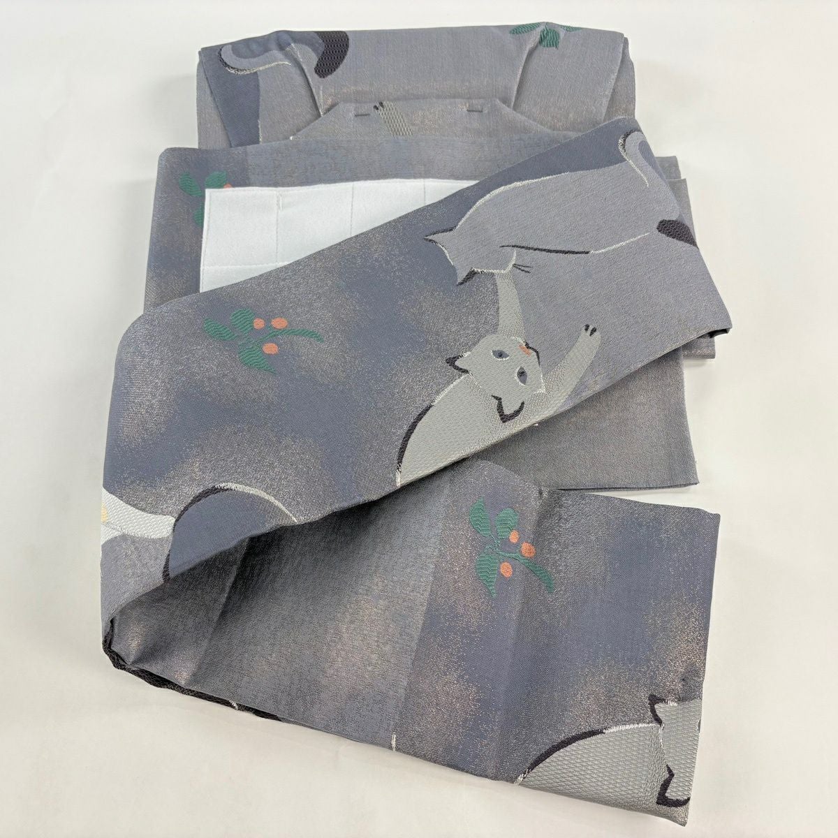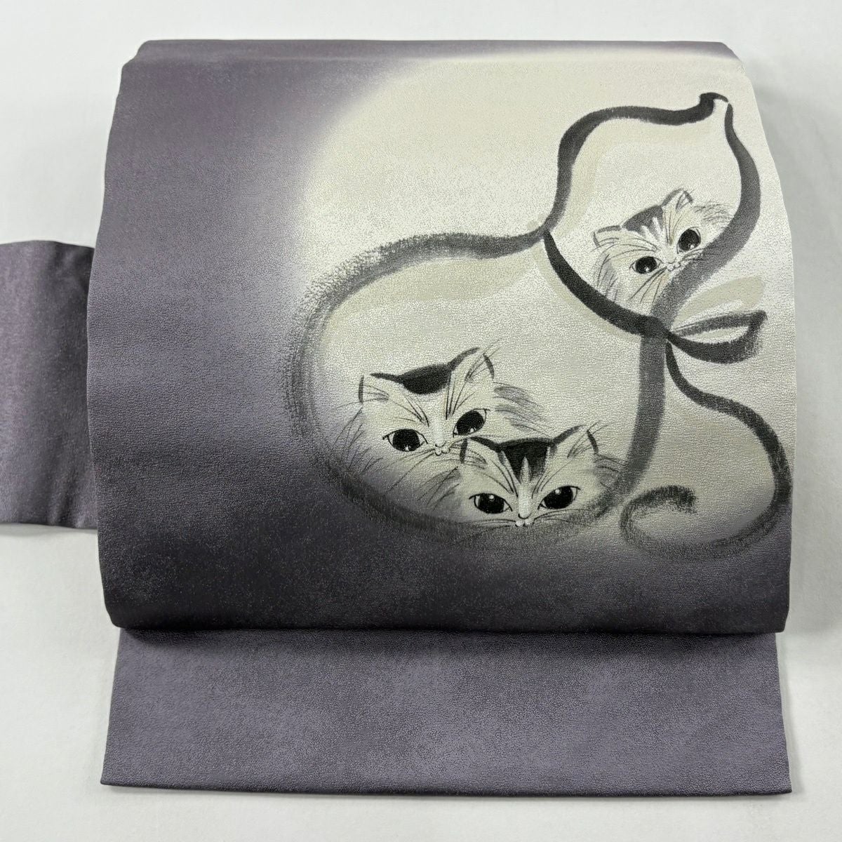 【美品】 名古屋帯 逸品 猫 瓢箪 銀通し 銀彩 紫 正絹