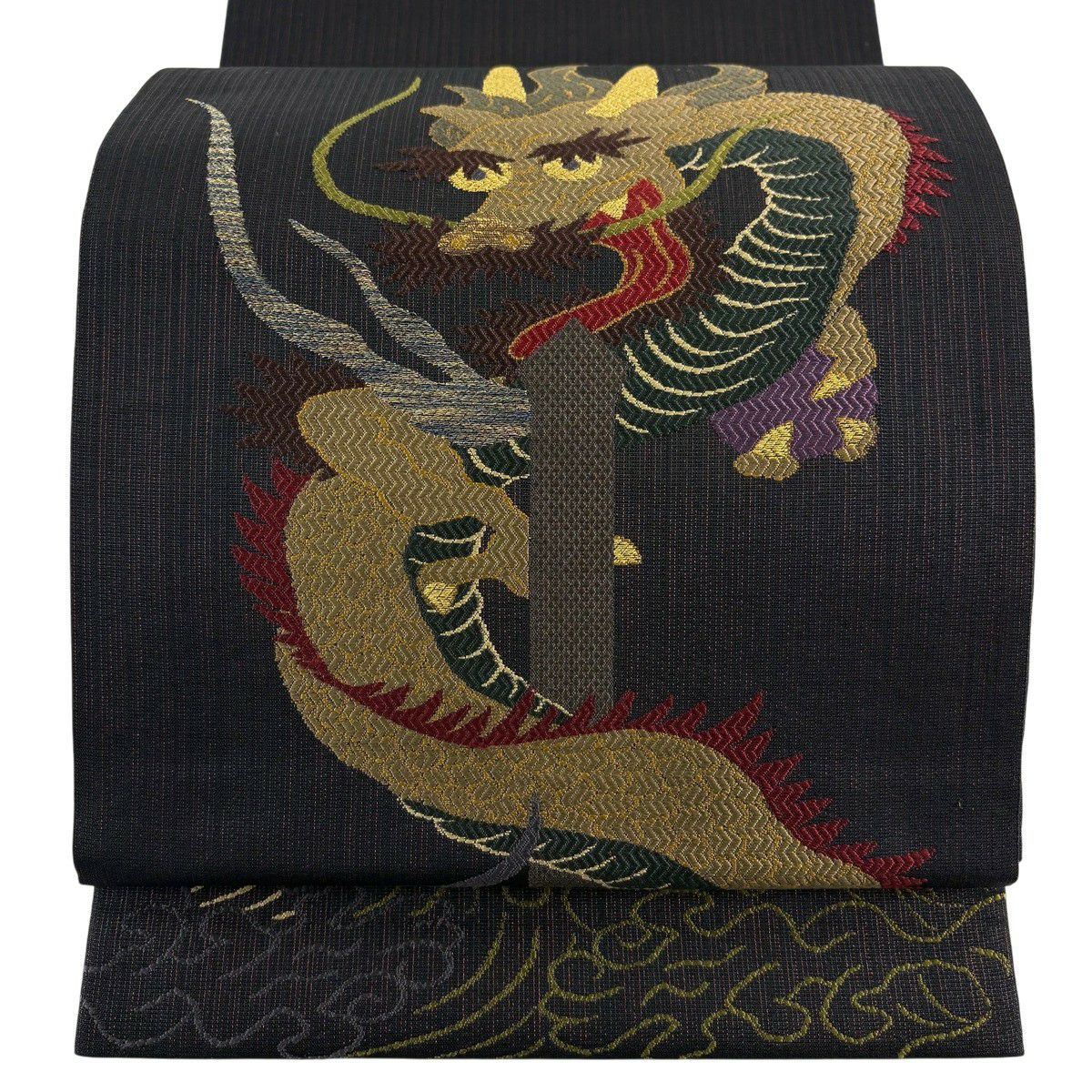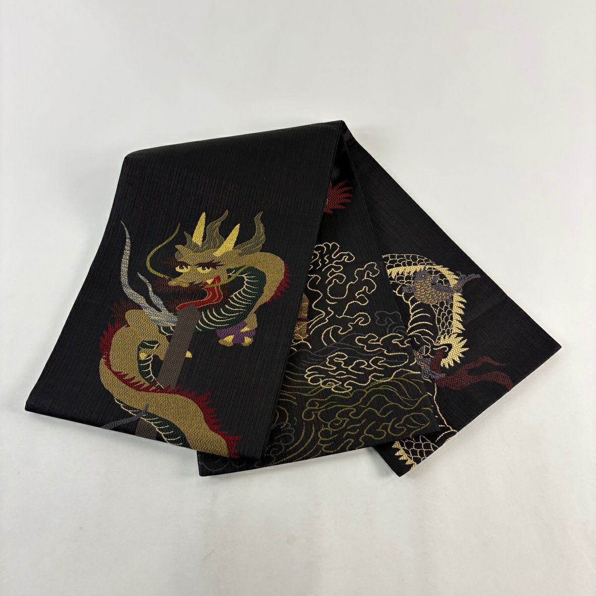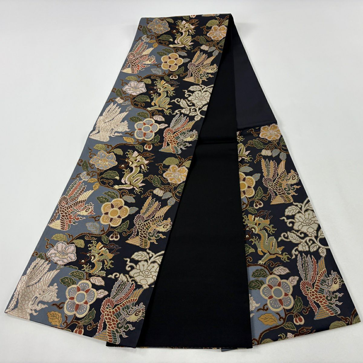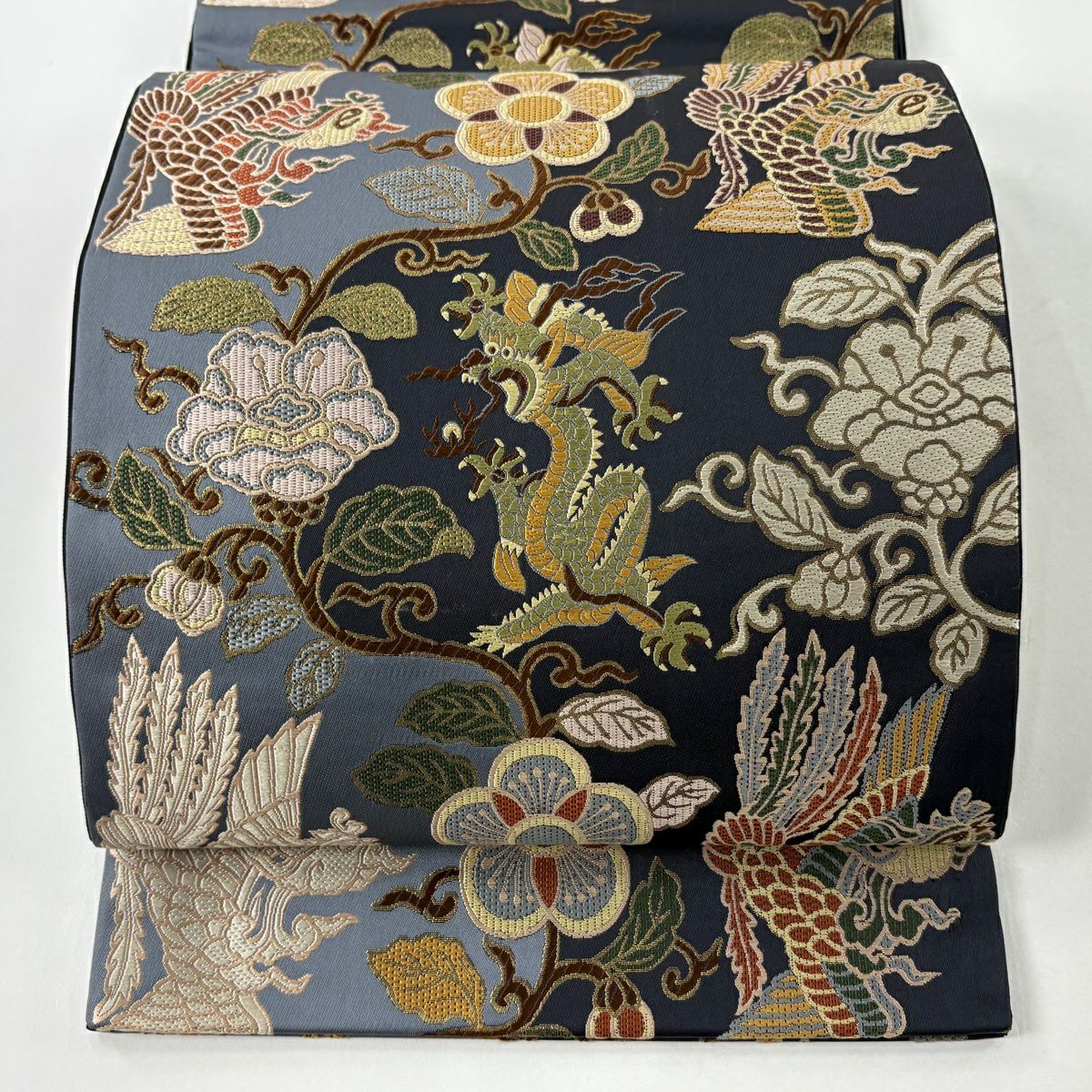【美品】 袋帯 逸品 龍 花鳥 箔 刺繍 黒 六通 正絹