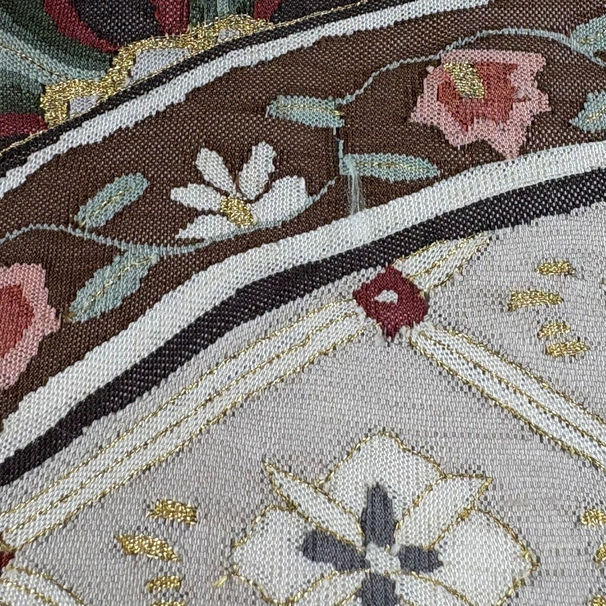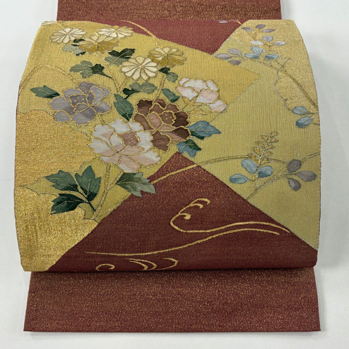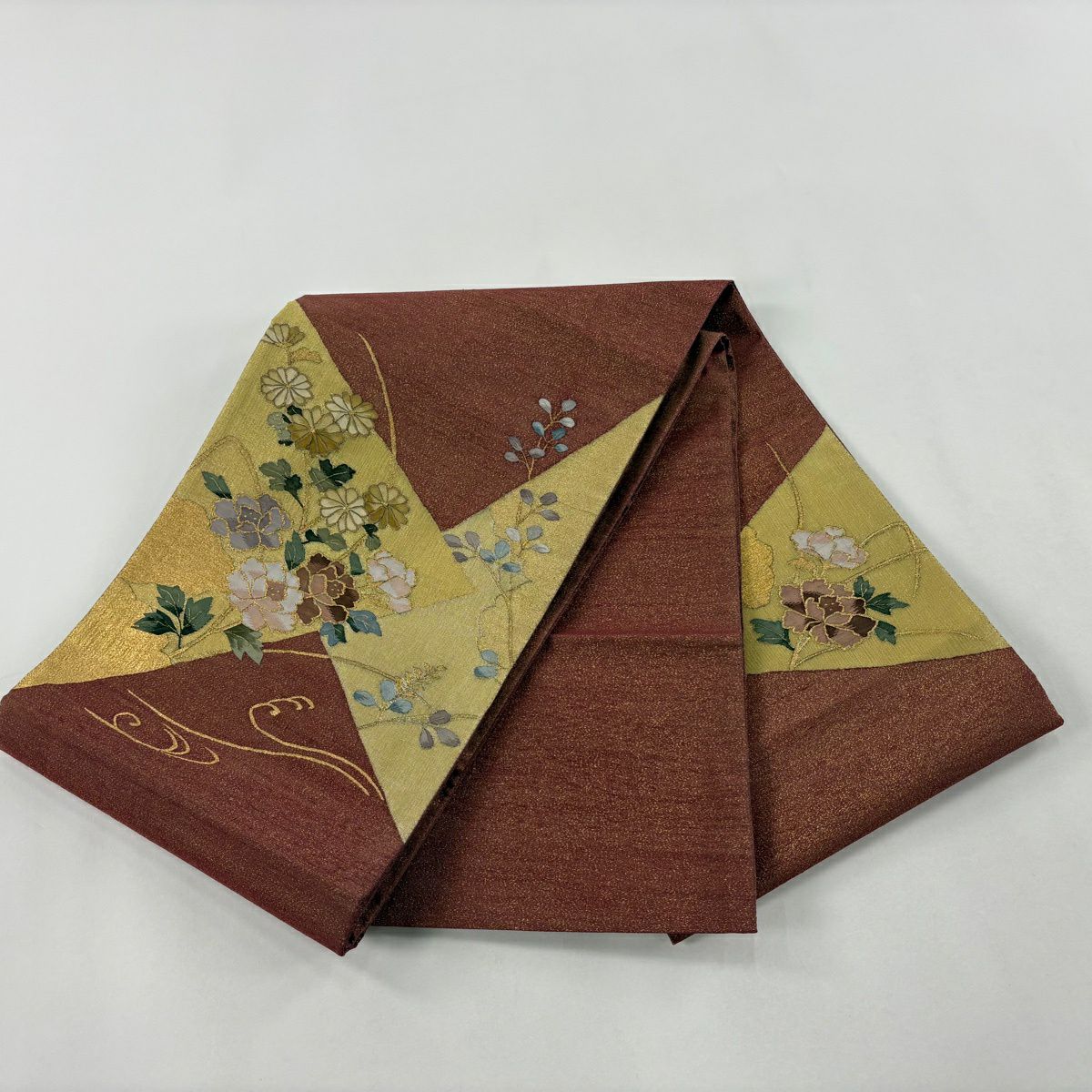 袋帯 逸品 草花 流水 金糸 綴れ 赤茶 お太鼓柄 正絹