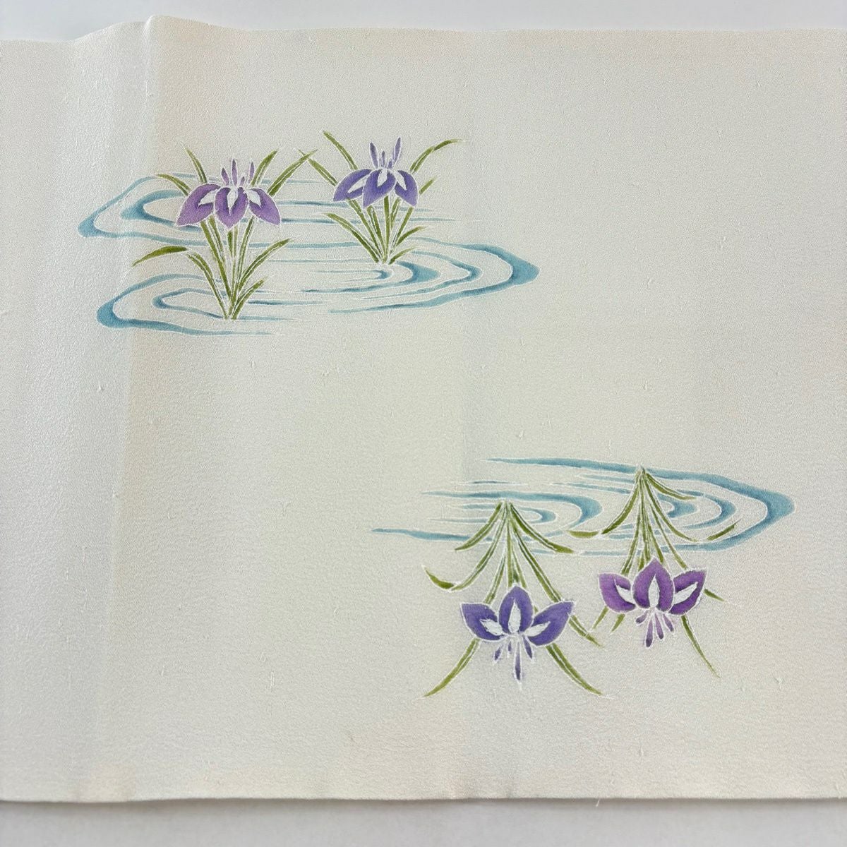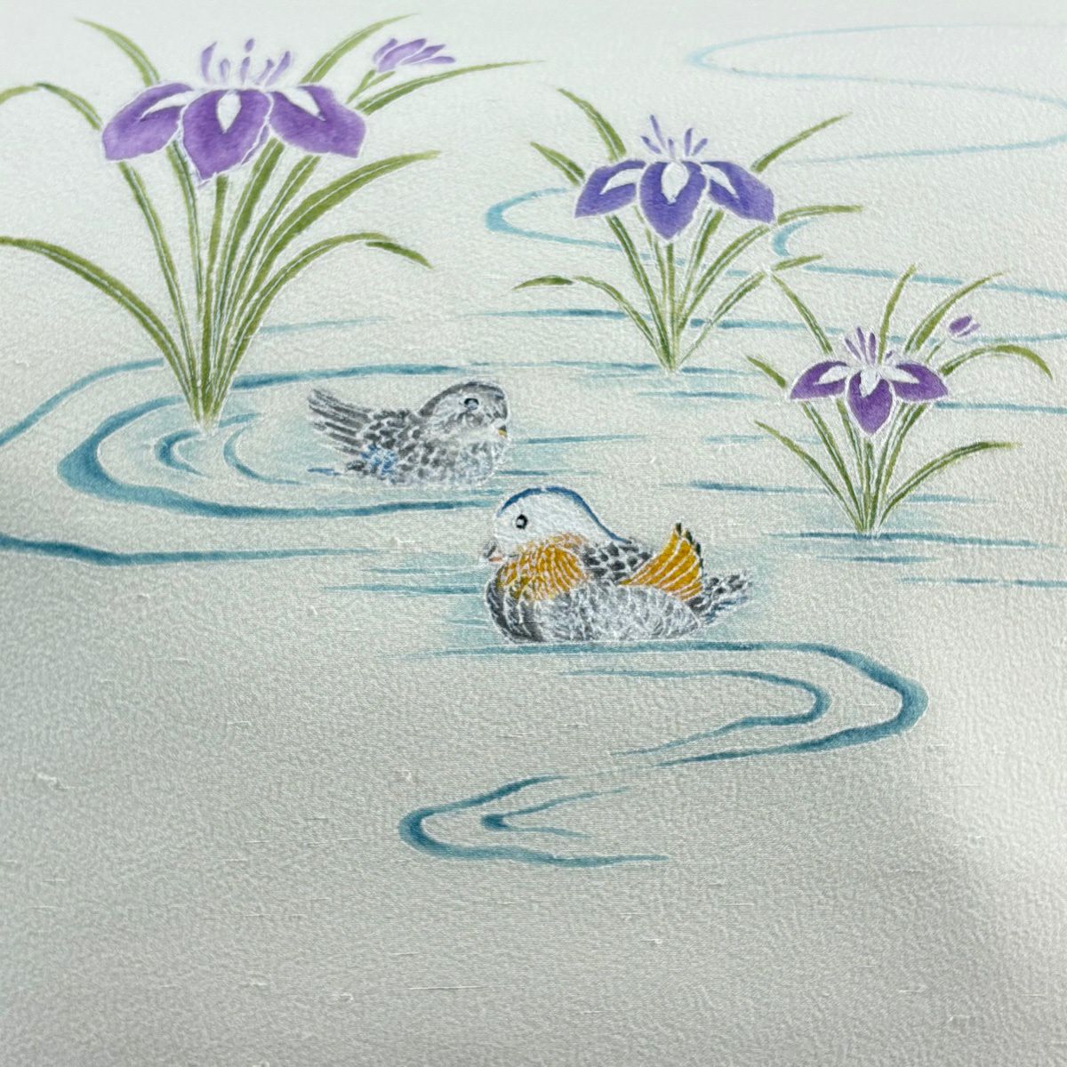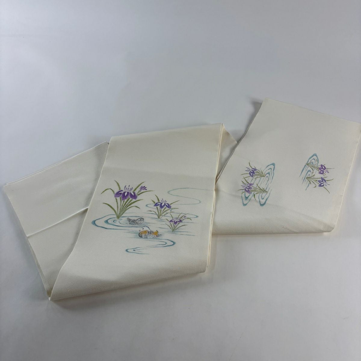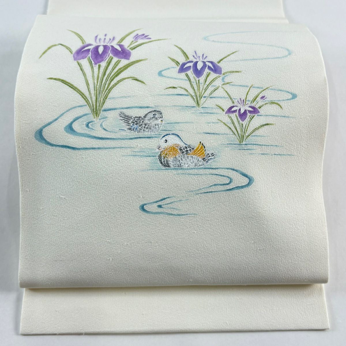 開き名古屋帯 逸品 落款あり 鴛鴦 菖蒲 クリーム 正絹