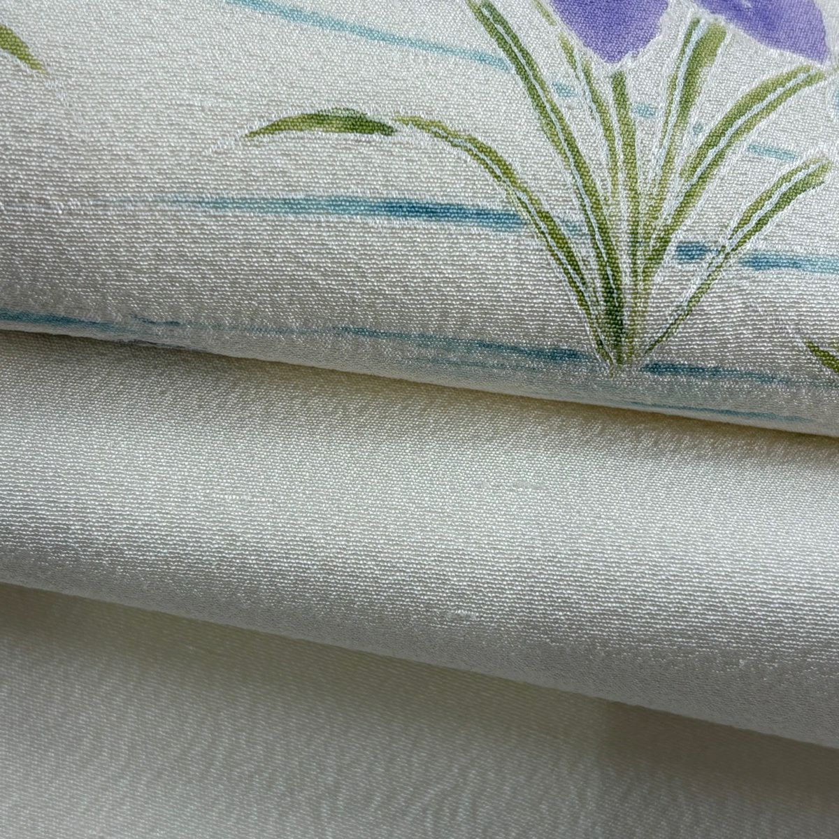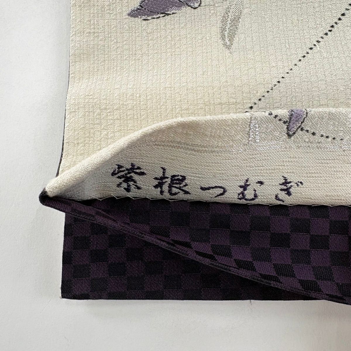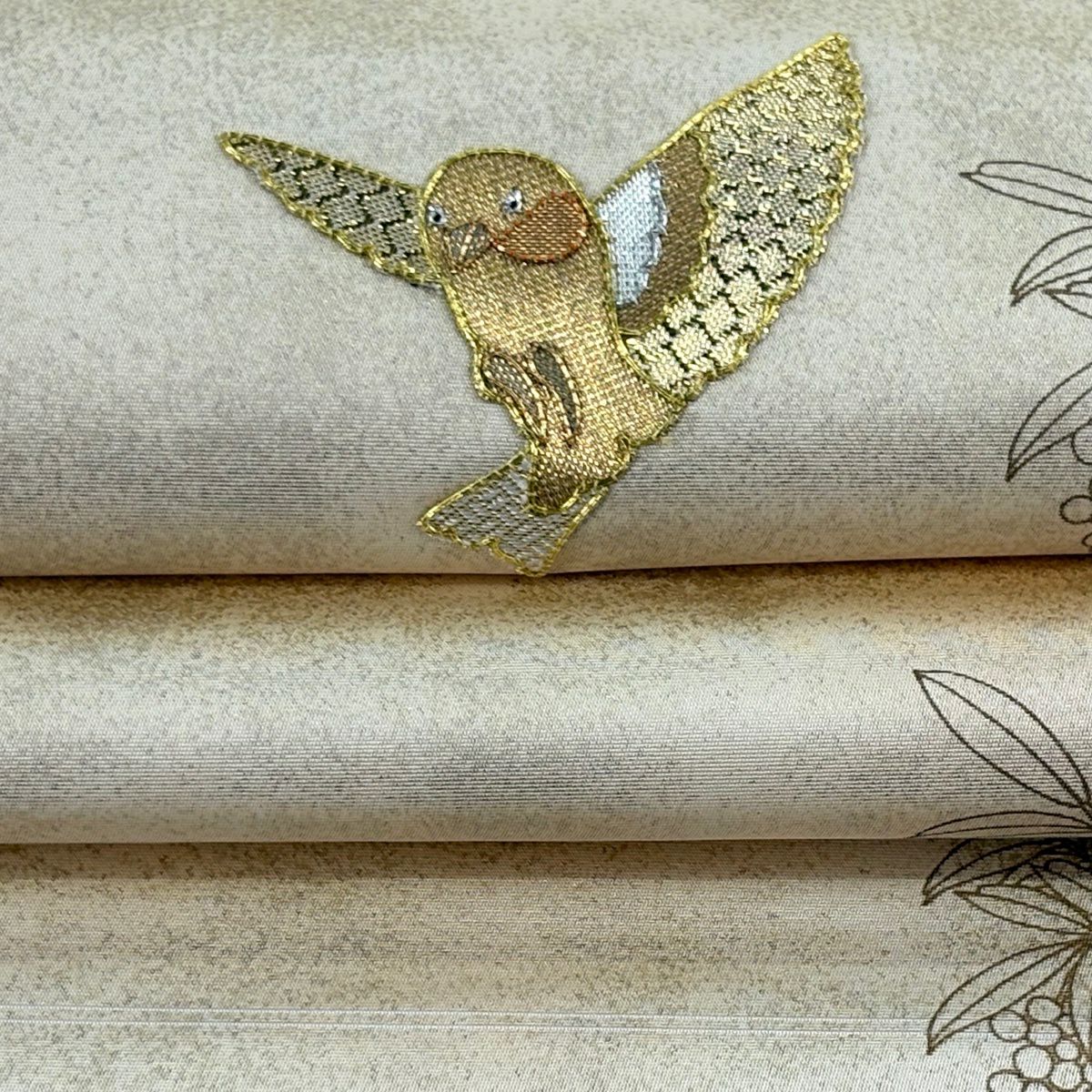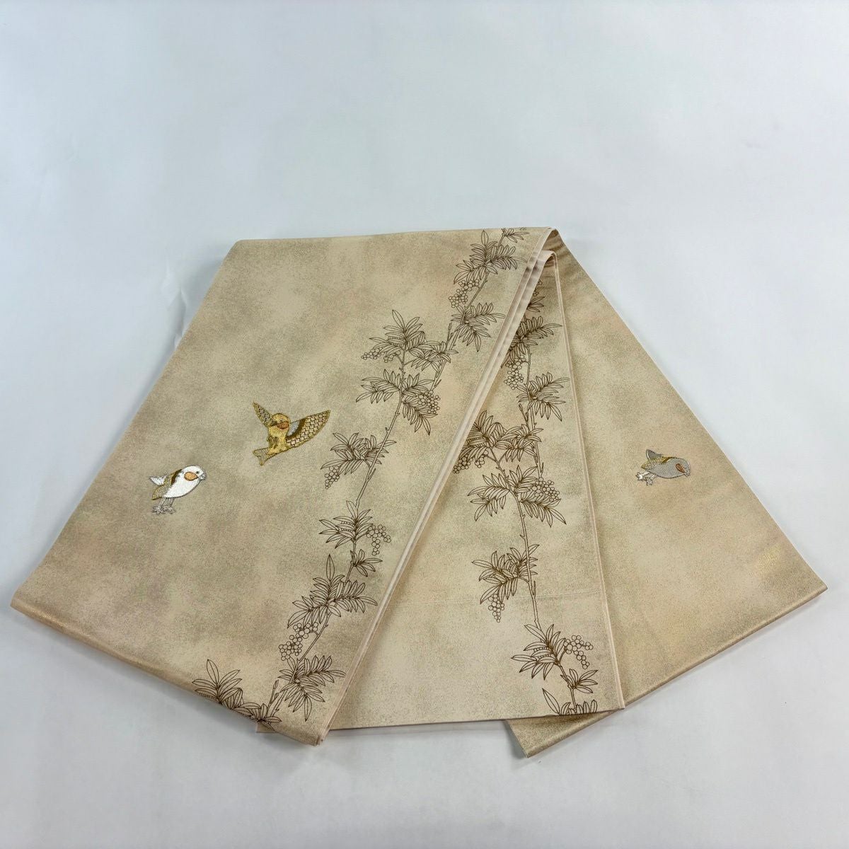 開き名古屋帯 逸品 落款あり 鴛鴦 菖蒲 クリーム 正絹