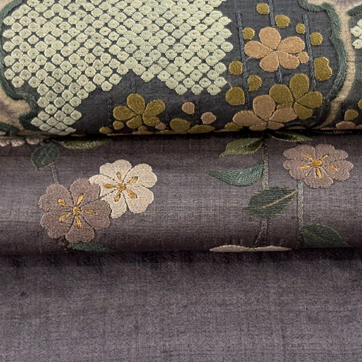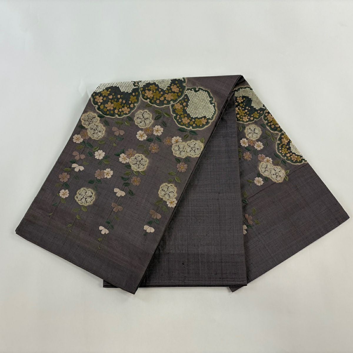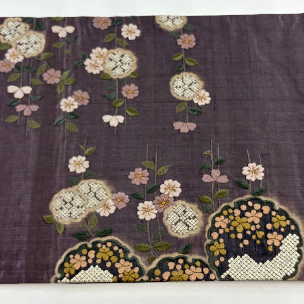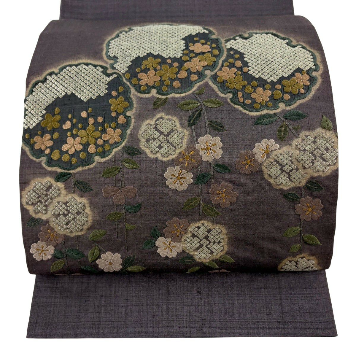 【美品】 袋帯 逸品 雪輪 桜 刺繍 灰紫 お太鼓柄 正絹