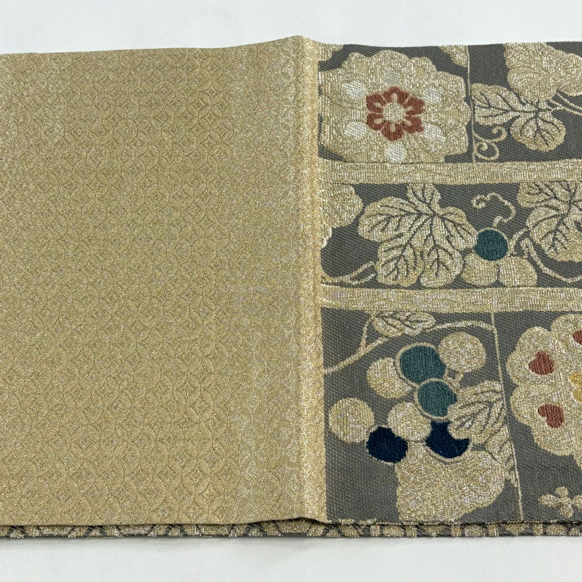 【美品】 袋帯 逸品 華文 葡萄 金銀糸 灰色 六通 正絹