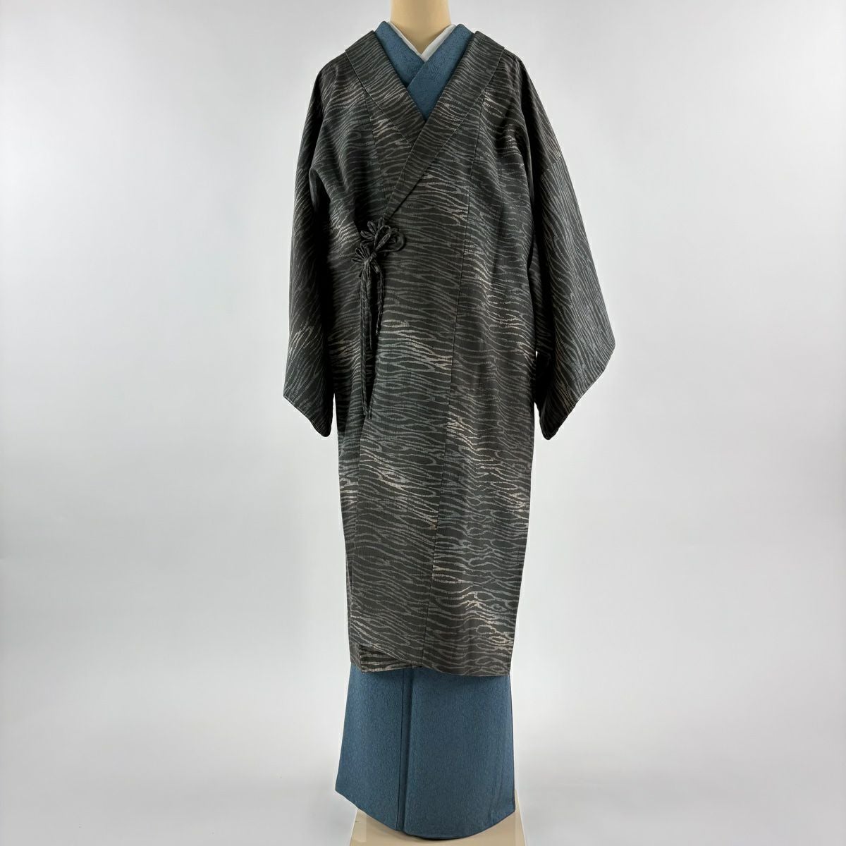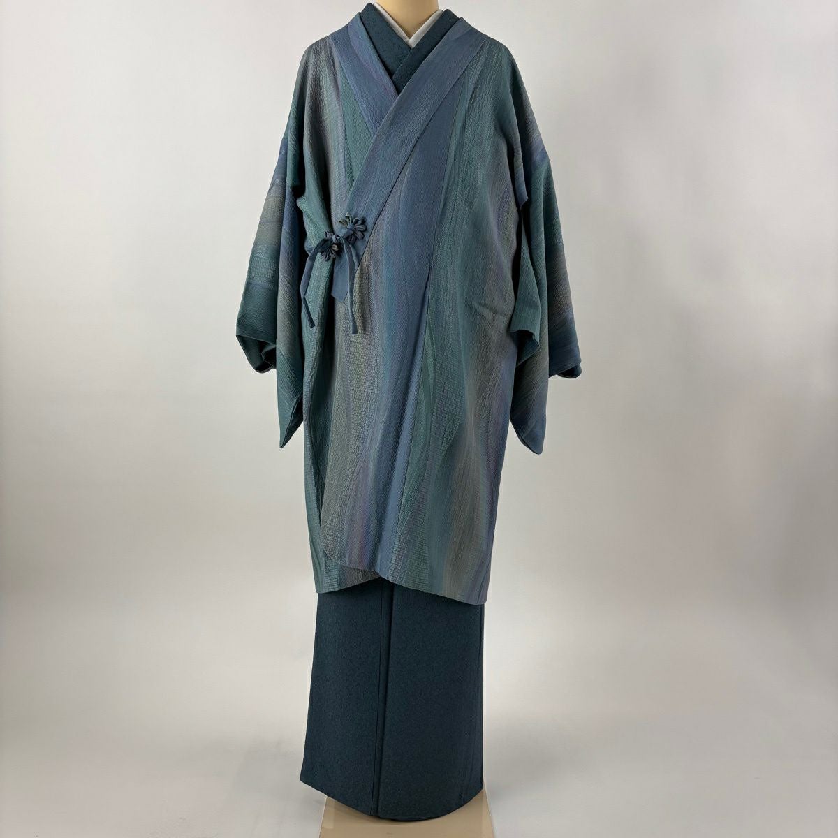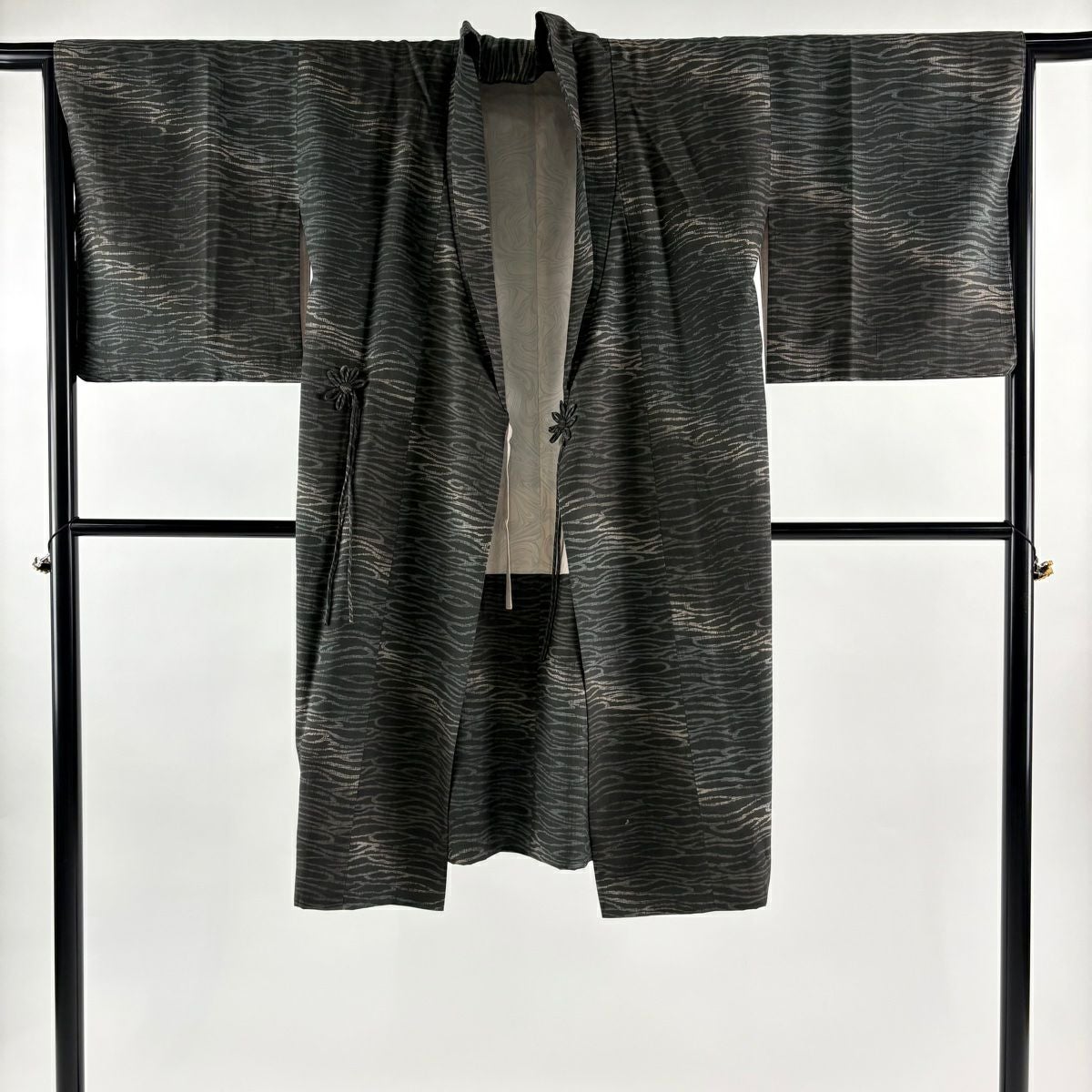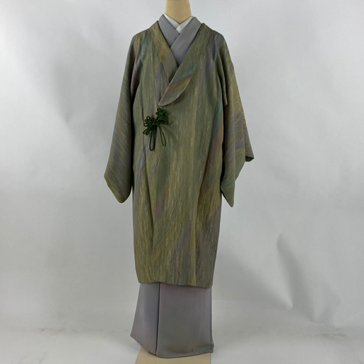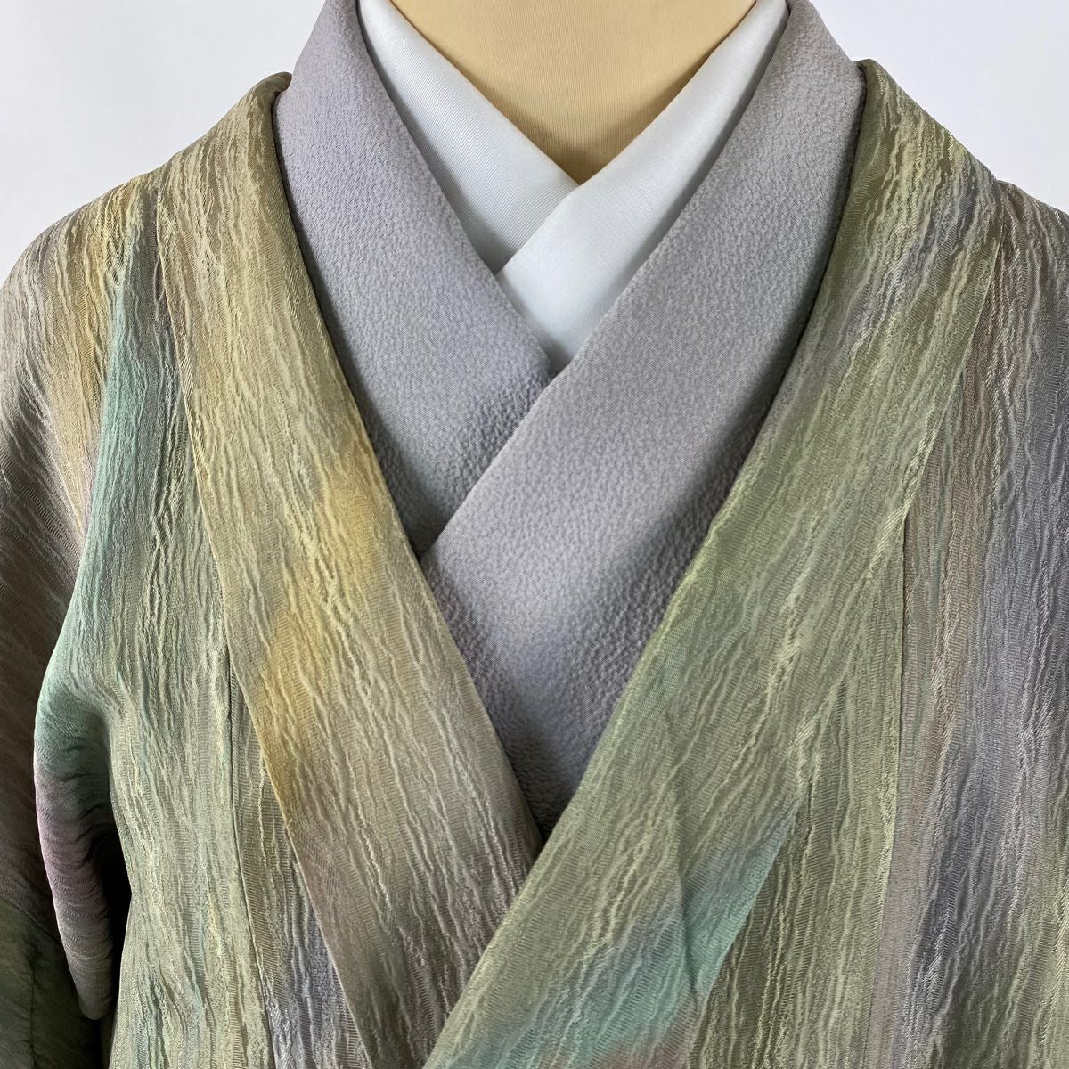 道中着 身丈100.5cm 裄丈69.5cm L 和装コート 着物衿 落款あり 縦縞 よろけ縞 ぼかし 灰緑 正絹 逸品