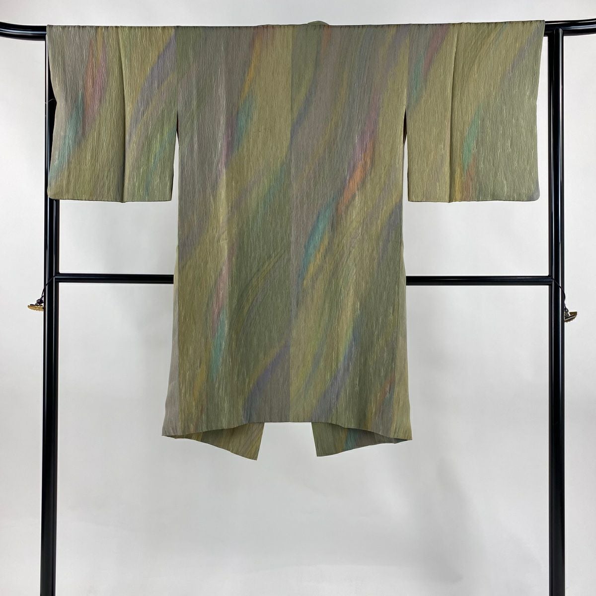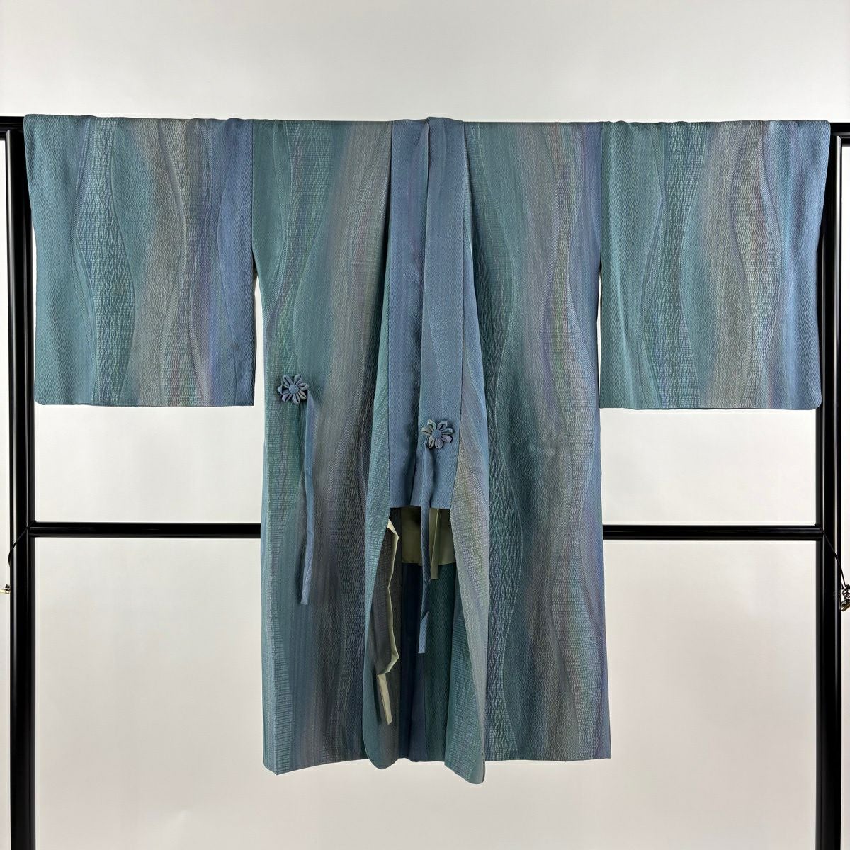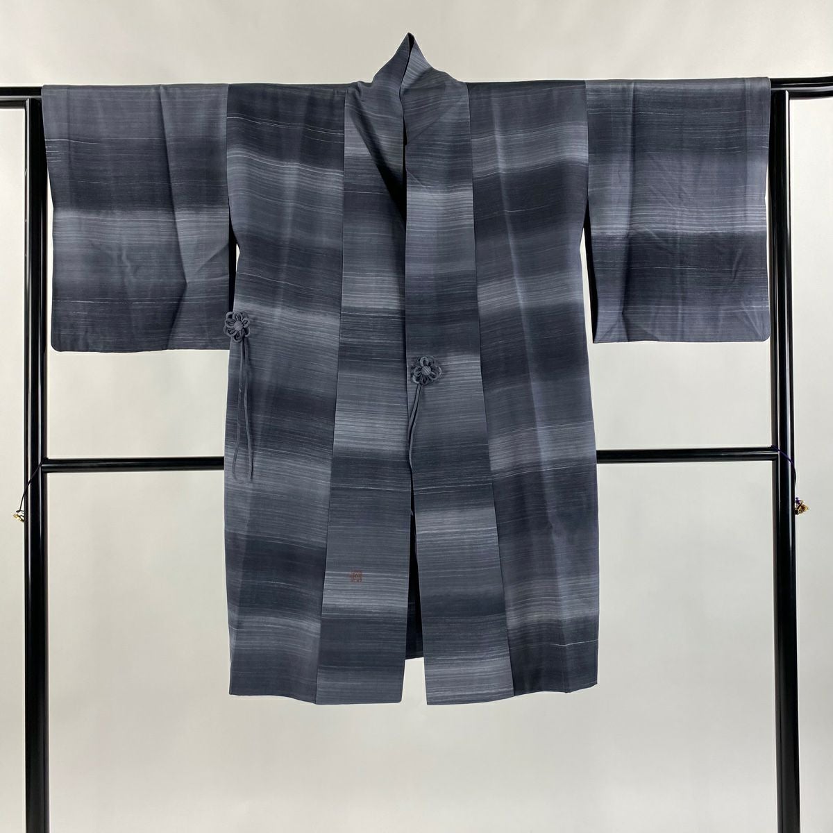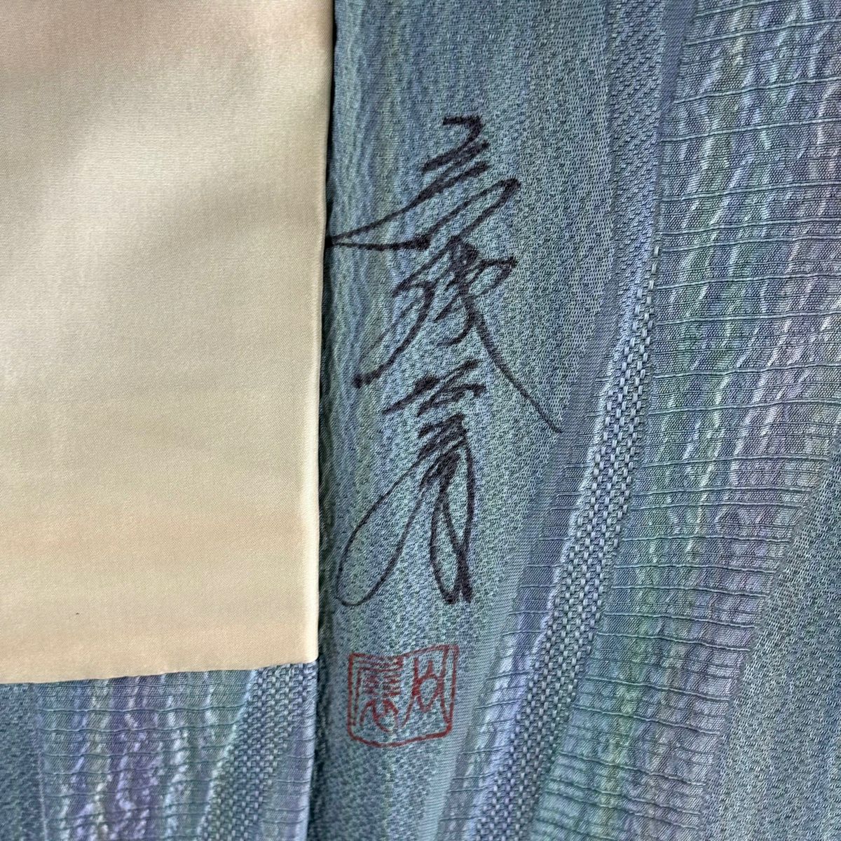 道中着 身丈100.5cm 裄丈69.5cm L 和装コート 着物衿 落款あり 縦縞 よろけ縞 ぼかし 灰緑 正絹 逸品