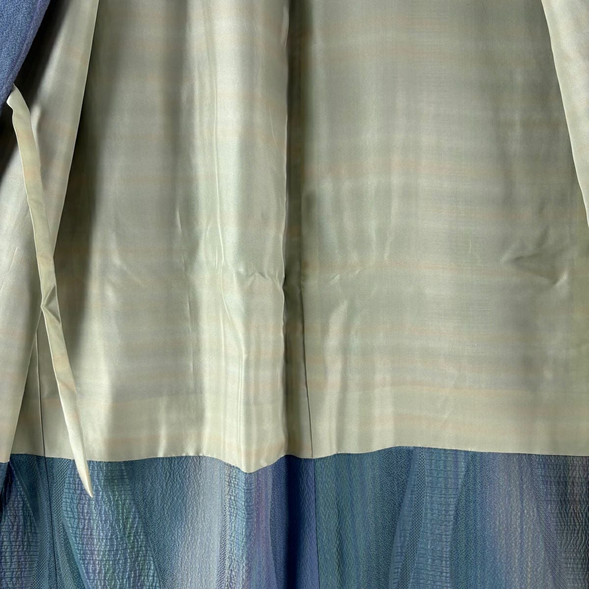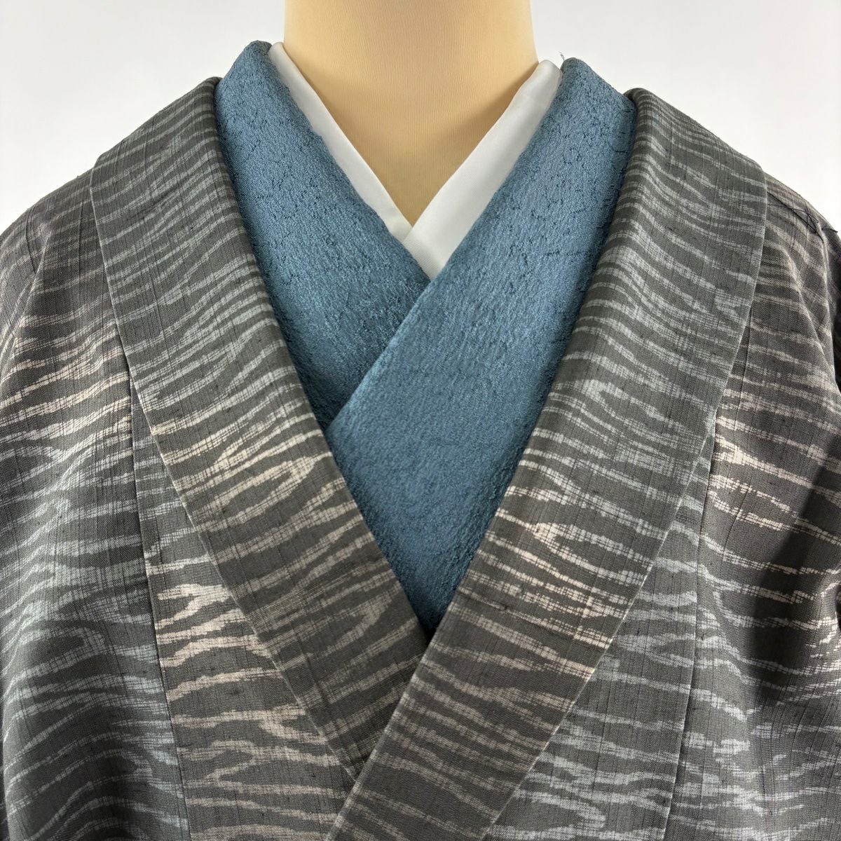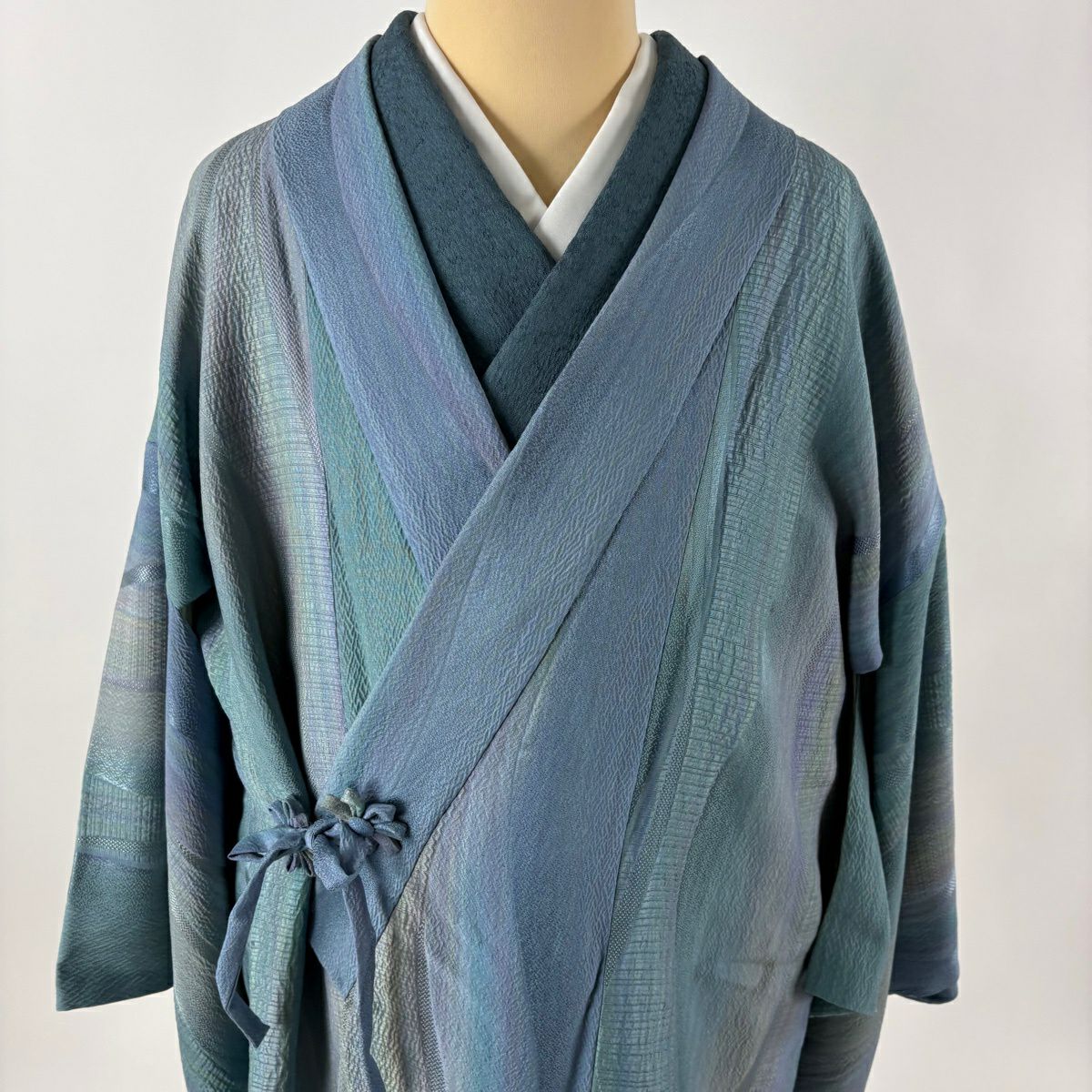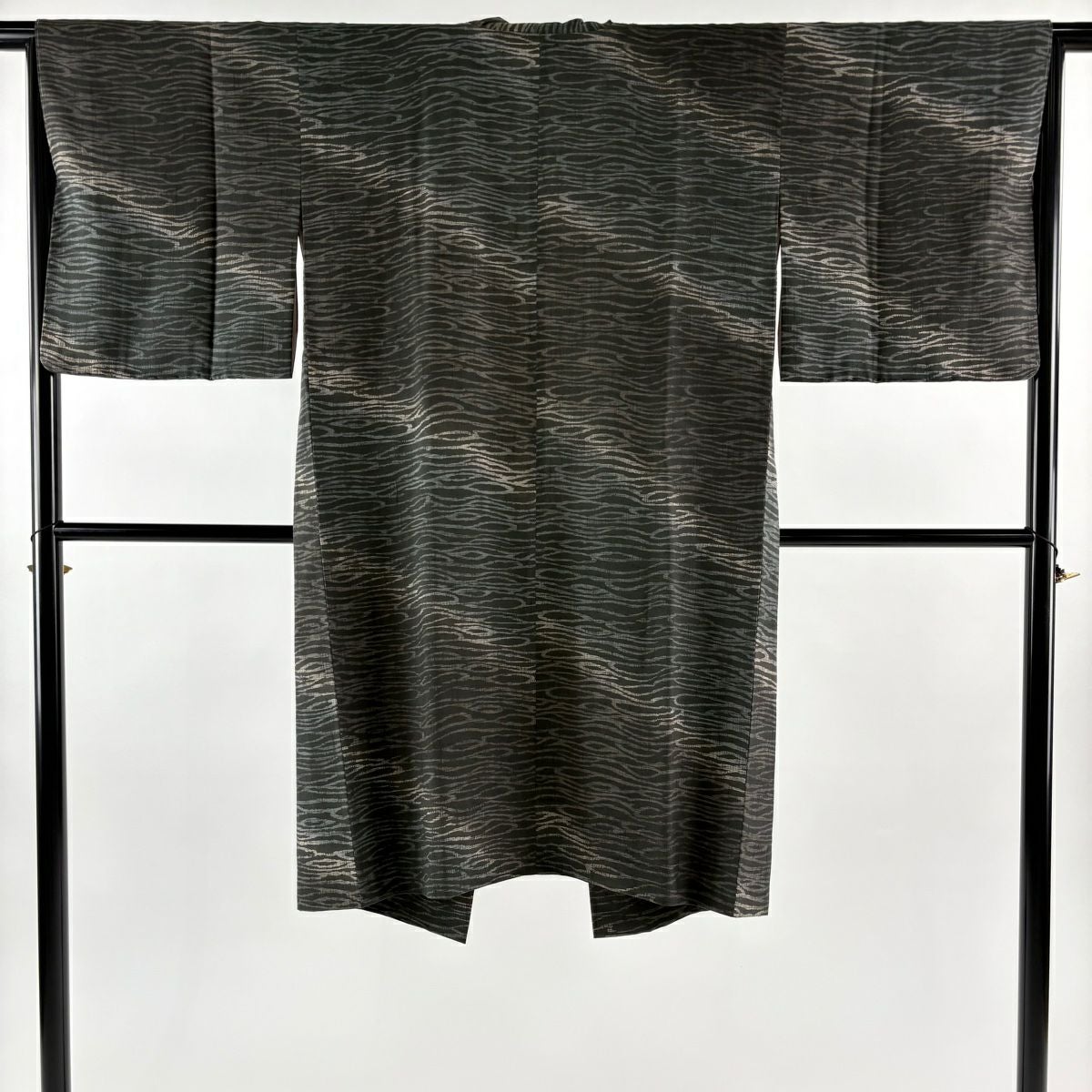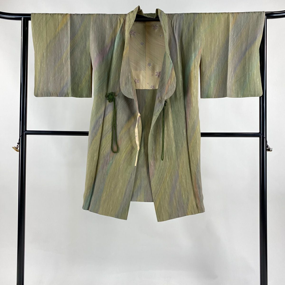 道中着 身丈100.5cm 裄丈69.5cm L 和装コート 着物衿 落款あり 縦縞 よろけ縞 ぼかし 灰緑 正絹 逸品