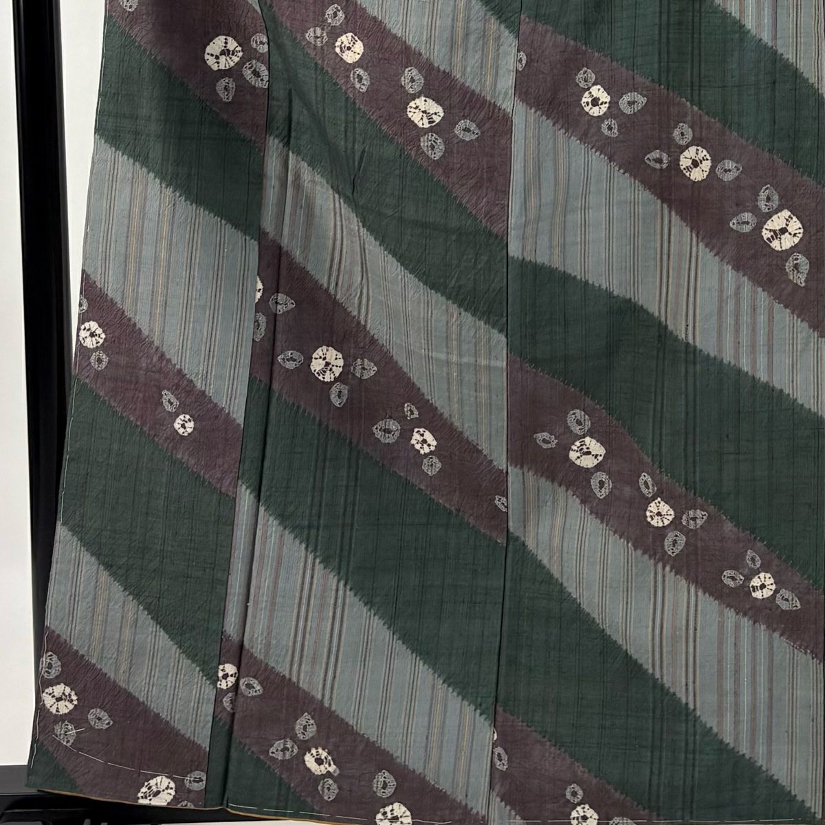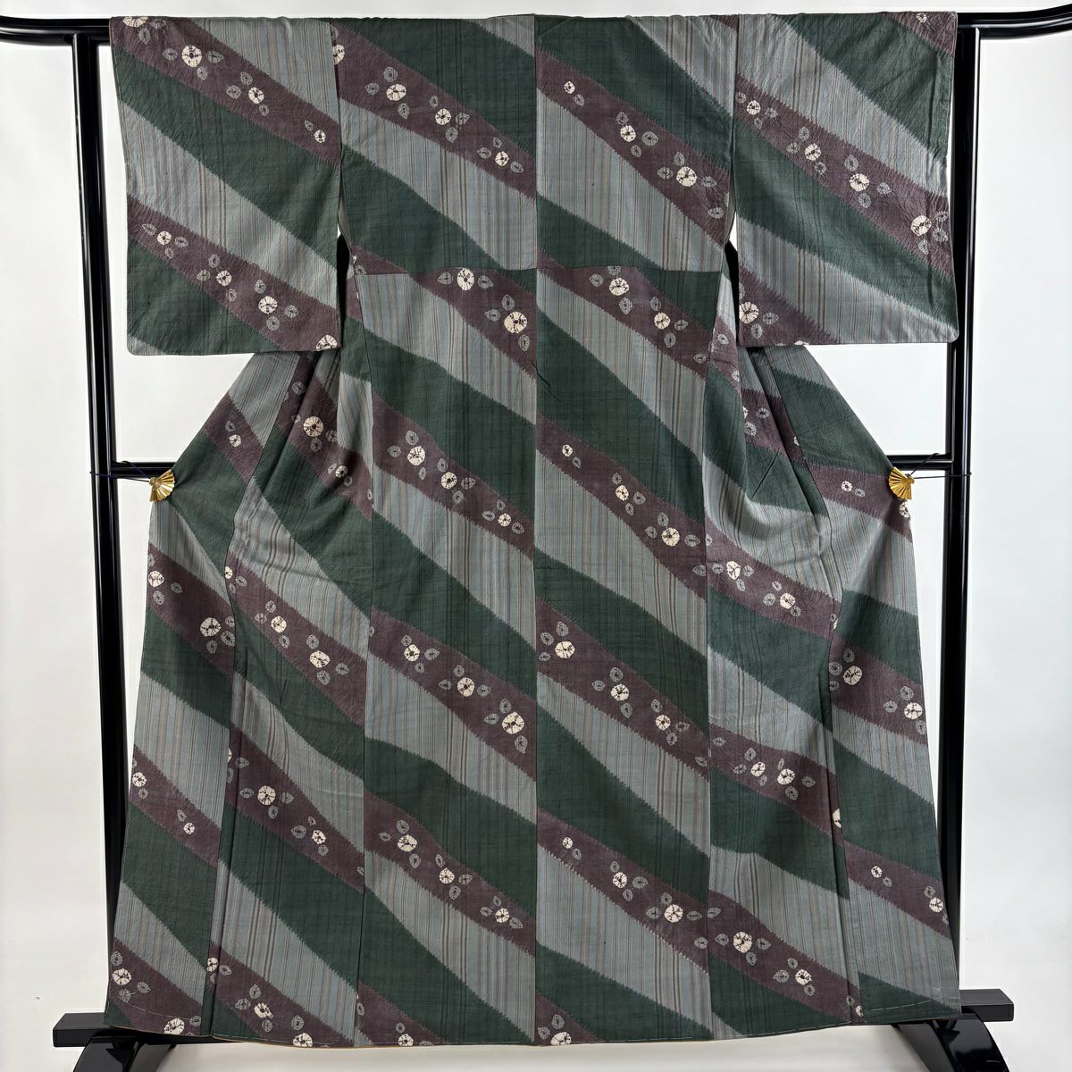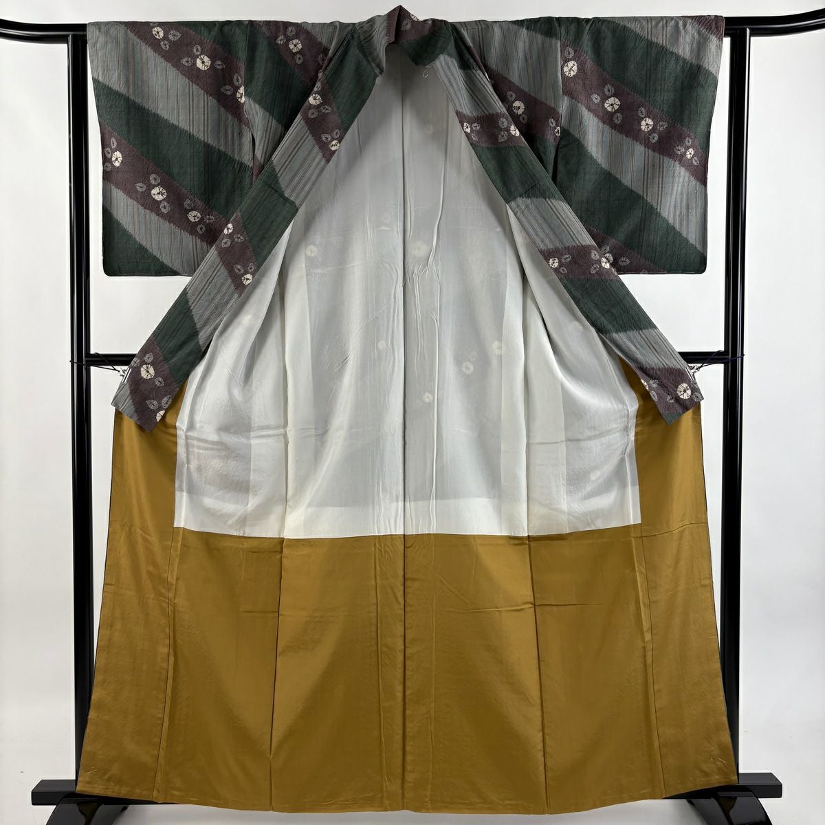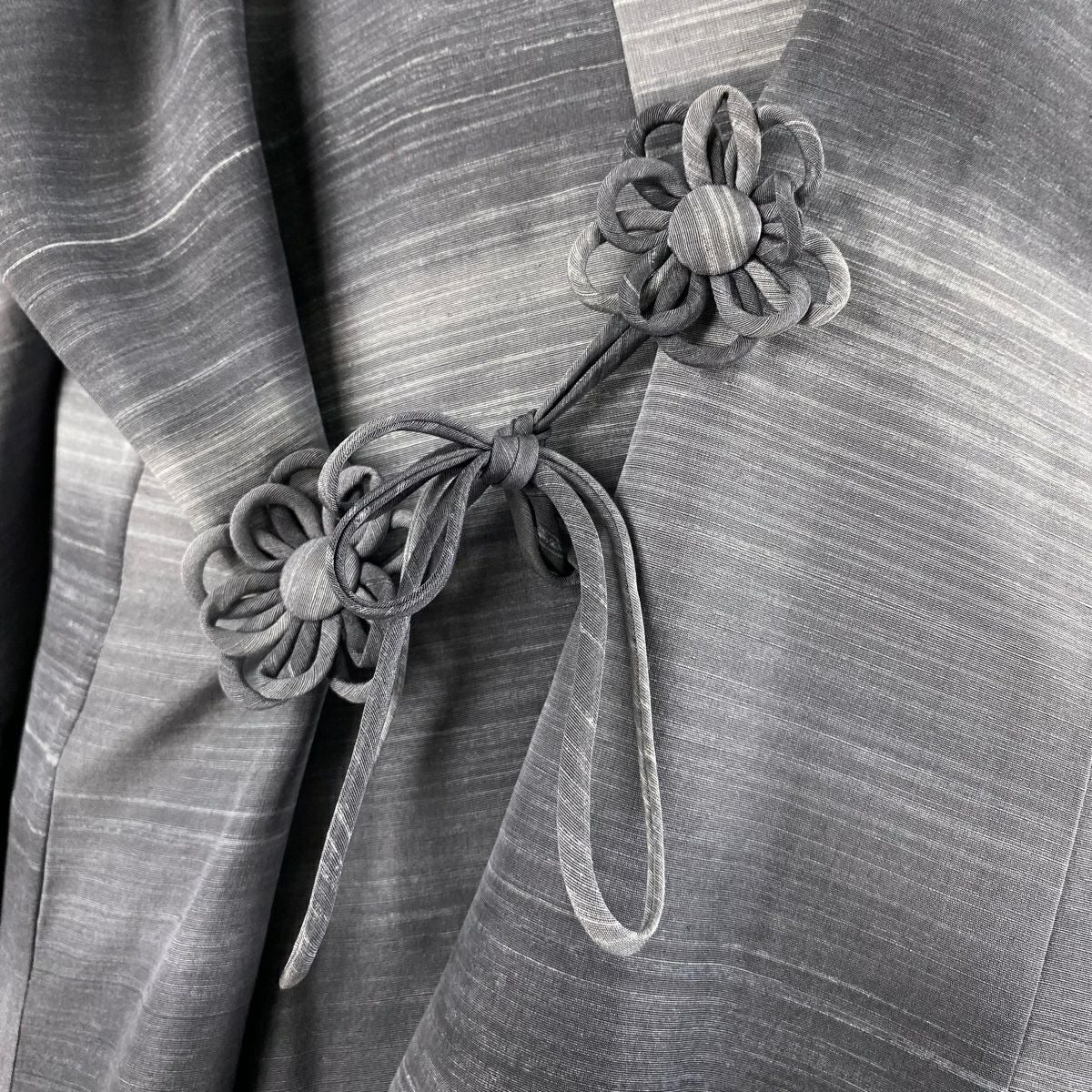 道中着 身丈100.5cm 裄丈69.5cm L 和装コート 着物衿 落款あり 縦縞 よろけ縞 ぼかし 灰緑 正絹 逸品
