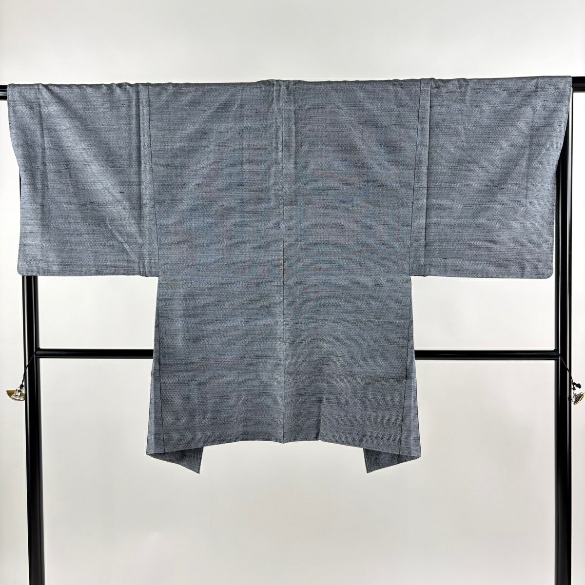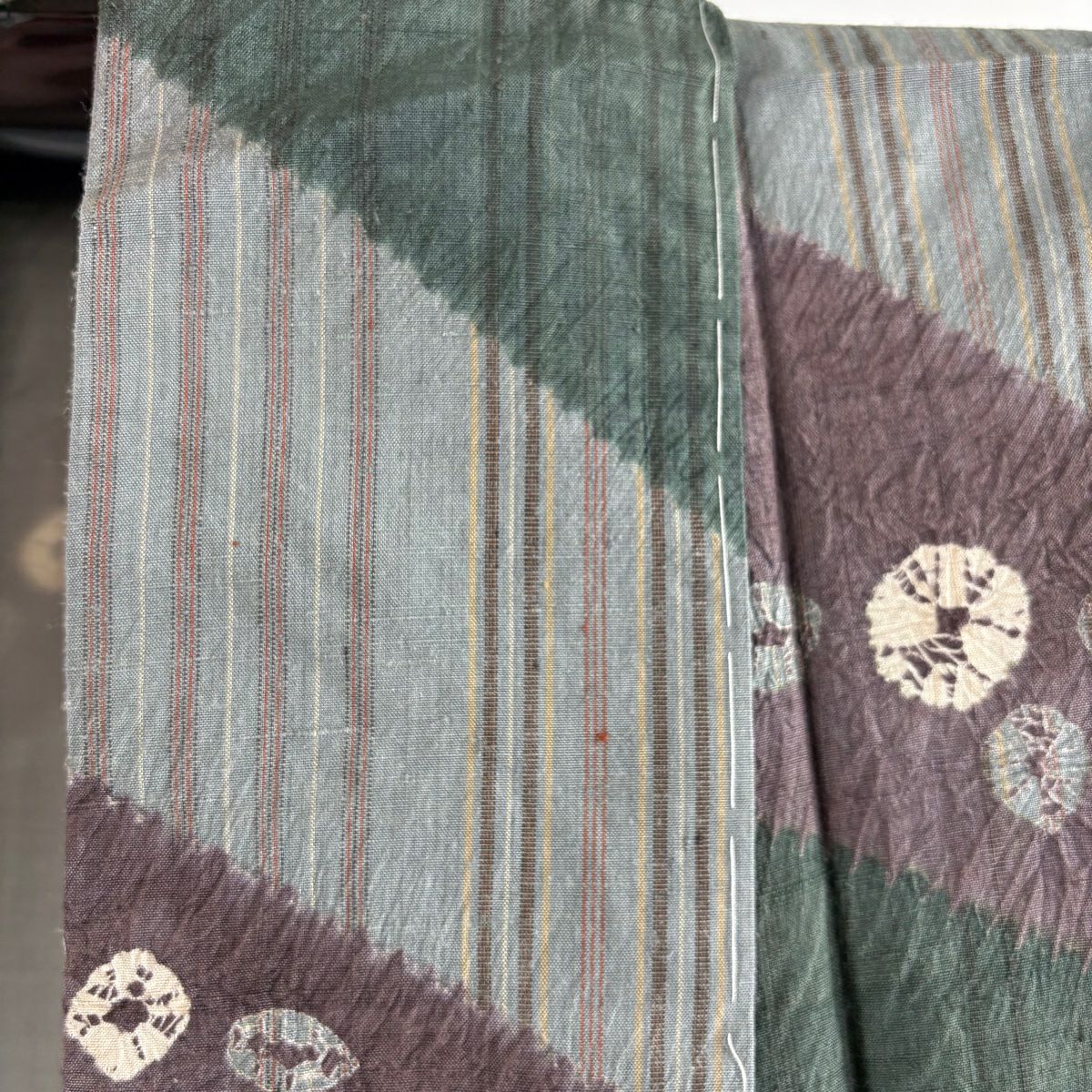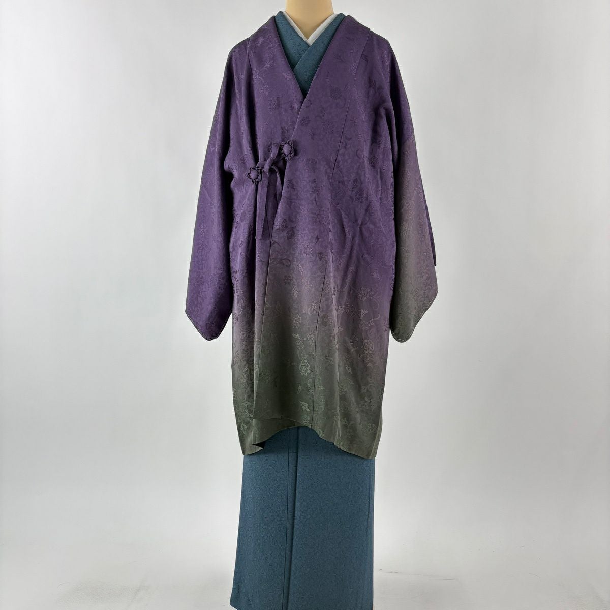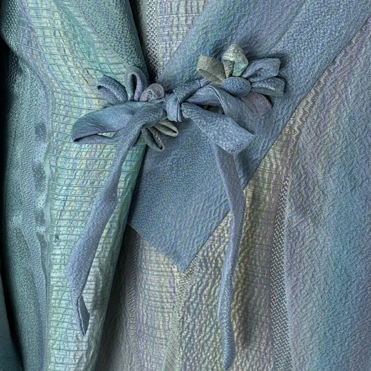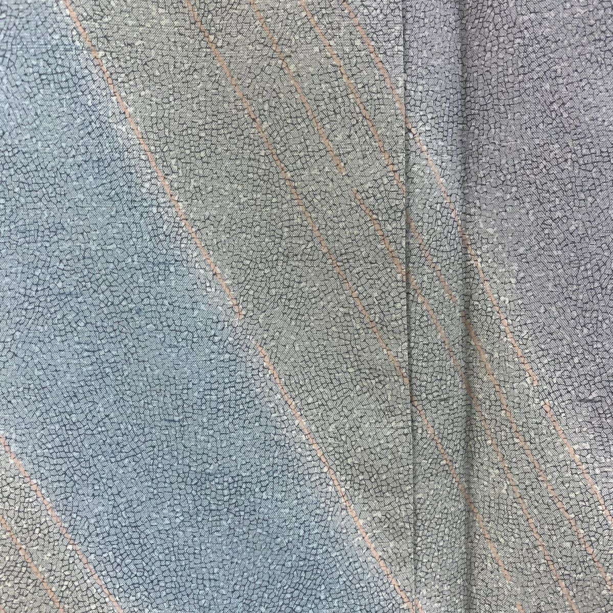 道中着 身丈100.5cm 裄丈69.5cm L 和装コート 着物衿 落款あり 縦縞 よろけ縞 ぼかし 灰緑 正絹 逸品