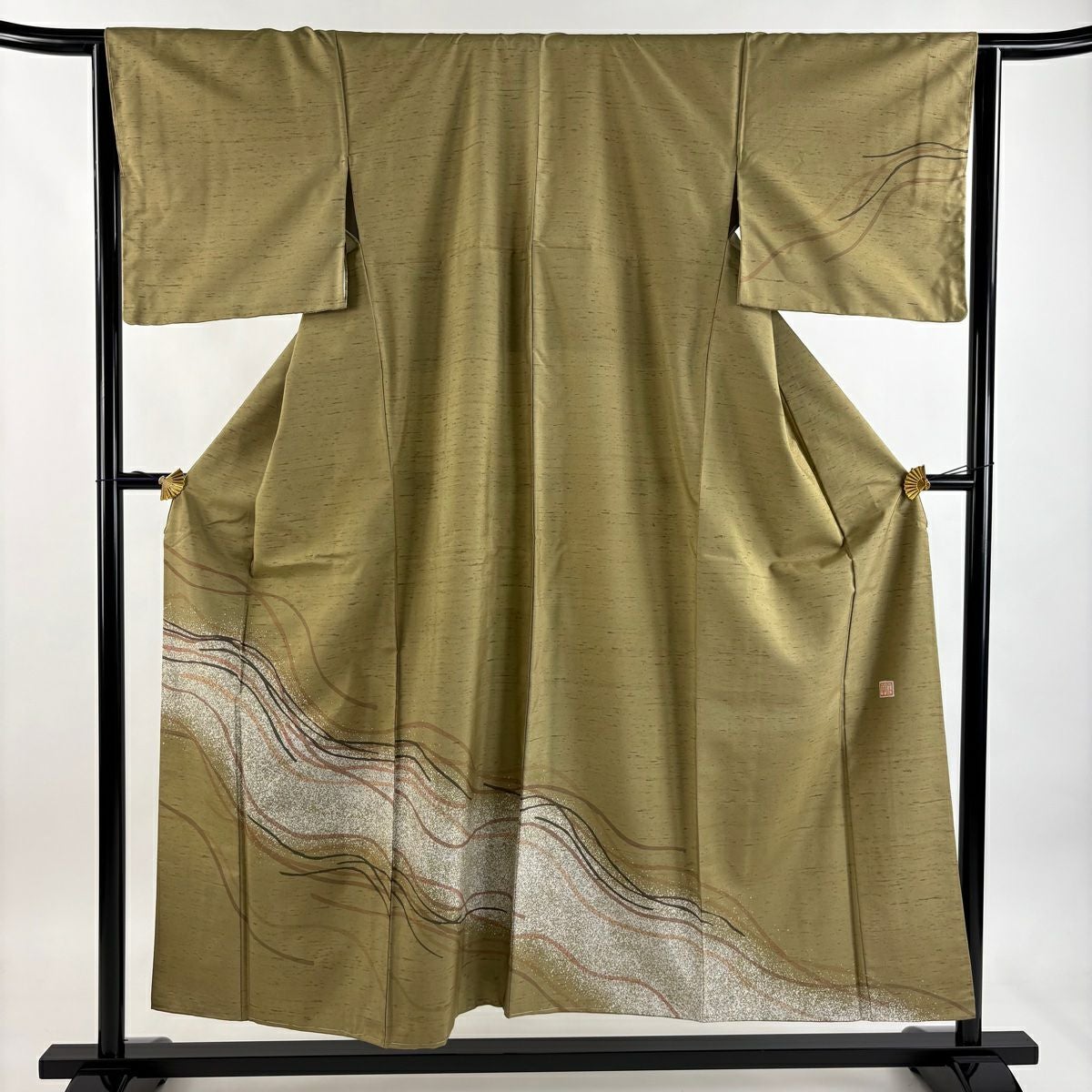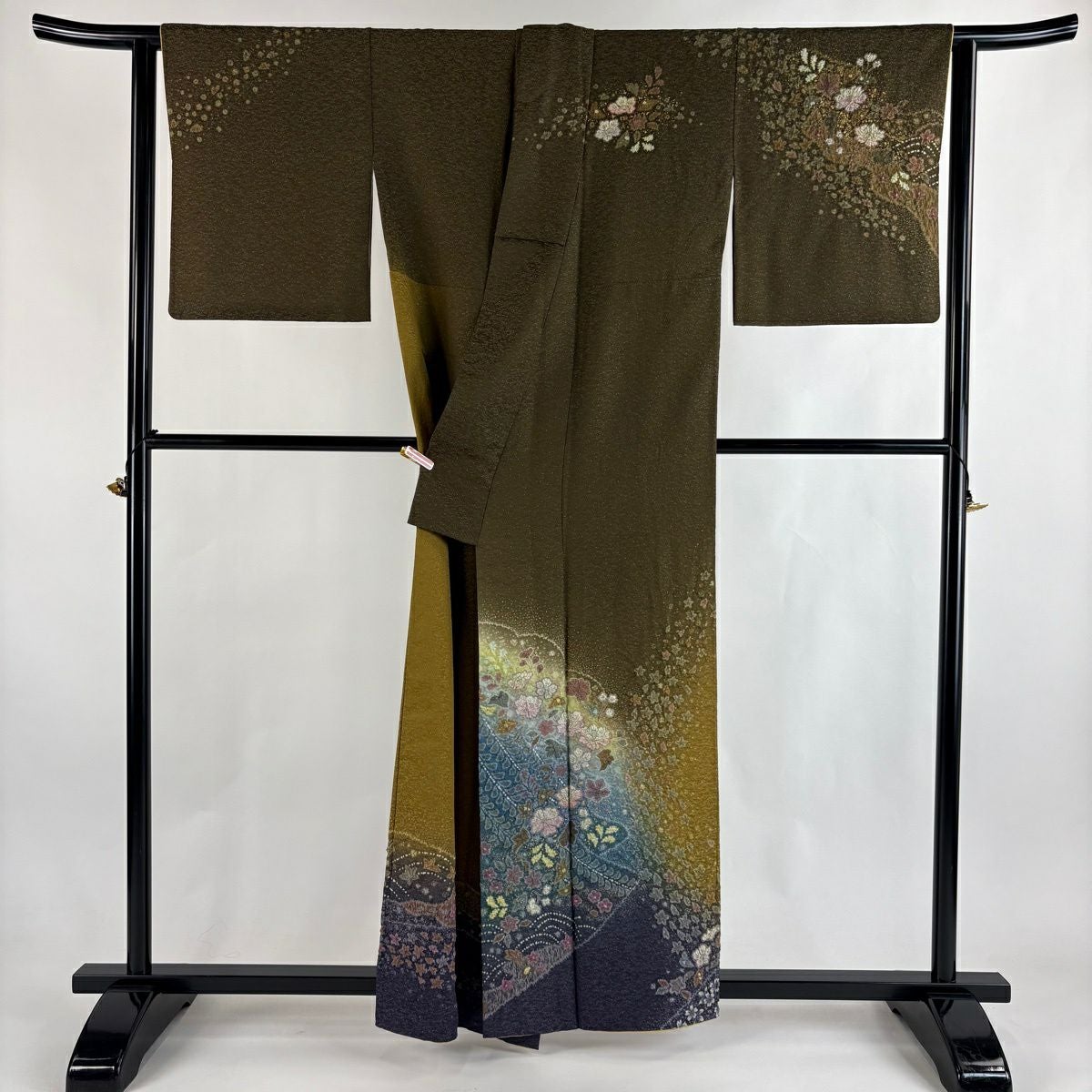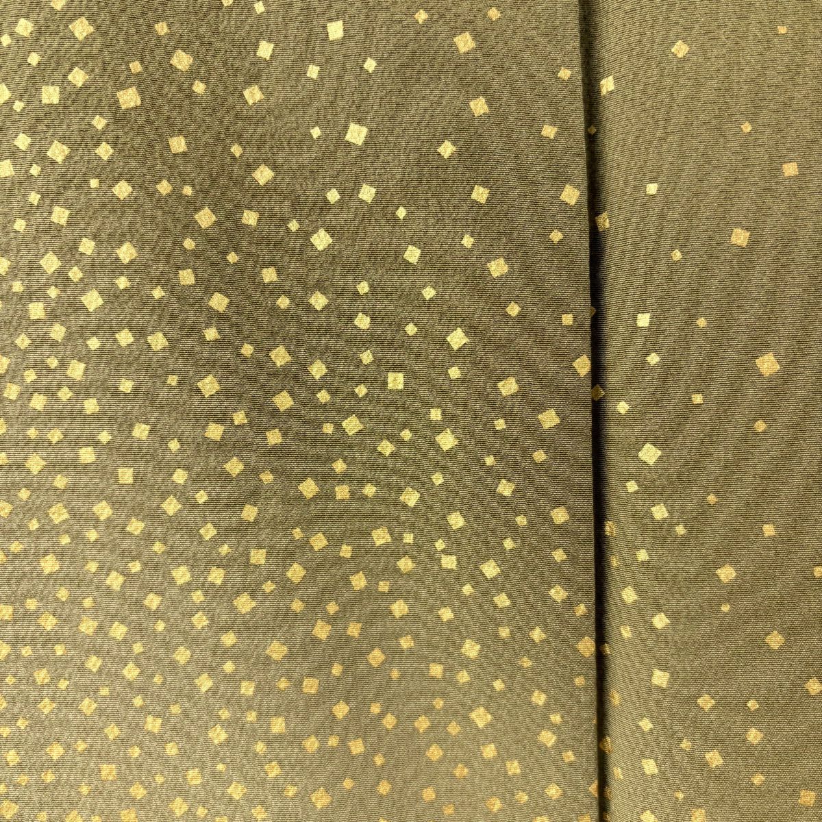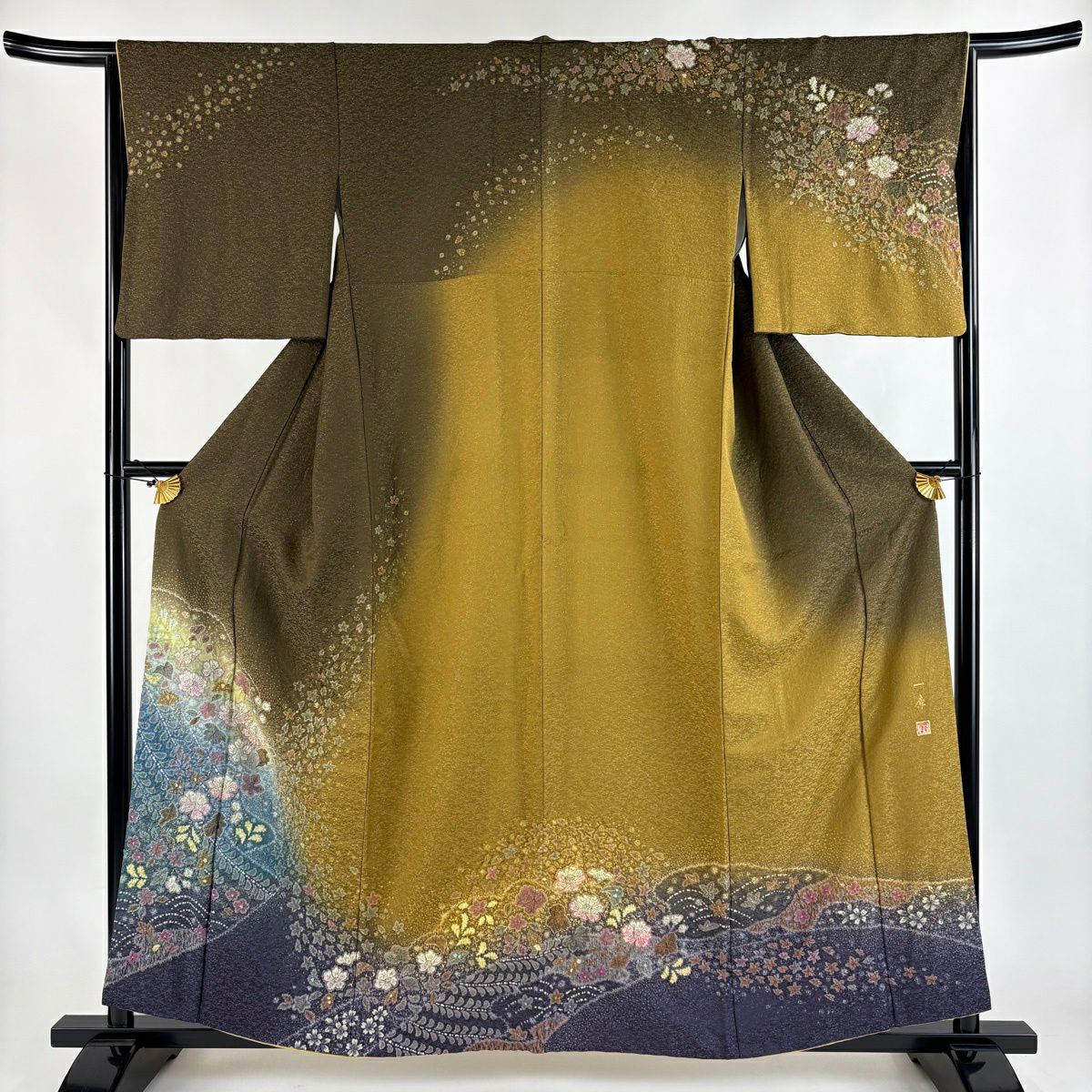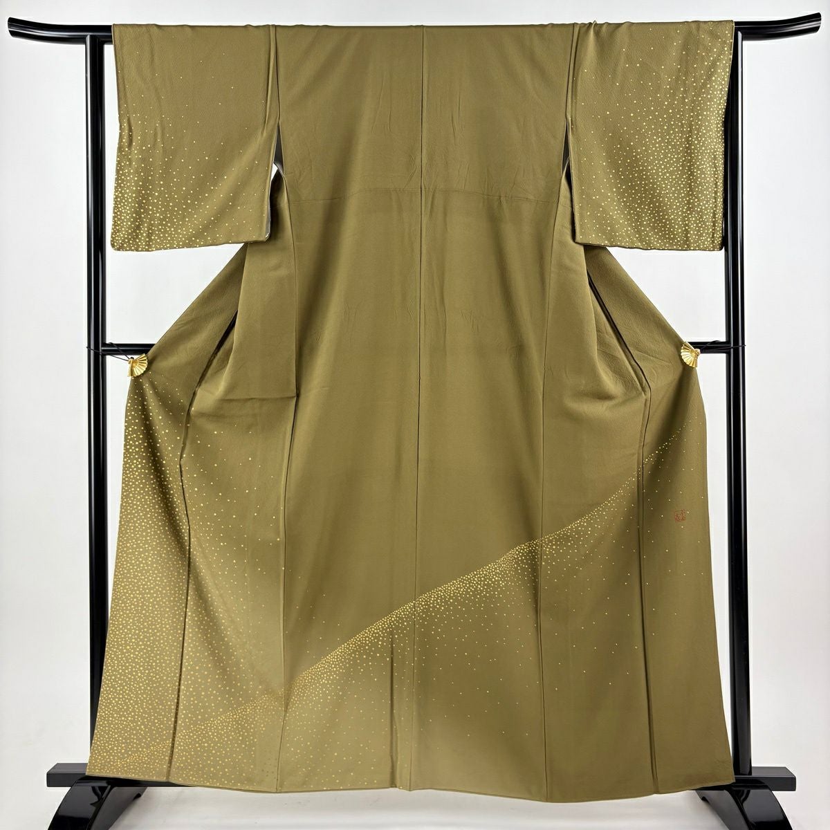 付下げ 身丈161cm 裄丈64cm M 袷 人間国宝 福田喜重 落款あり 幾何学 金彩 ぼかし 茶緑色 正絹 逸品