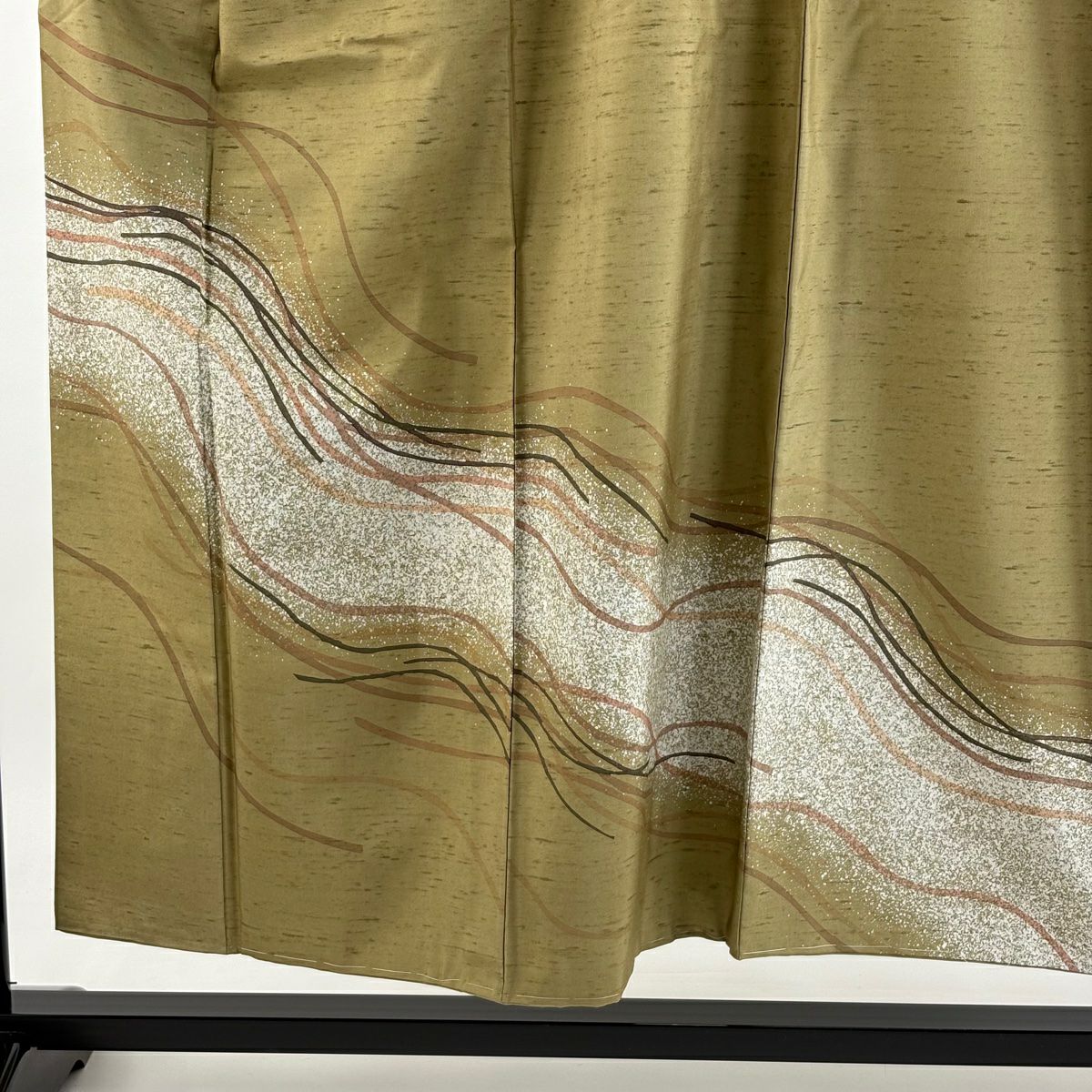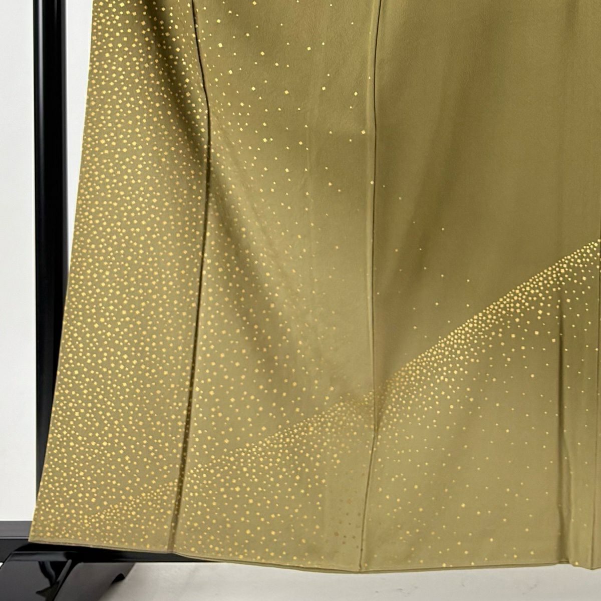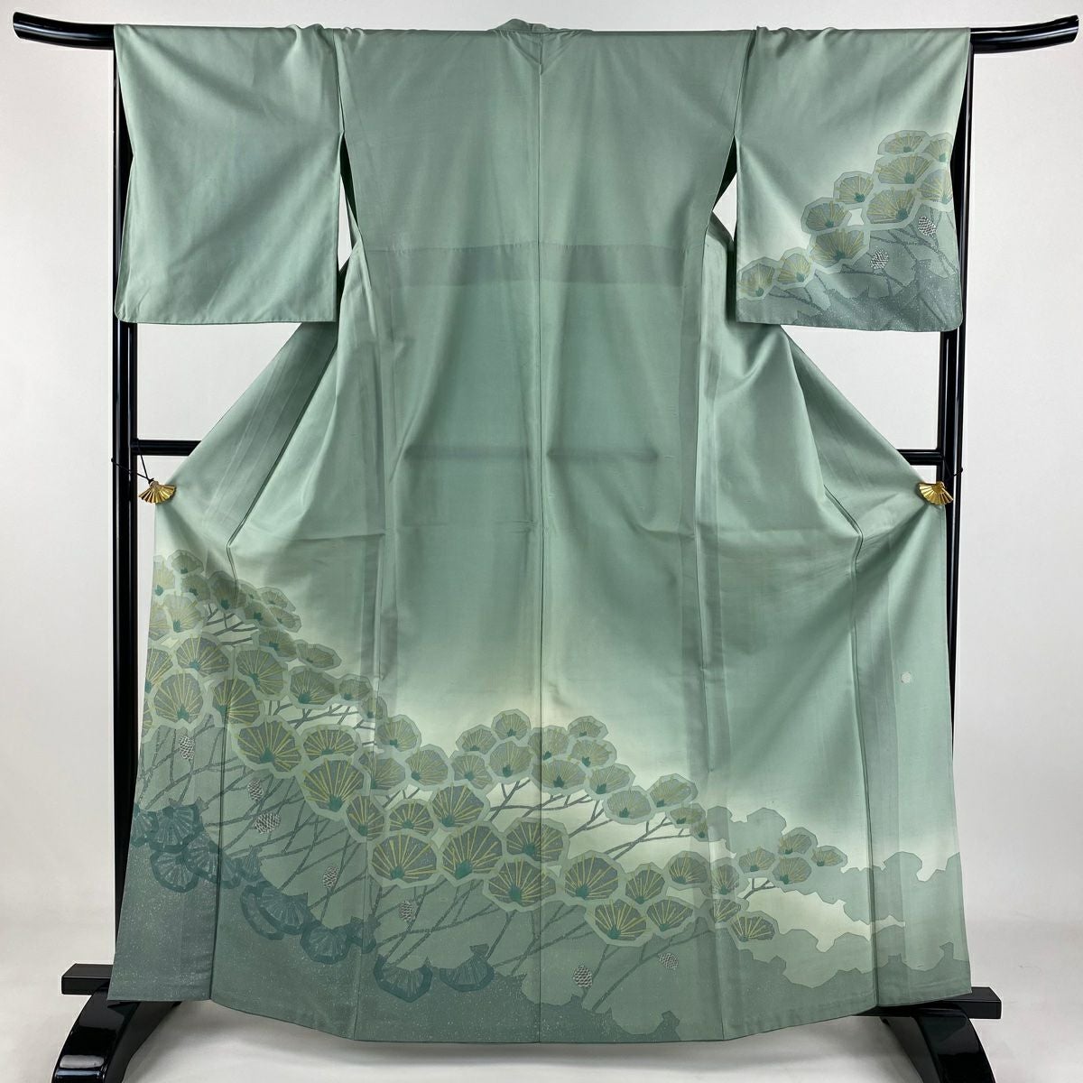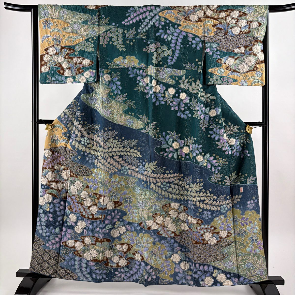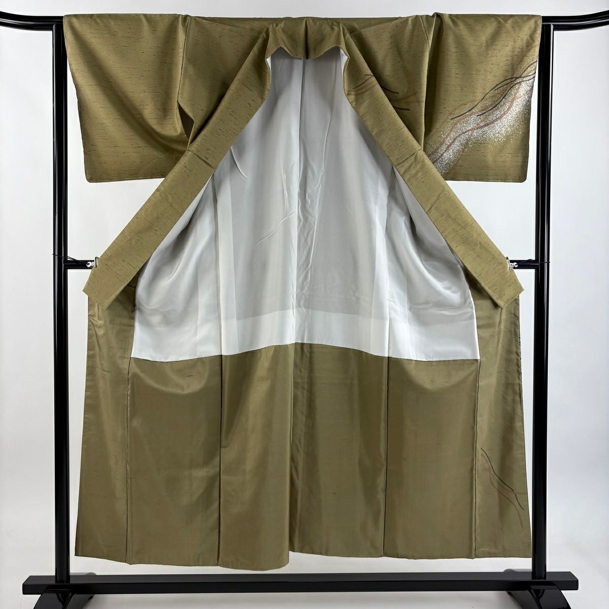 付下げ 身丈161cm 裄丈64cm M 袷 人間国宝 福田喜重 落款あり 幾何学 金彩 ぼかし 茶緑色 正絹 逸品