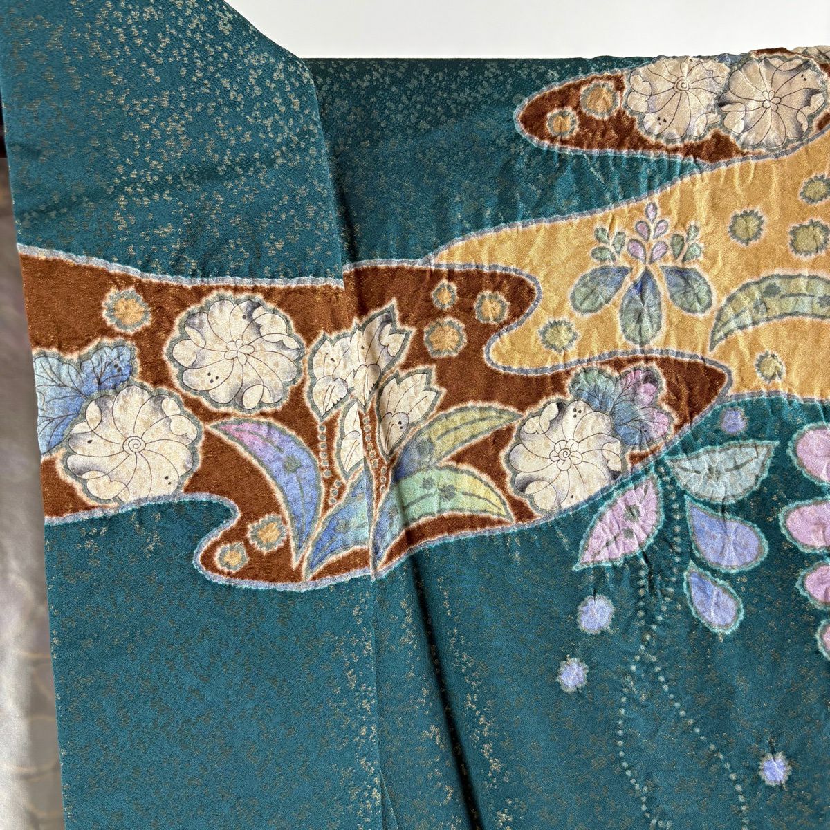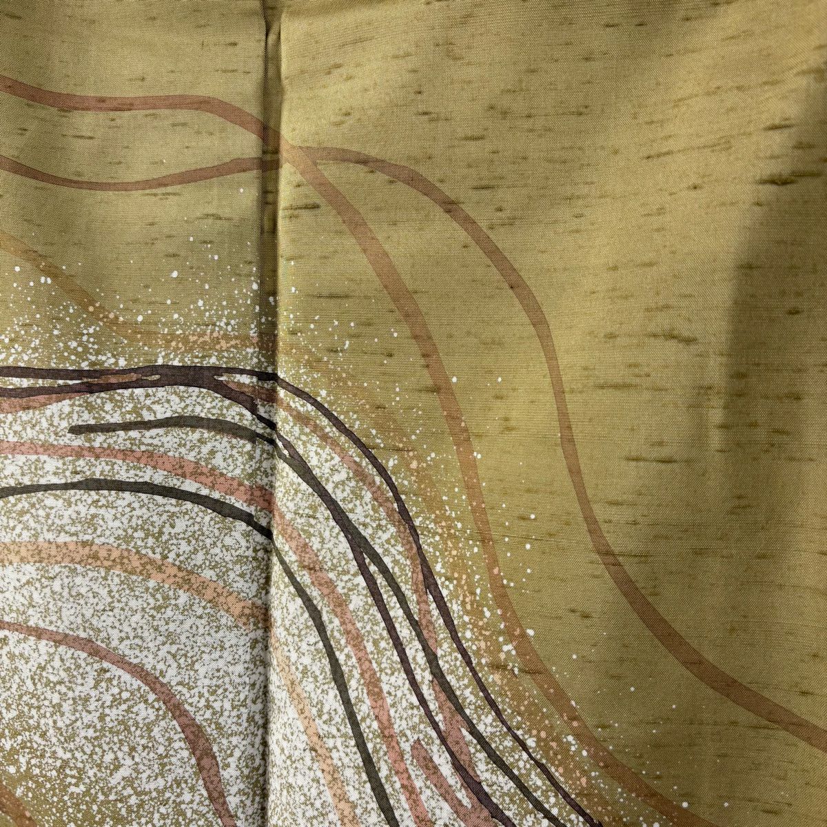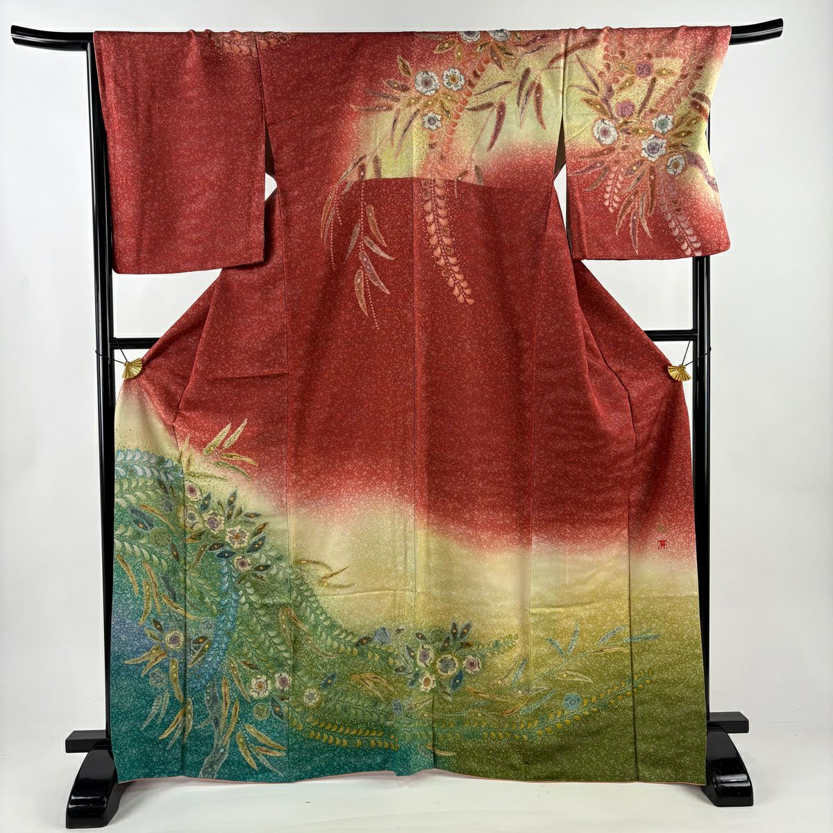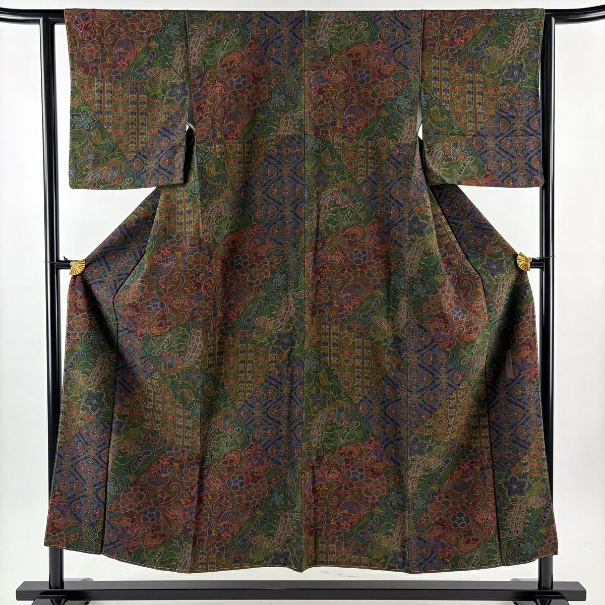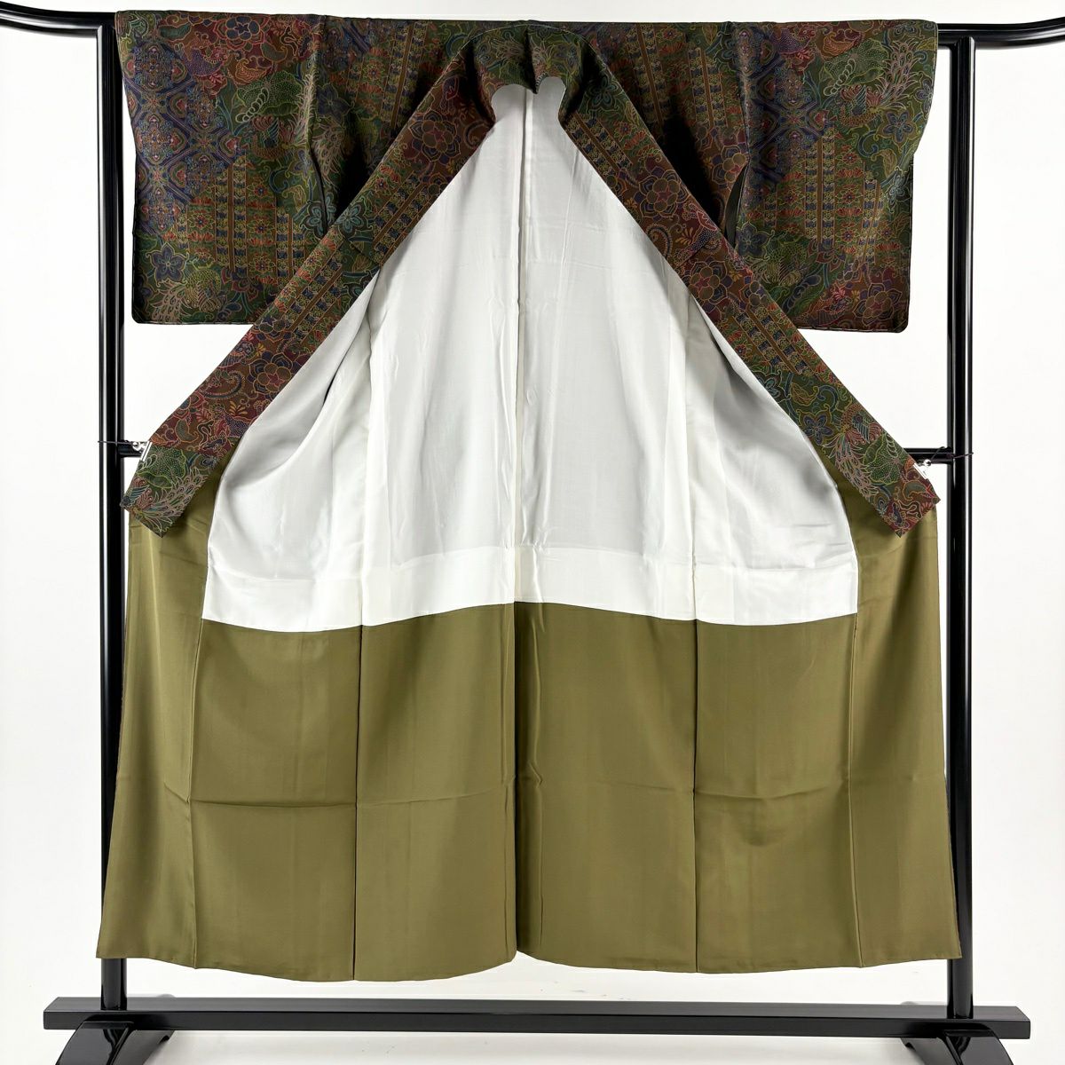 付下げ 身丈161cm 裄丈64cm M 袷 人間国宝 福田喜重 落款あり 幾何学 金彩 ぼかし 茶緑色 正絹 逸品