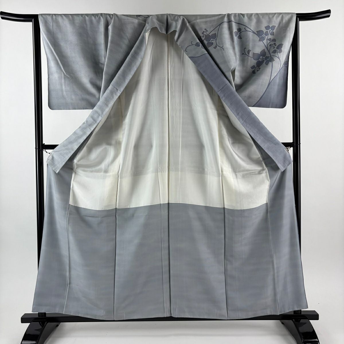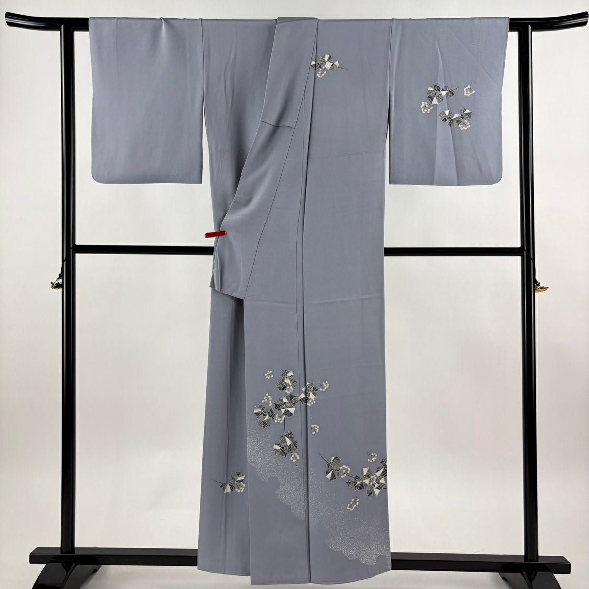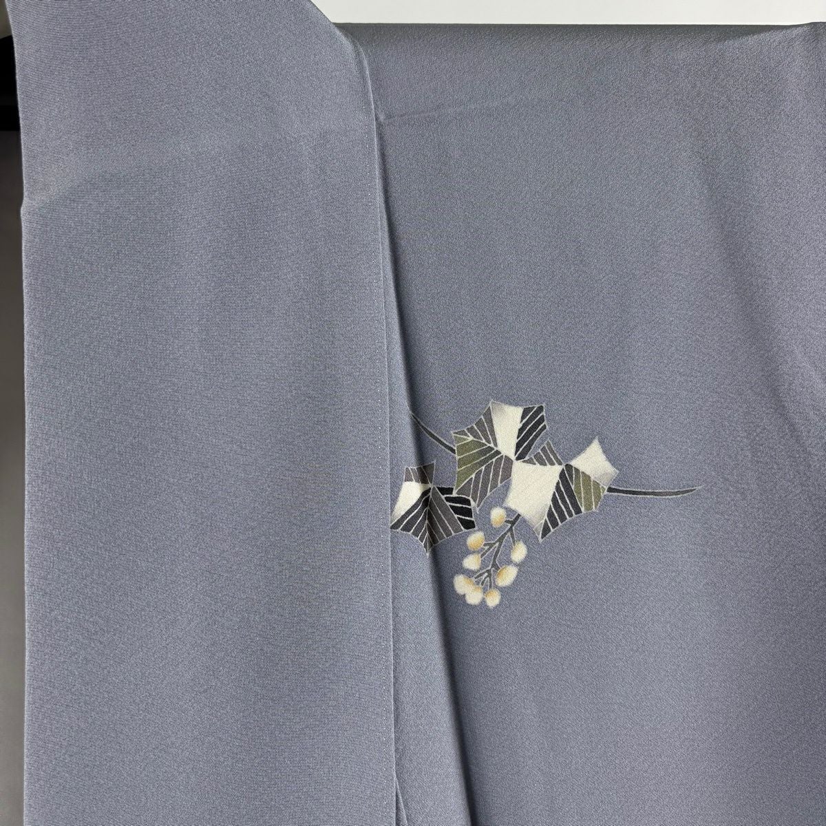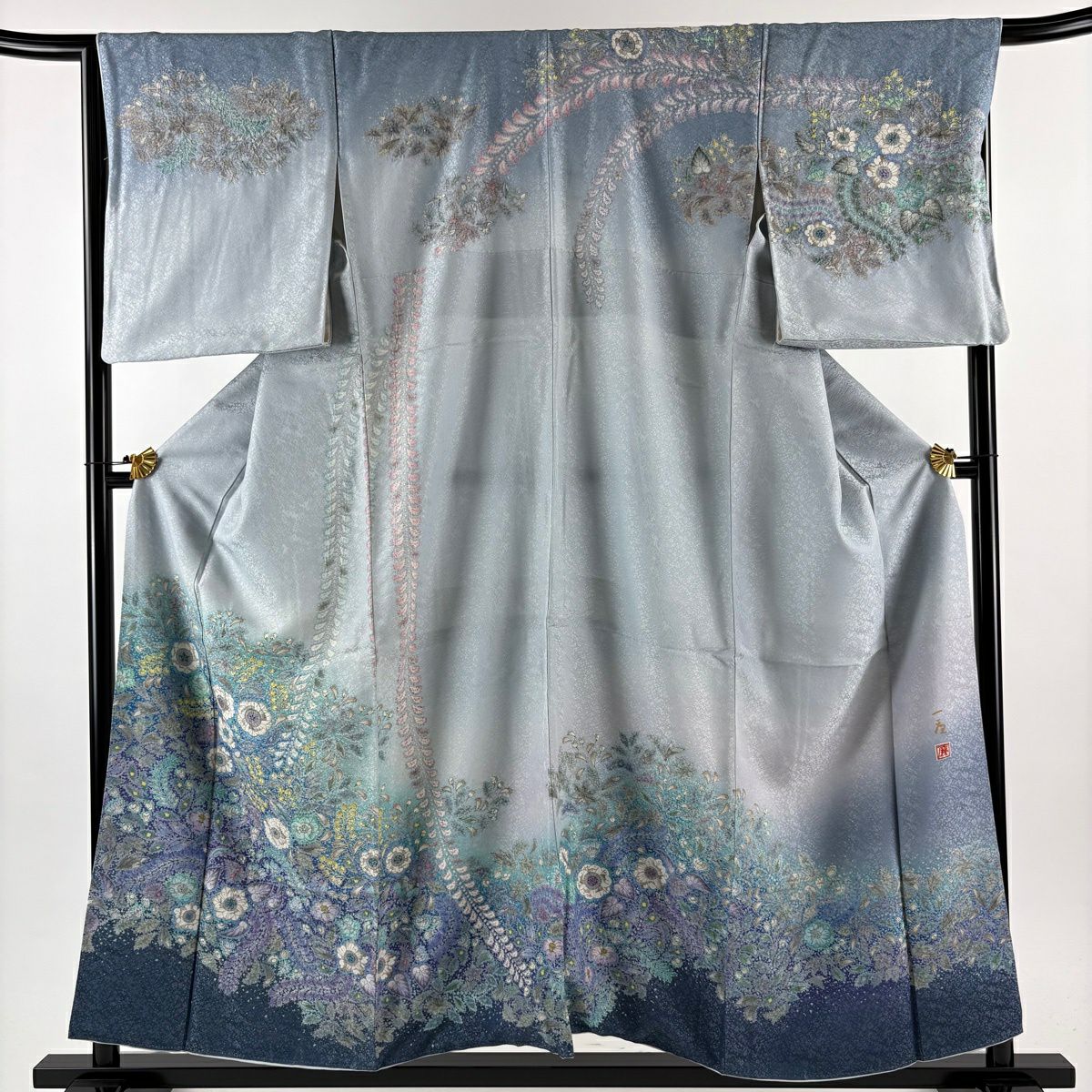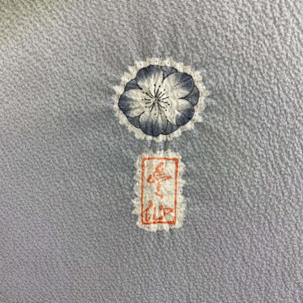 付下げ 身丈155.5cm 裄丈64cm M 袷 鶴見保次 落款あり 枝花 雪輪 ぼかし 青灰色 正絹 逸品 一つ紋