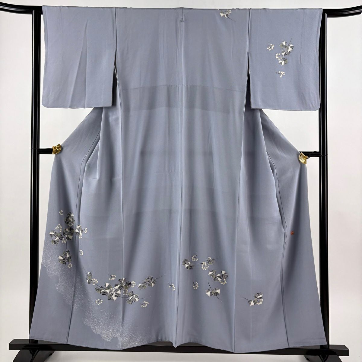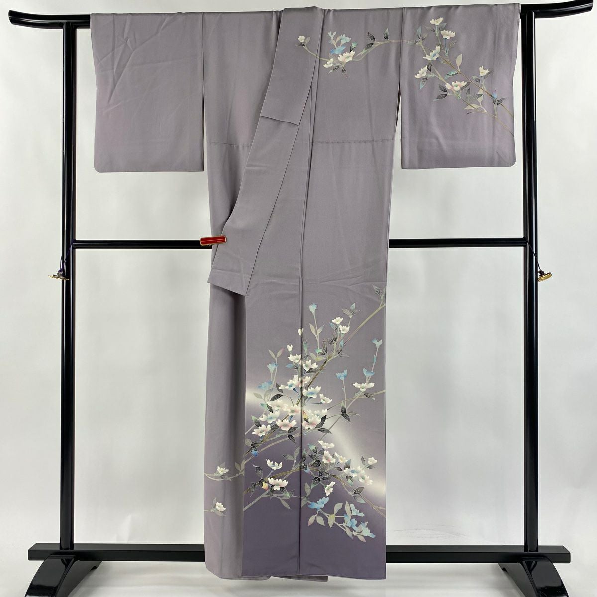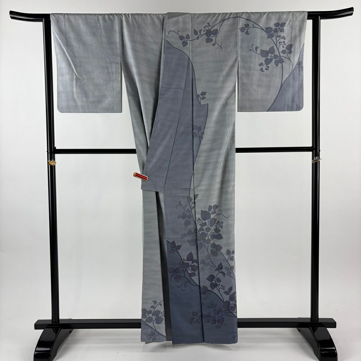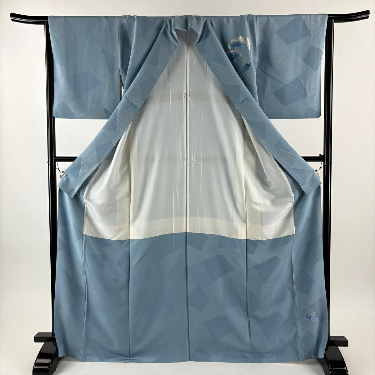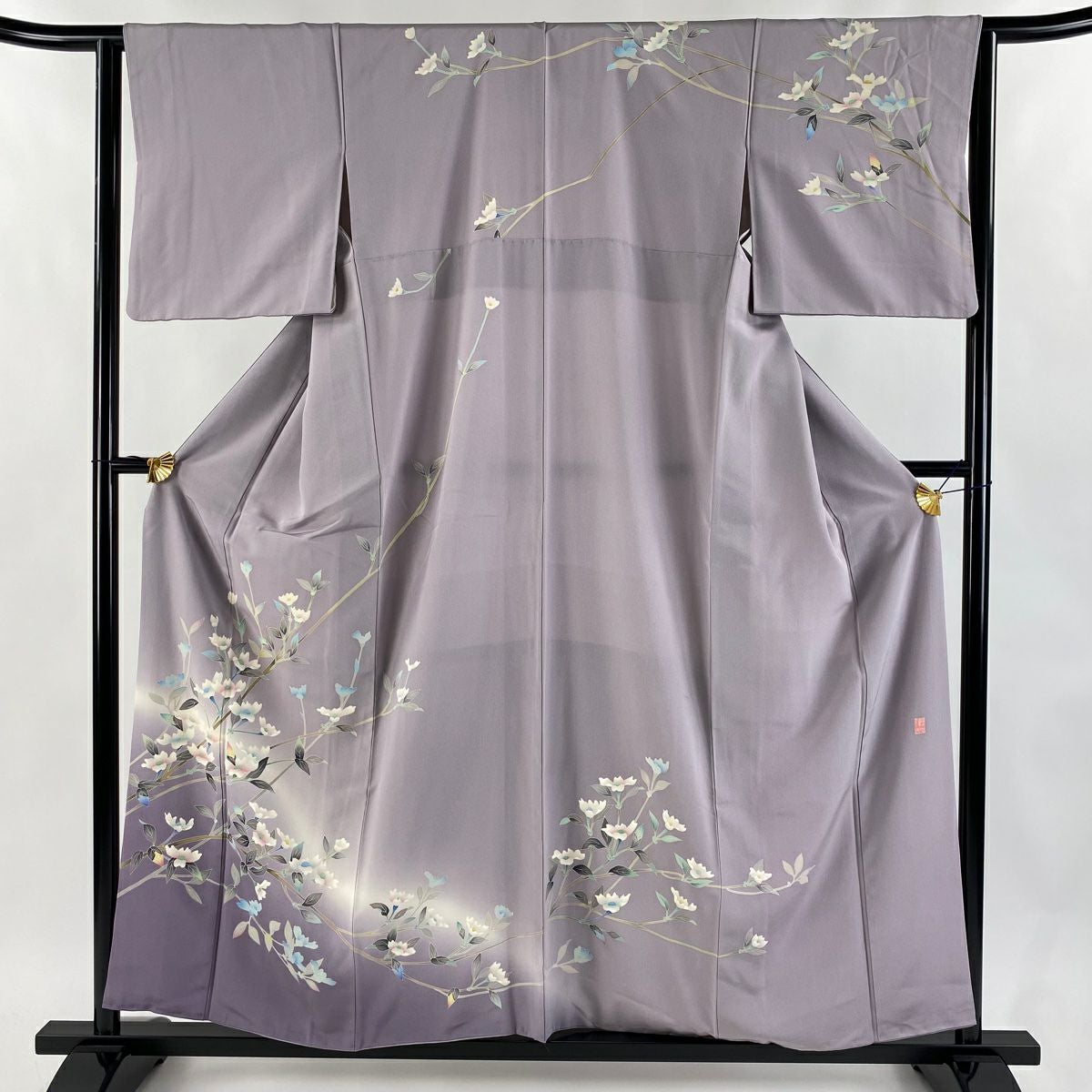 付下げ 身丈155.5cm 裄丈64cm M 袷 鶴見保次 落款あり 枝花 雪輪 ぼかし 青灰色 正絹 逸品 一つ紋