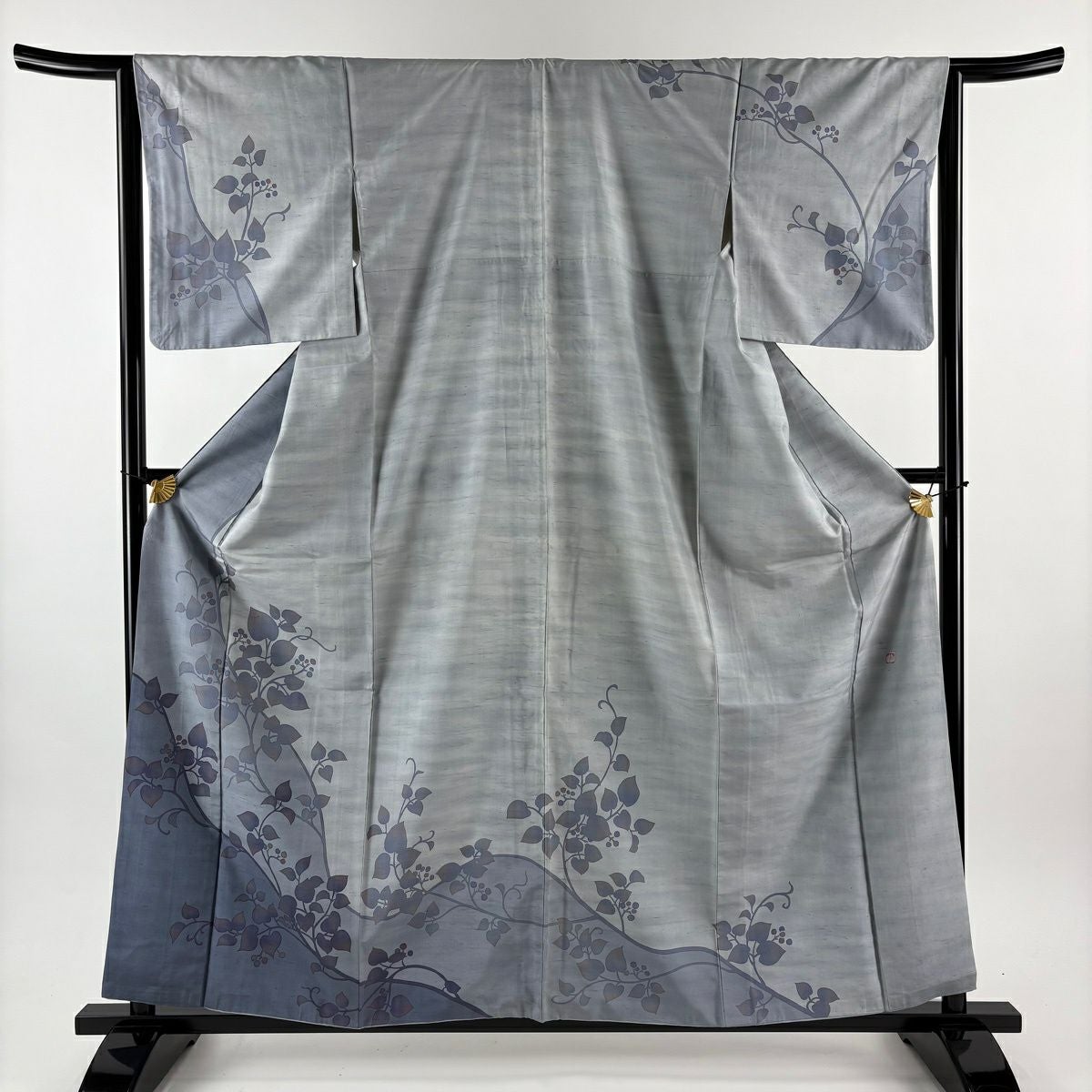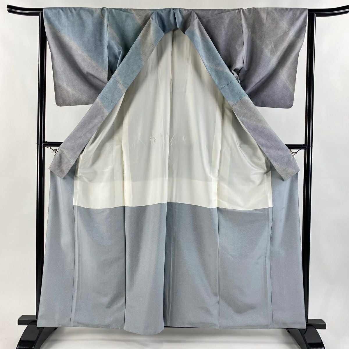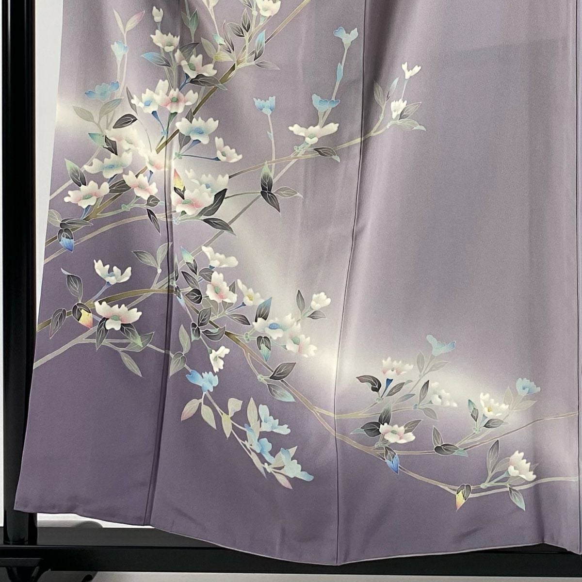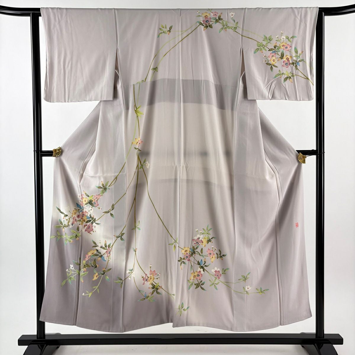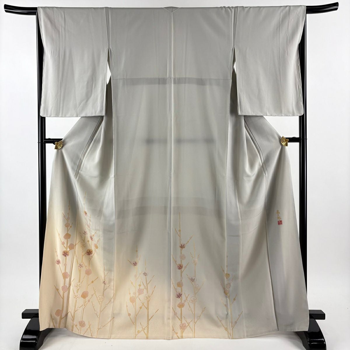 付下げ 身丈155.5cm 裄丈64cm M 袷 鶴見保次 落款あり 枝花 雪輪 ぼかし 青灰色 正絹 逸品 一つ紋