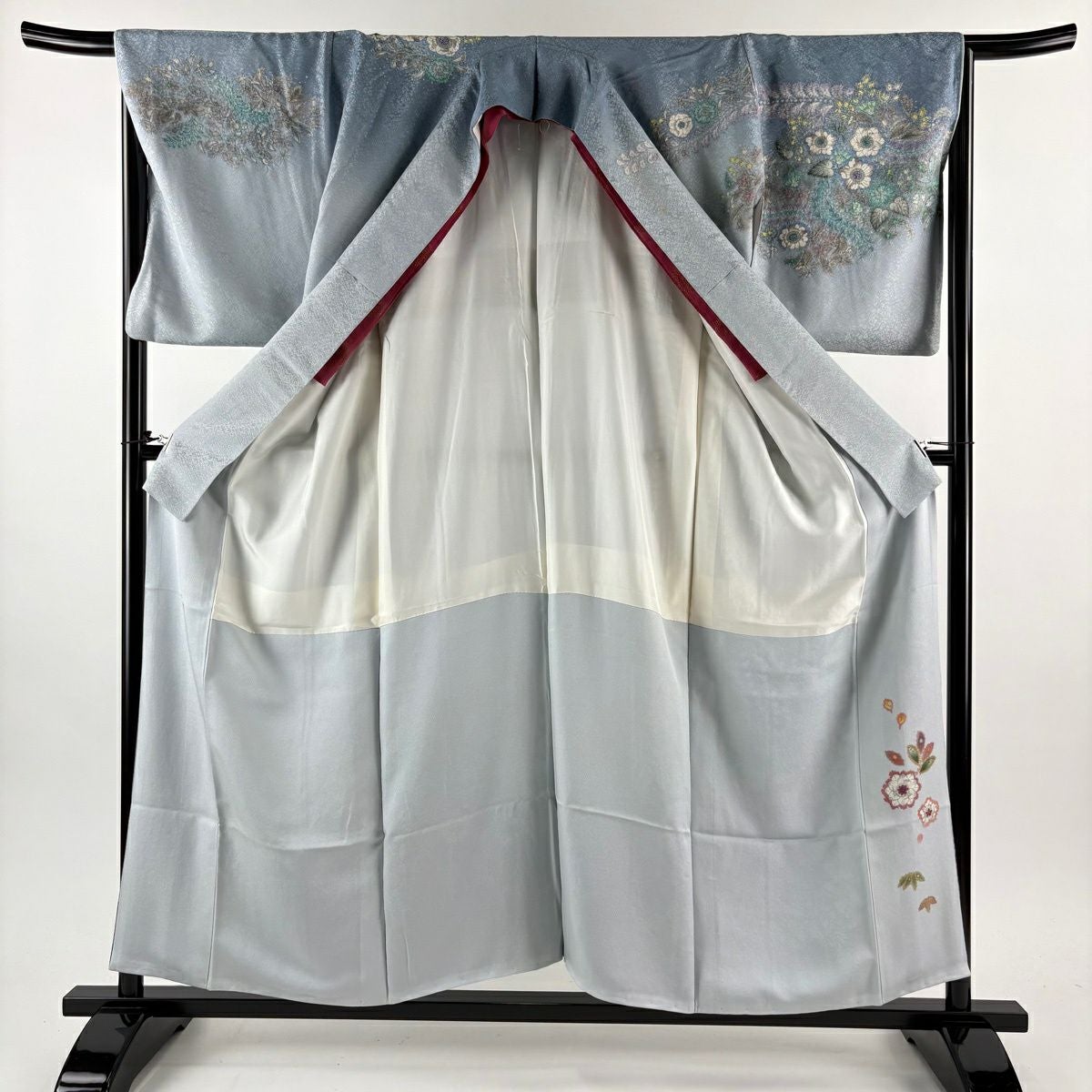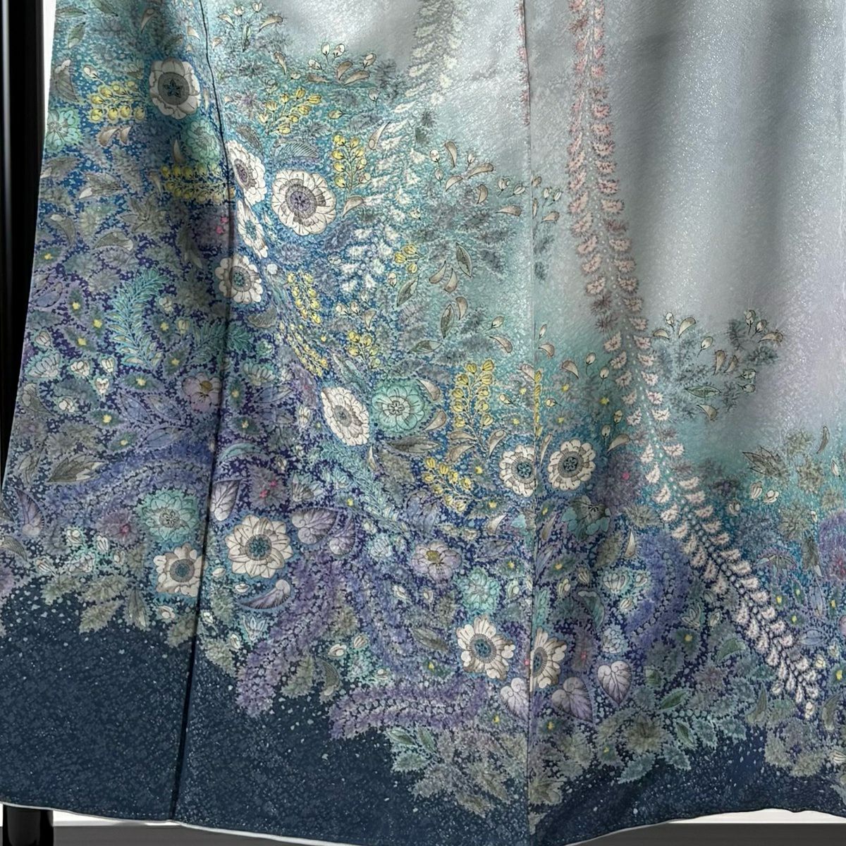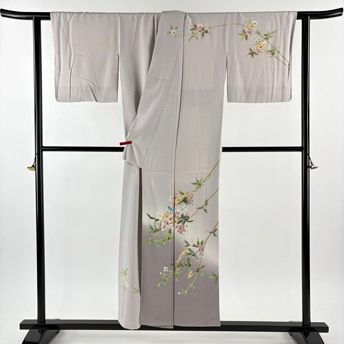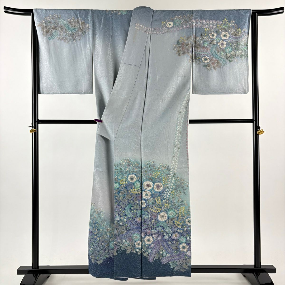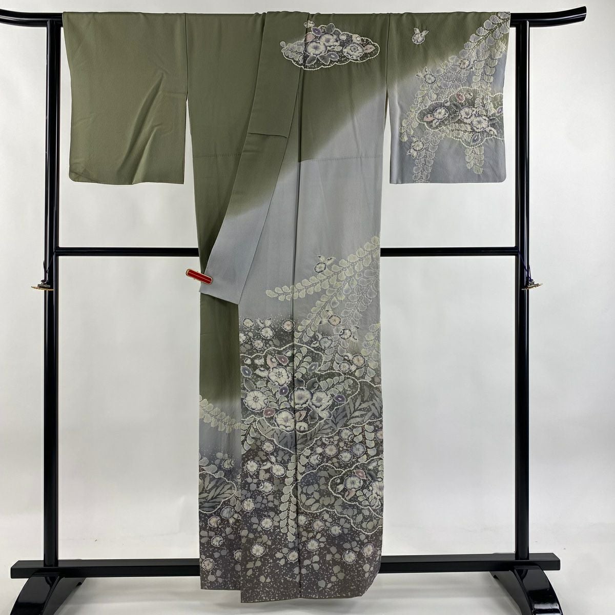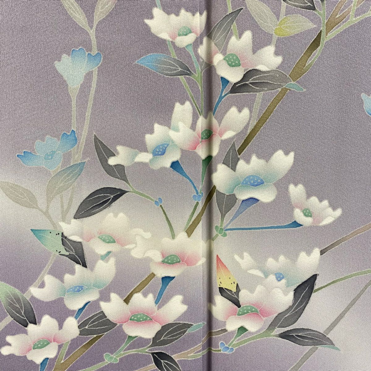 付下げ 身丈155.5cm 裄丈64cm M 袷 鶴見保次 落款あり 枝花 雪輪 ぼかし 青灰色 正絹 逸品 一つ紋