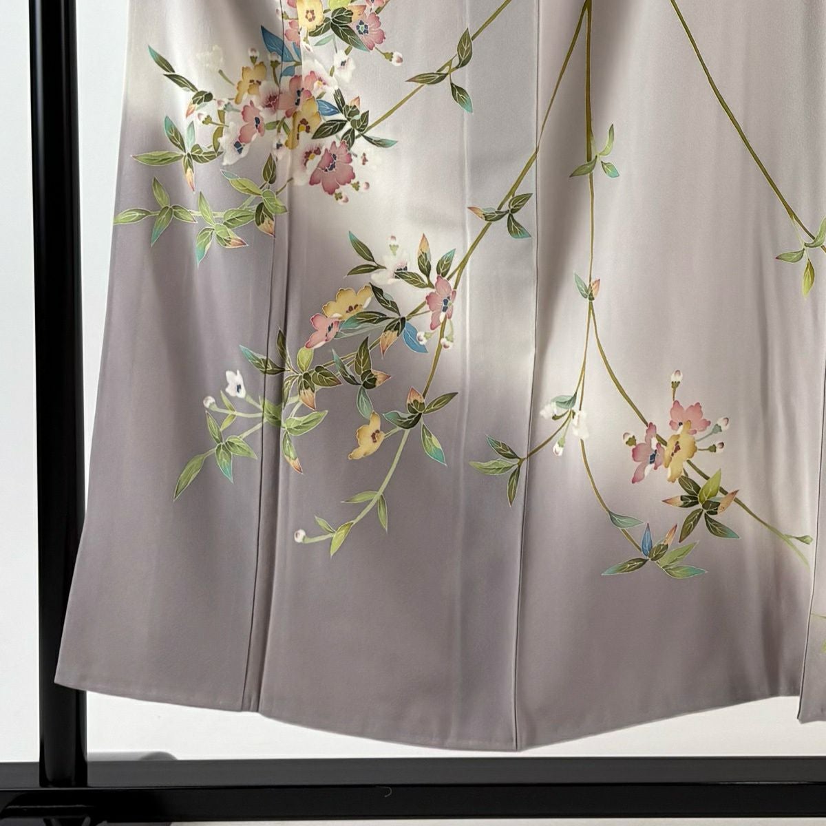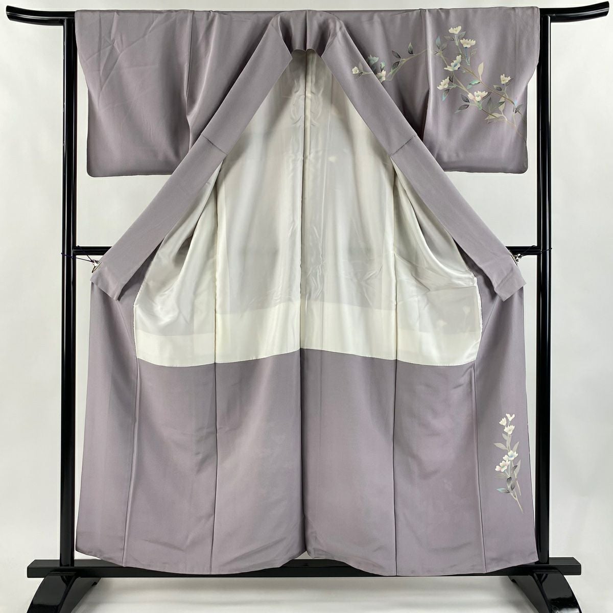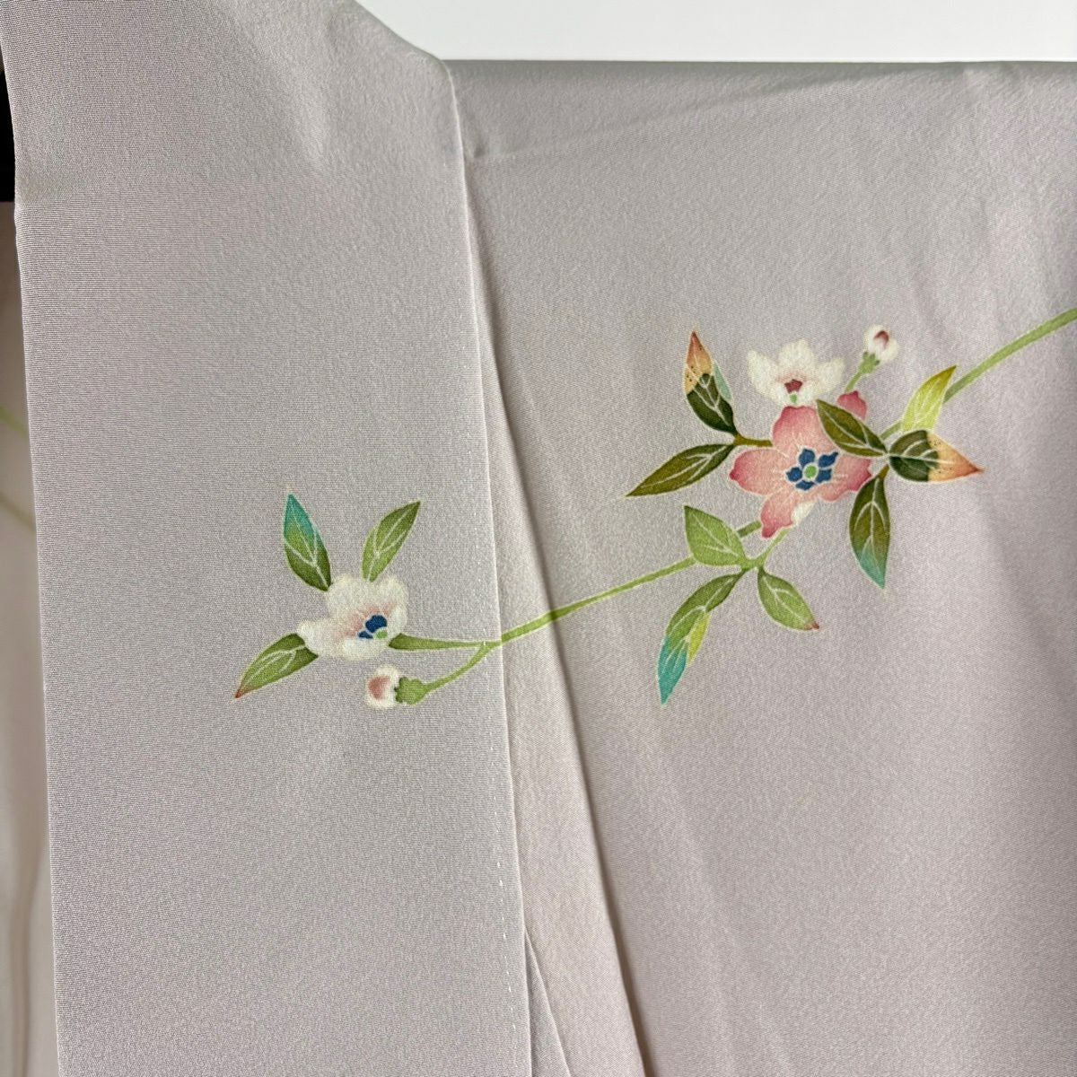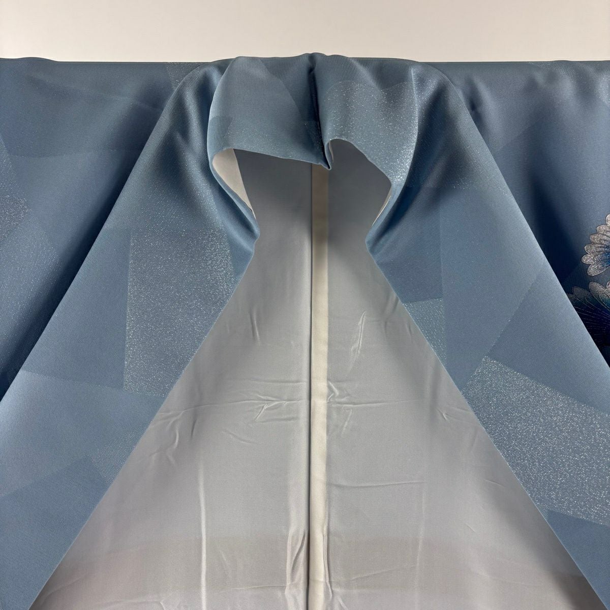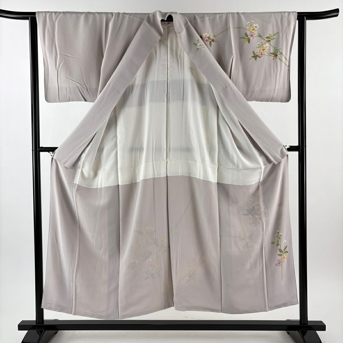 付下げ 身丈155.5cm 裄丈64cm M 袷 鶴見保次 落款あり 枝花 雪輪 ぼかし 青灰色 正絹 逸品 一つ紋