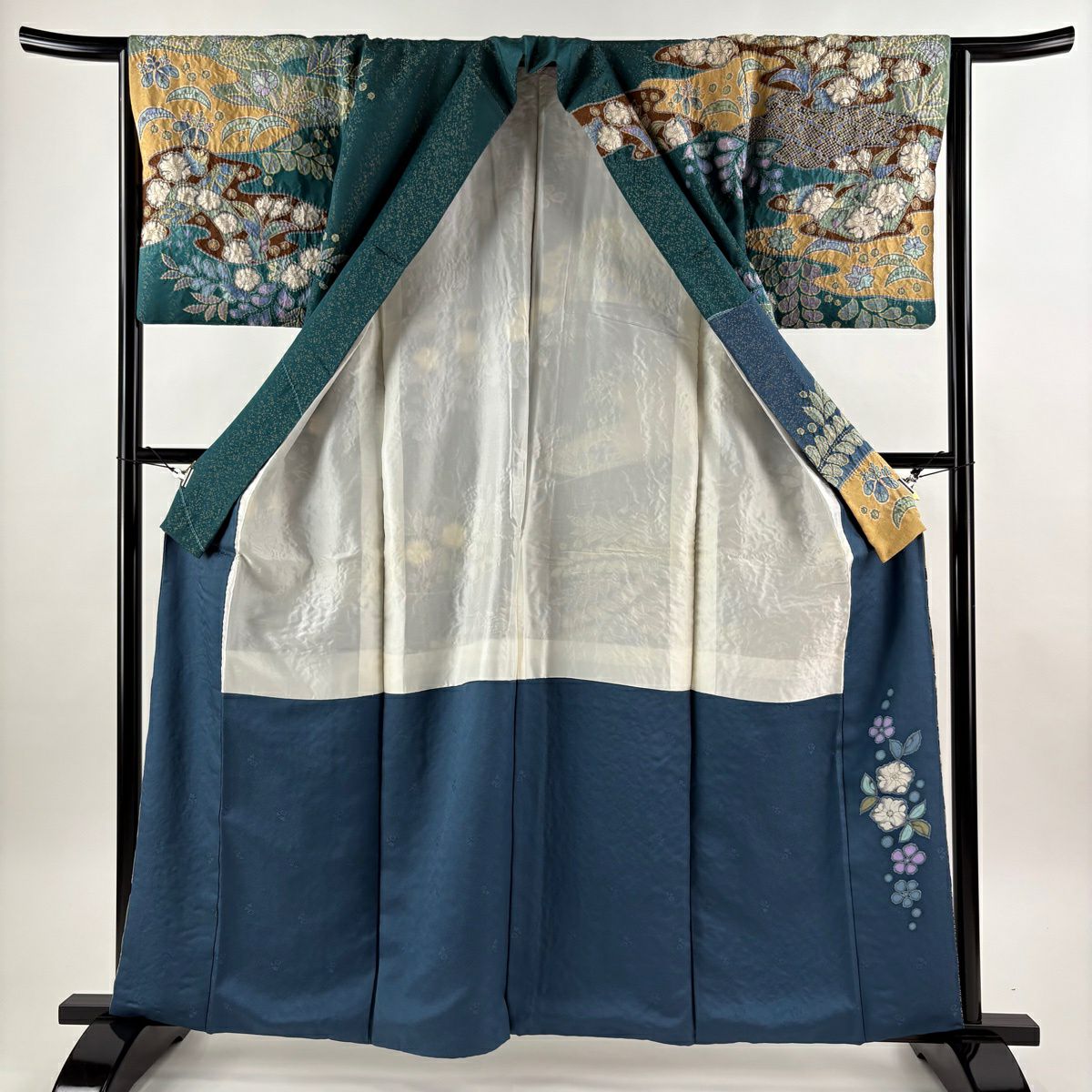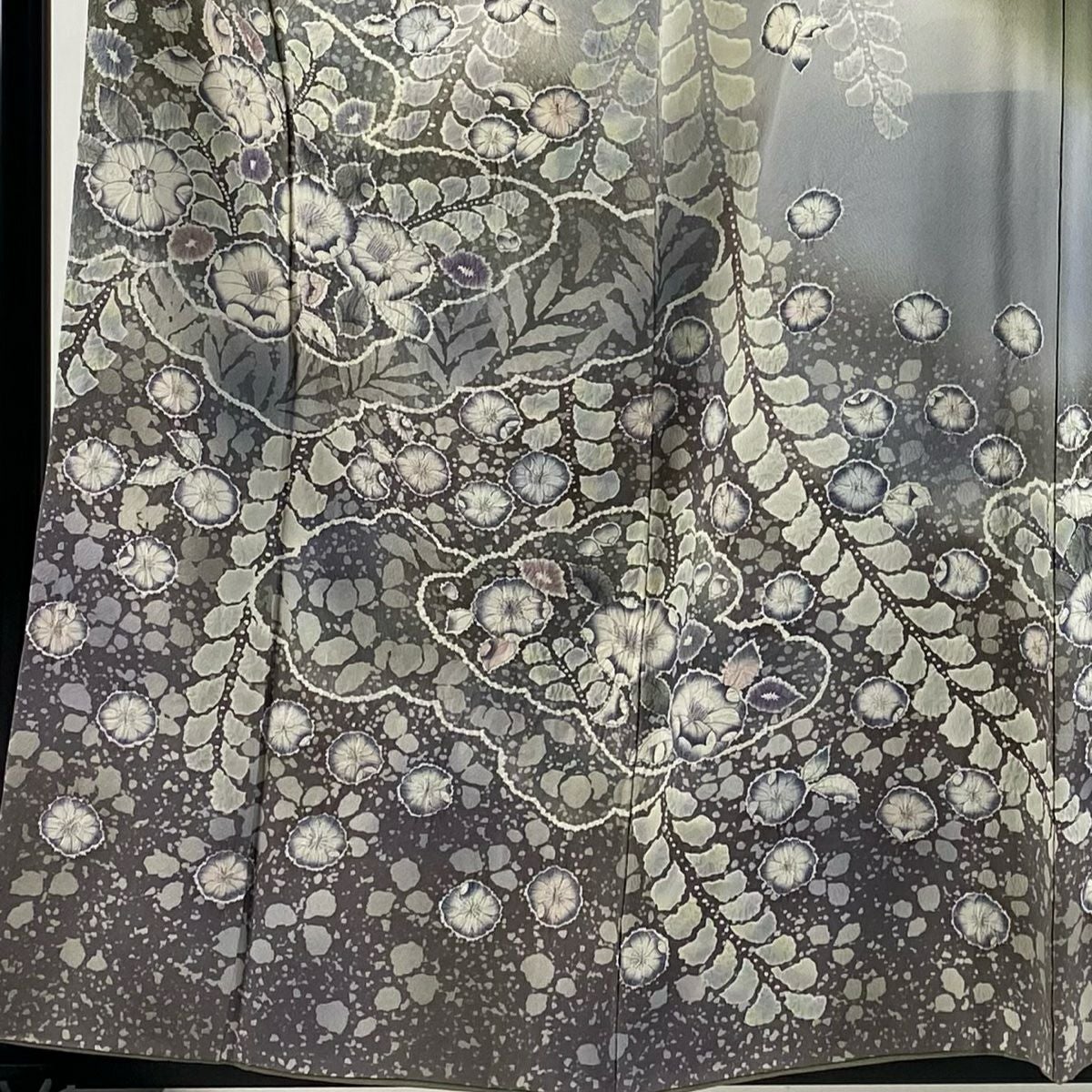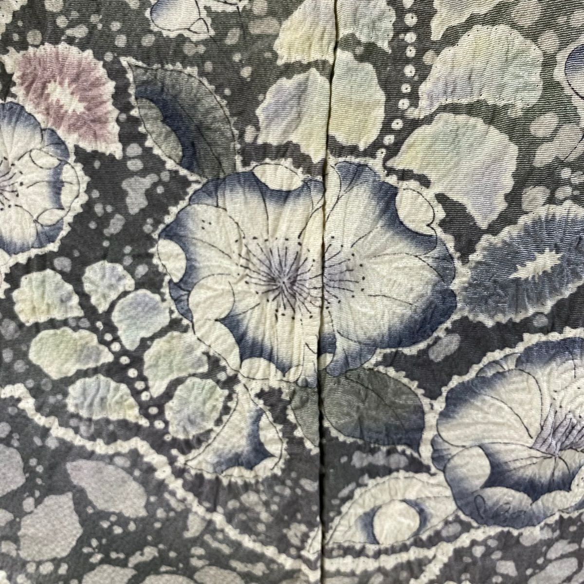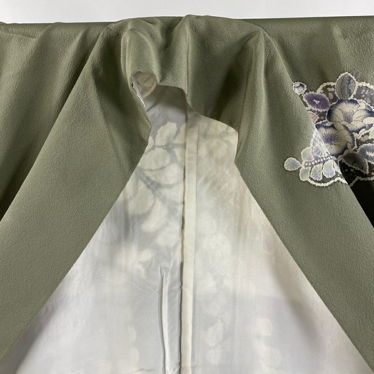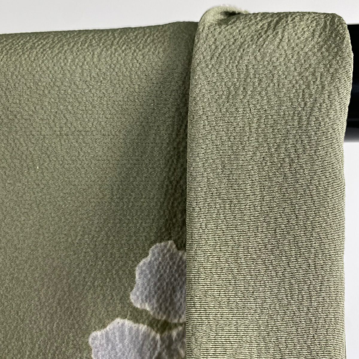 付下げ 身丈155.5cm 裄丈64cm M 袷 鶴見保次 落款あり 枝花 雪輪 ぼかし 青灰色 正絹 逸品 一つ紋