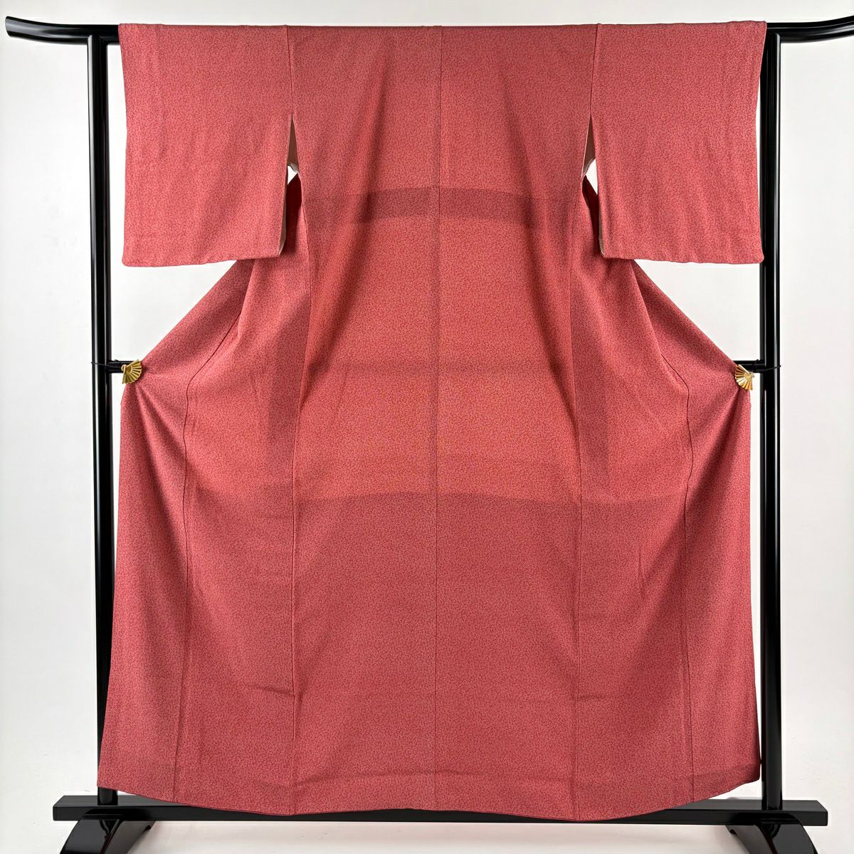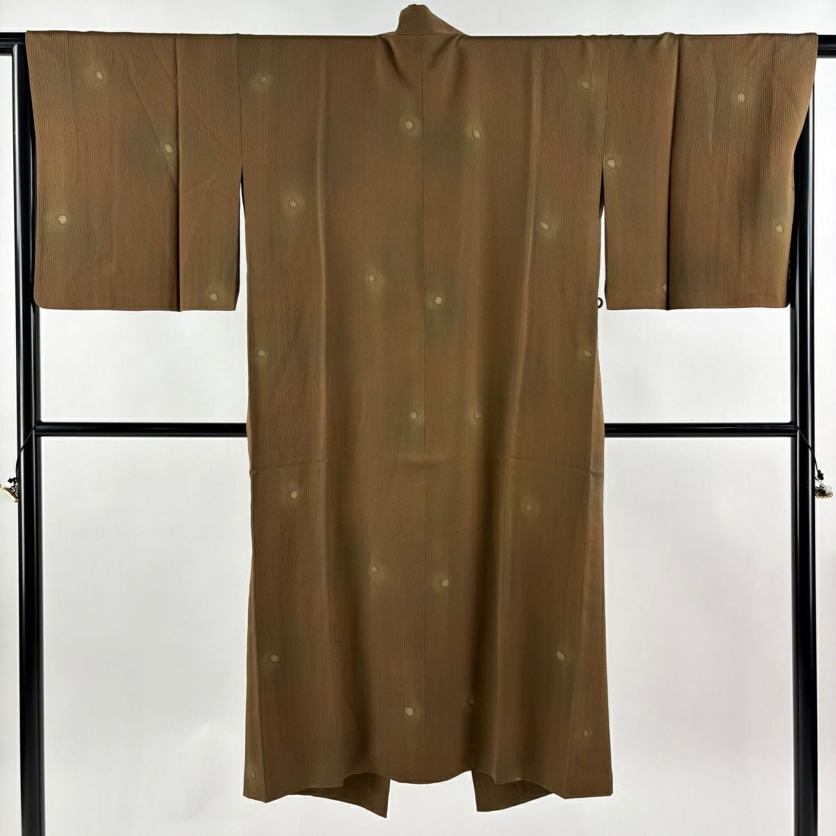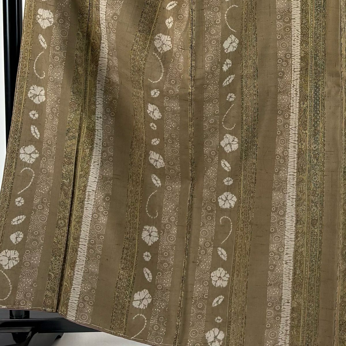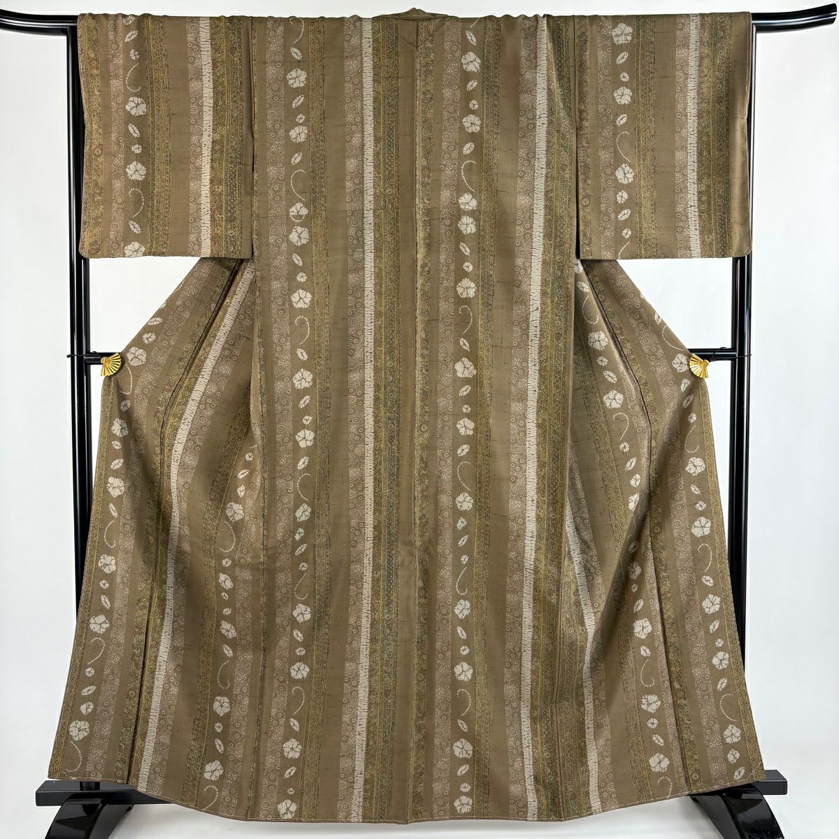 【美品】 小紋 身丈162.5cm 裄丈67cm M 袷 吉澤与市 紬地 証紙あり 縞 草花 絞り 茶色 正絹 逸品