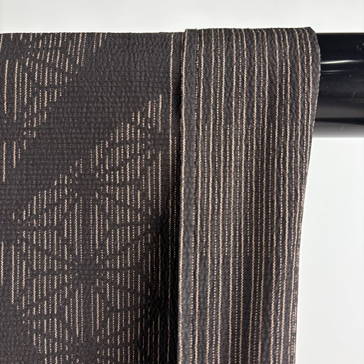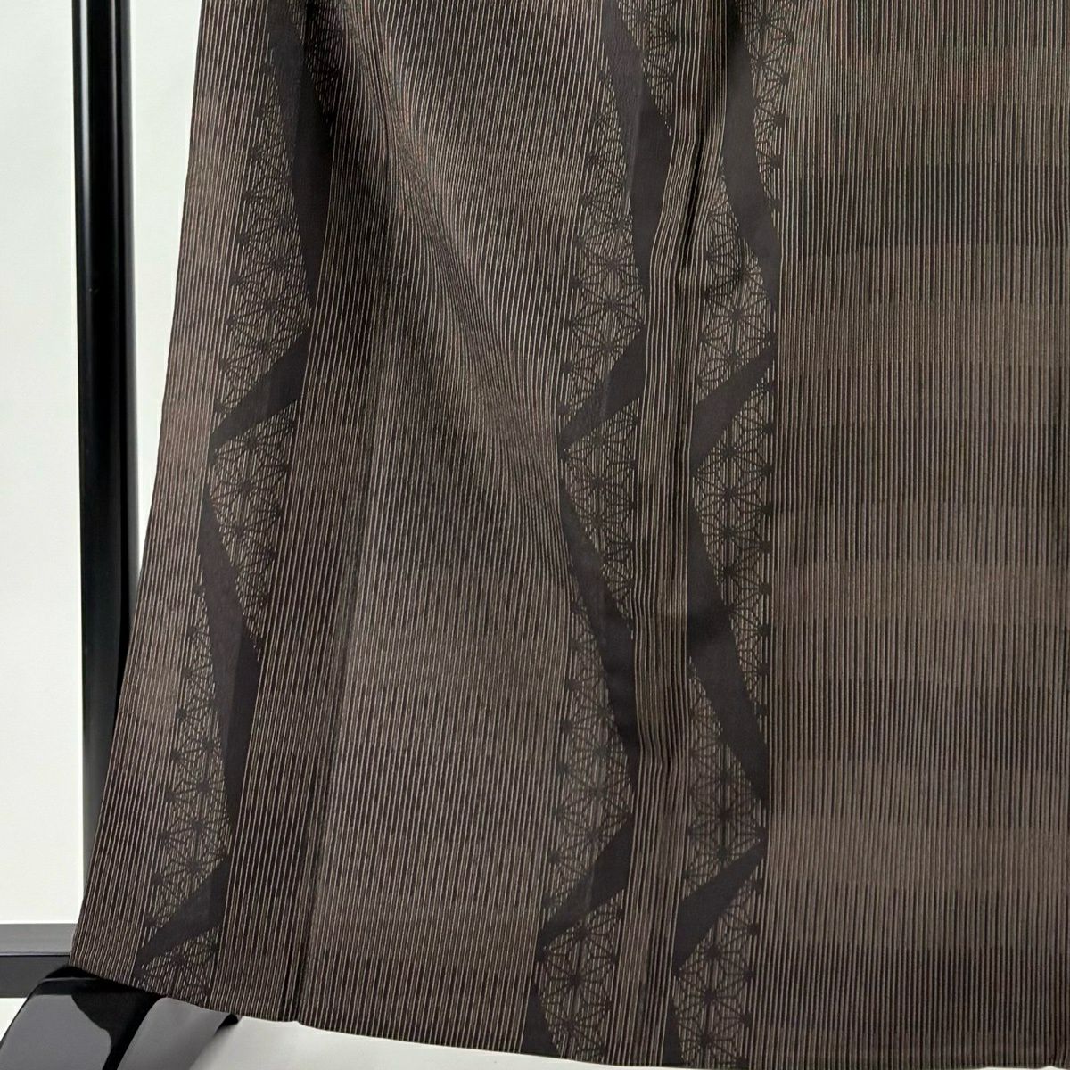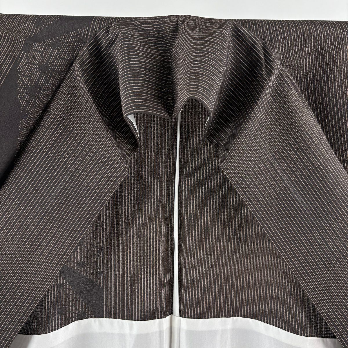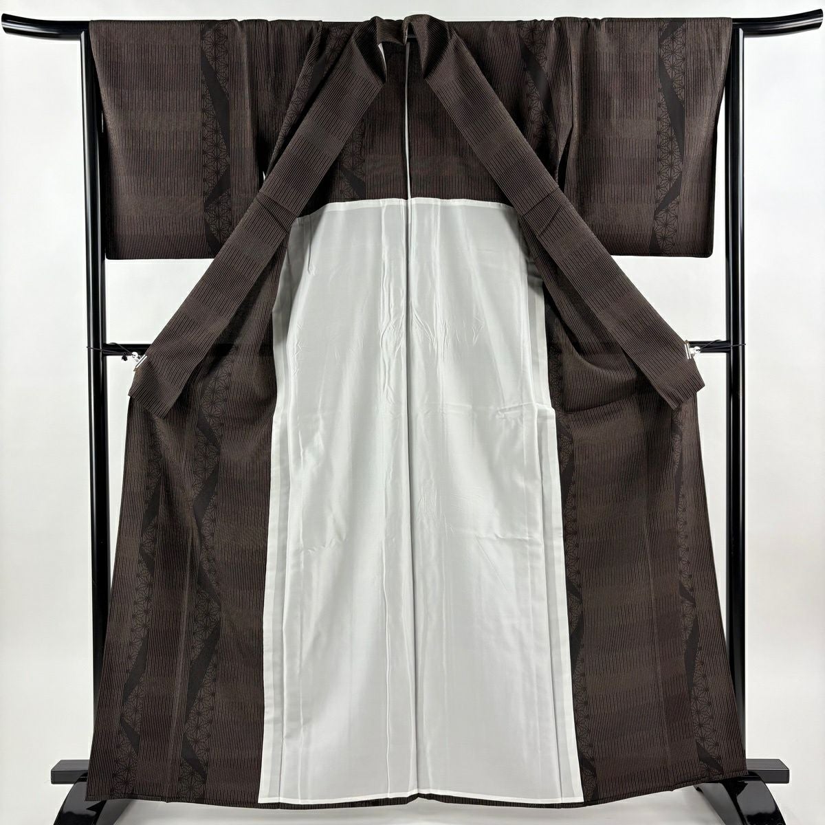 お召 身丈163cm 裄丈65.5cm M 単衣 白川貞夫 落款あり 証紙あり 縞 麻の葉 柿渋染 焦茶色 正絹 逸品