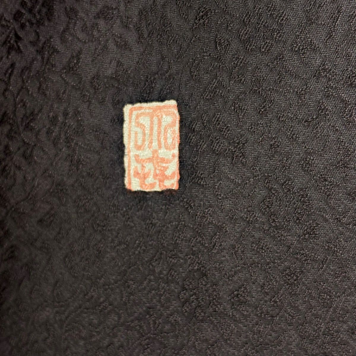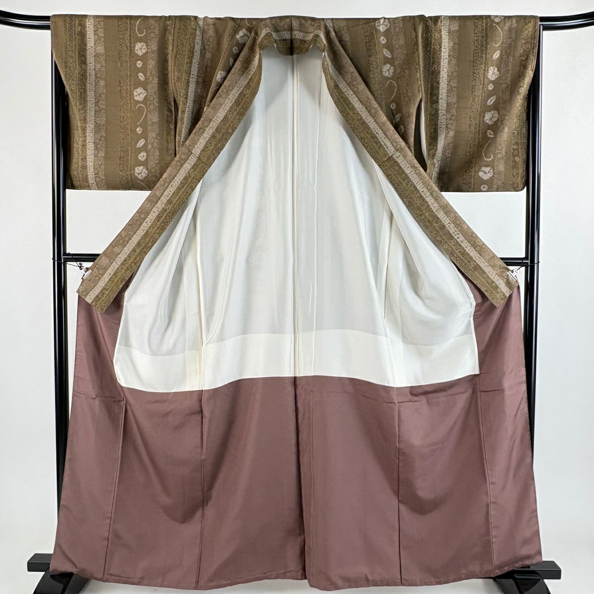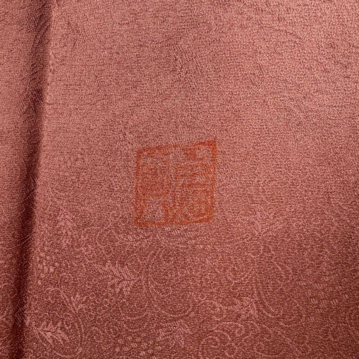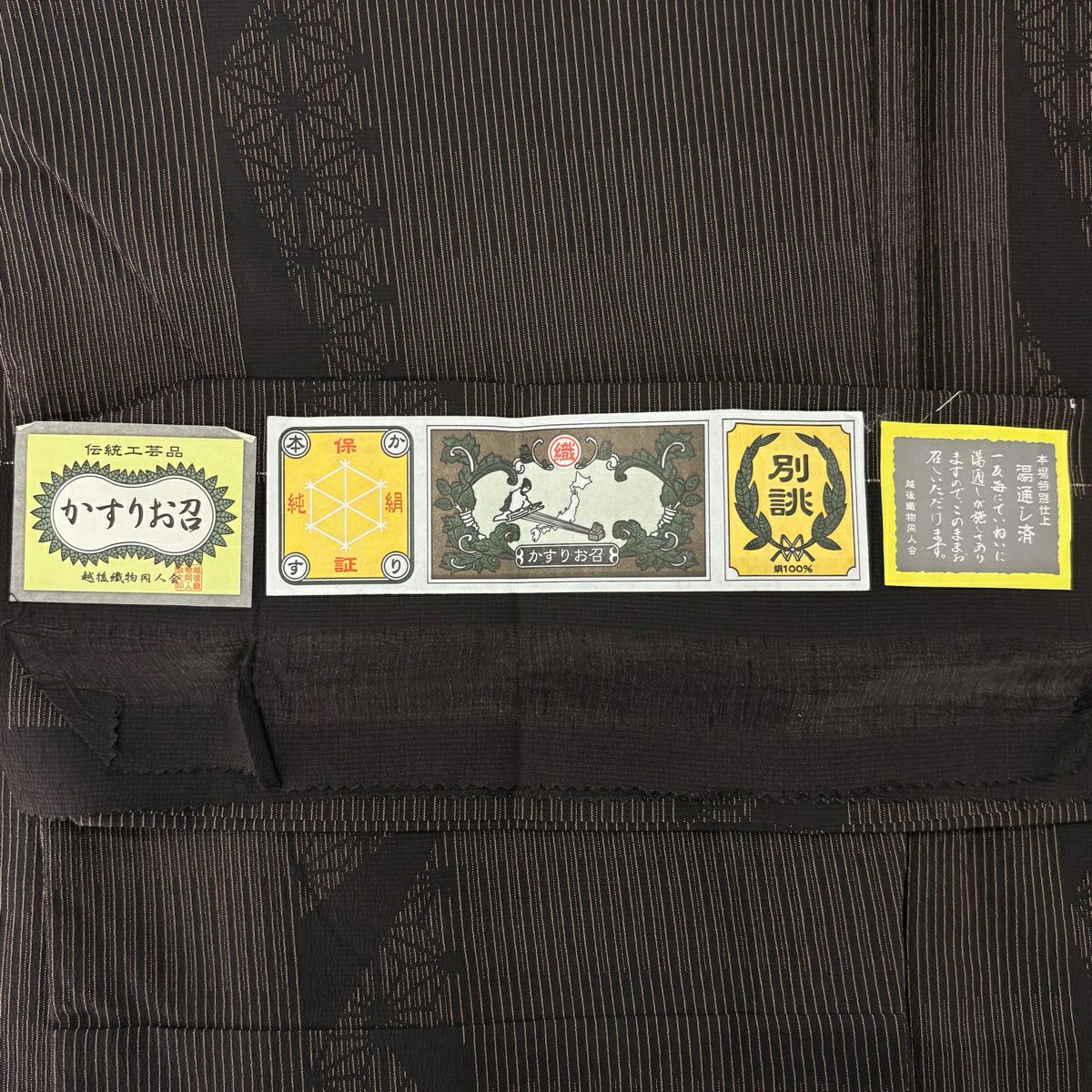 お召 身丈163cm 裄丈65.5cm M 単衣 白川貞夫 落款あり 証紙あり 縞 麻の葉 柿渋染 焦茶色 正絹 逸品