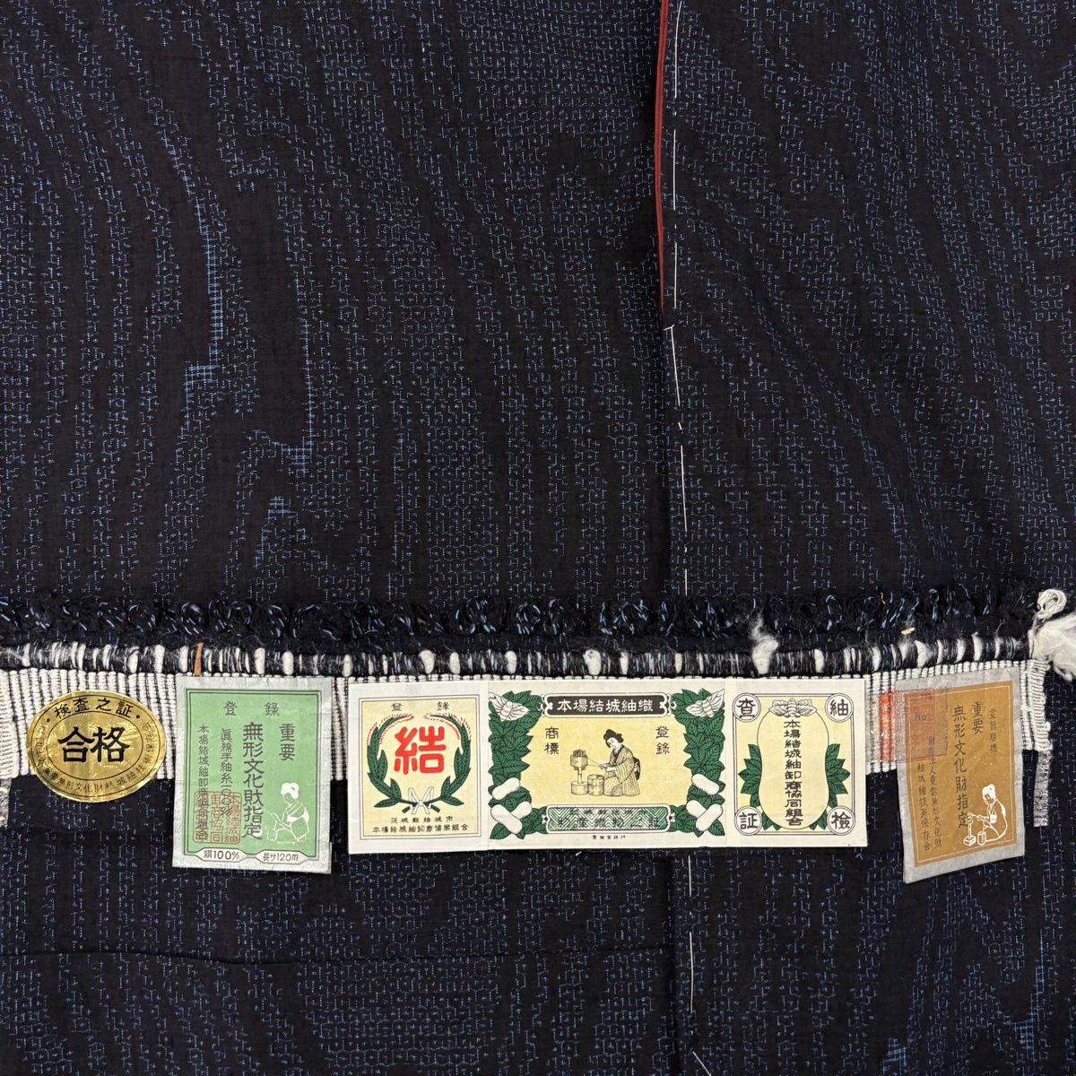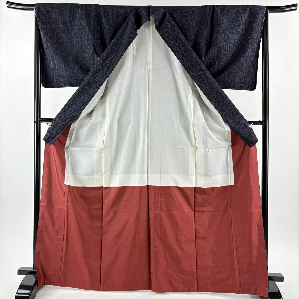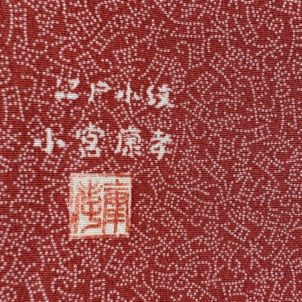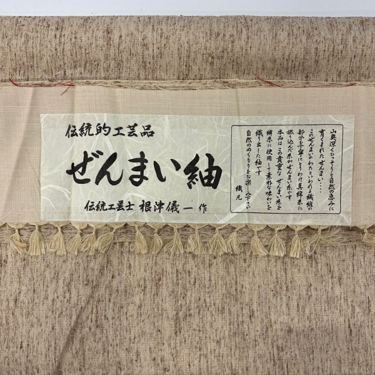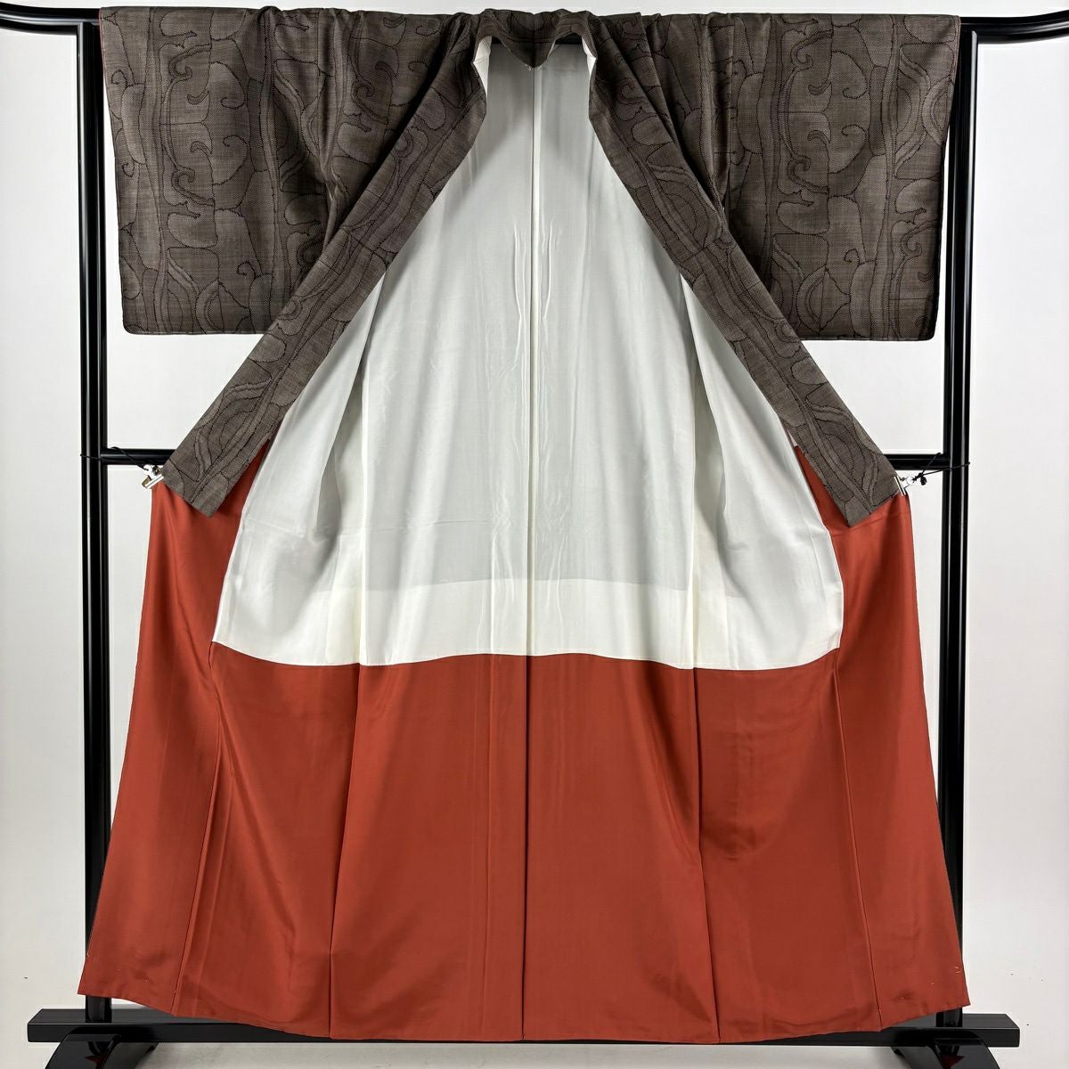 お召 身丈163cm 裄丈65.5cm M 単衣 白川貞夫 落款あり 証紙あり 縞 麻の葉 柿渋染 焦茶色 正絹 逸品