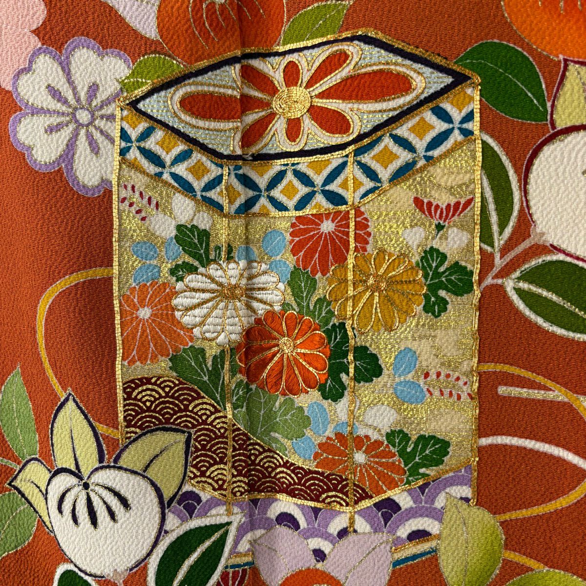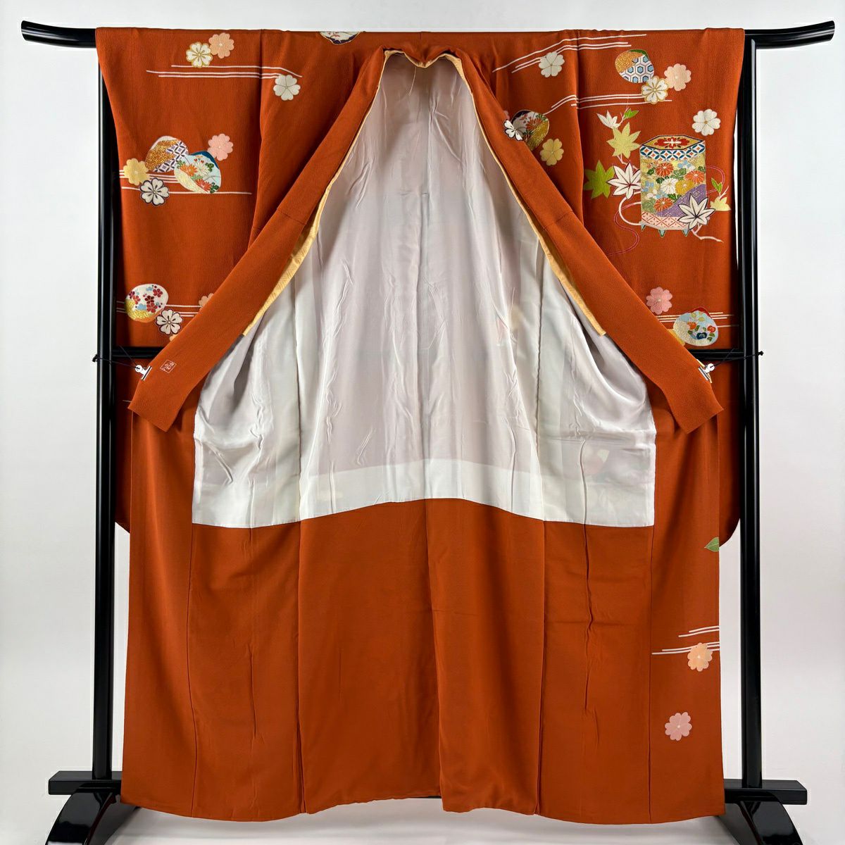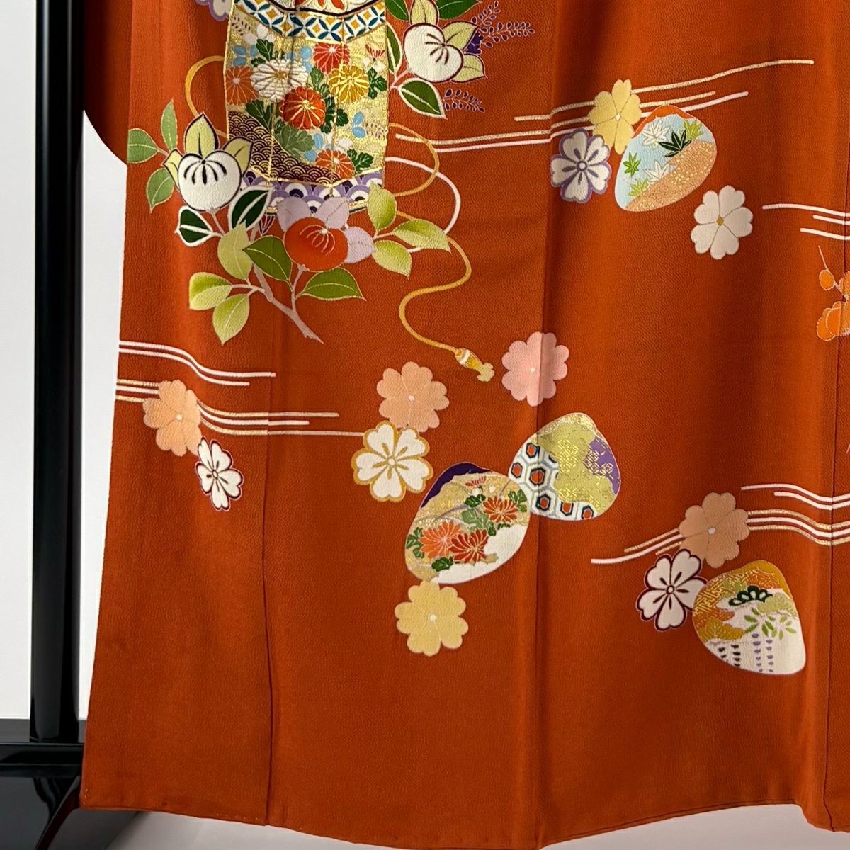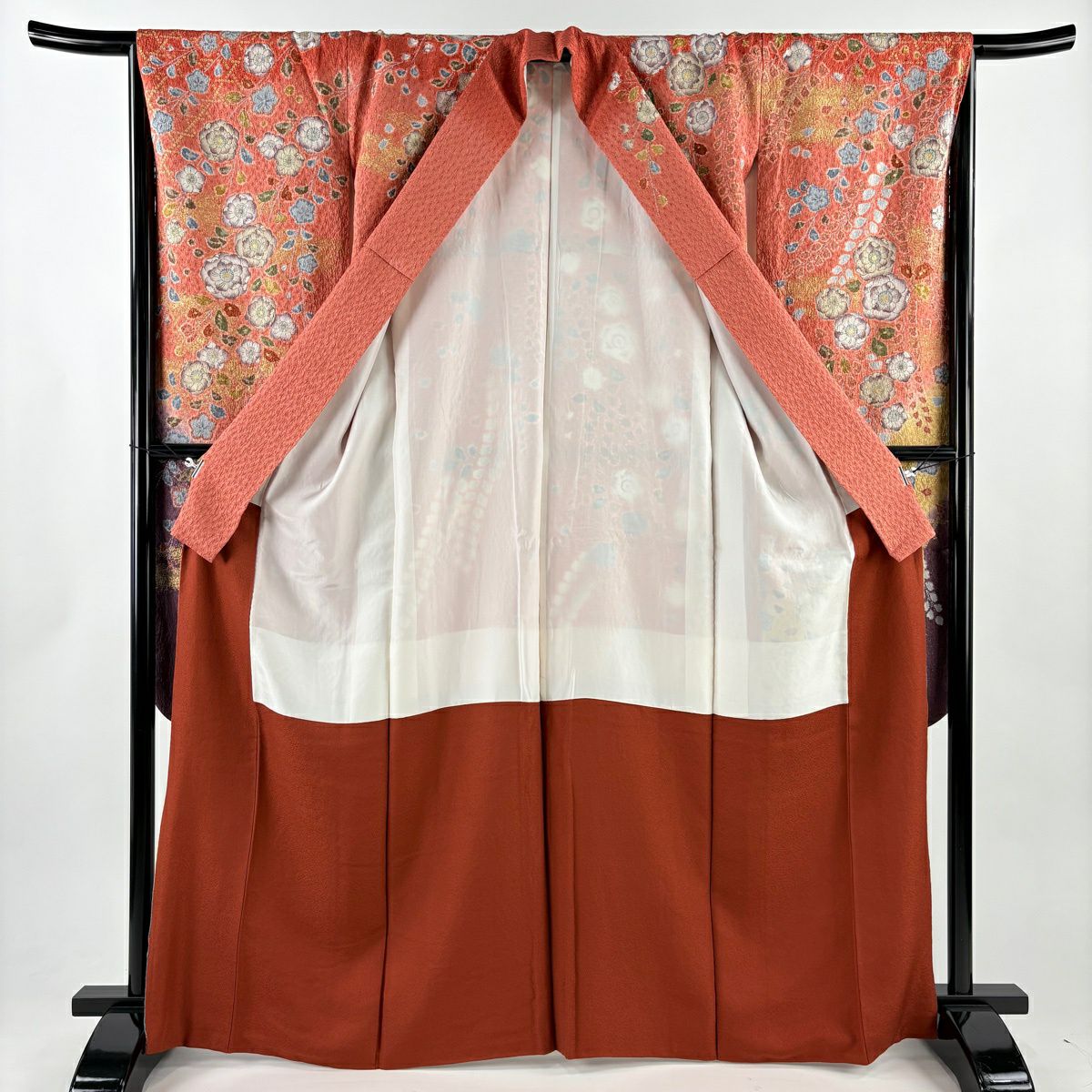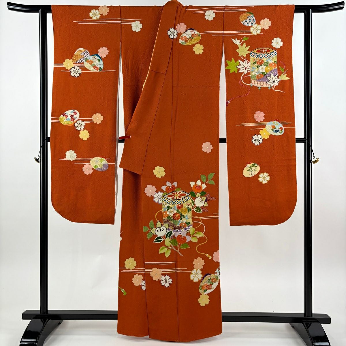 振袖 身丈160.5cm 裄丈65.5cm M 袷 誰が袖好み 落款あり 貝桶 橘 刺繍 金銀彩 オレンジ 正絹 逸品