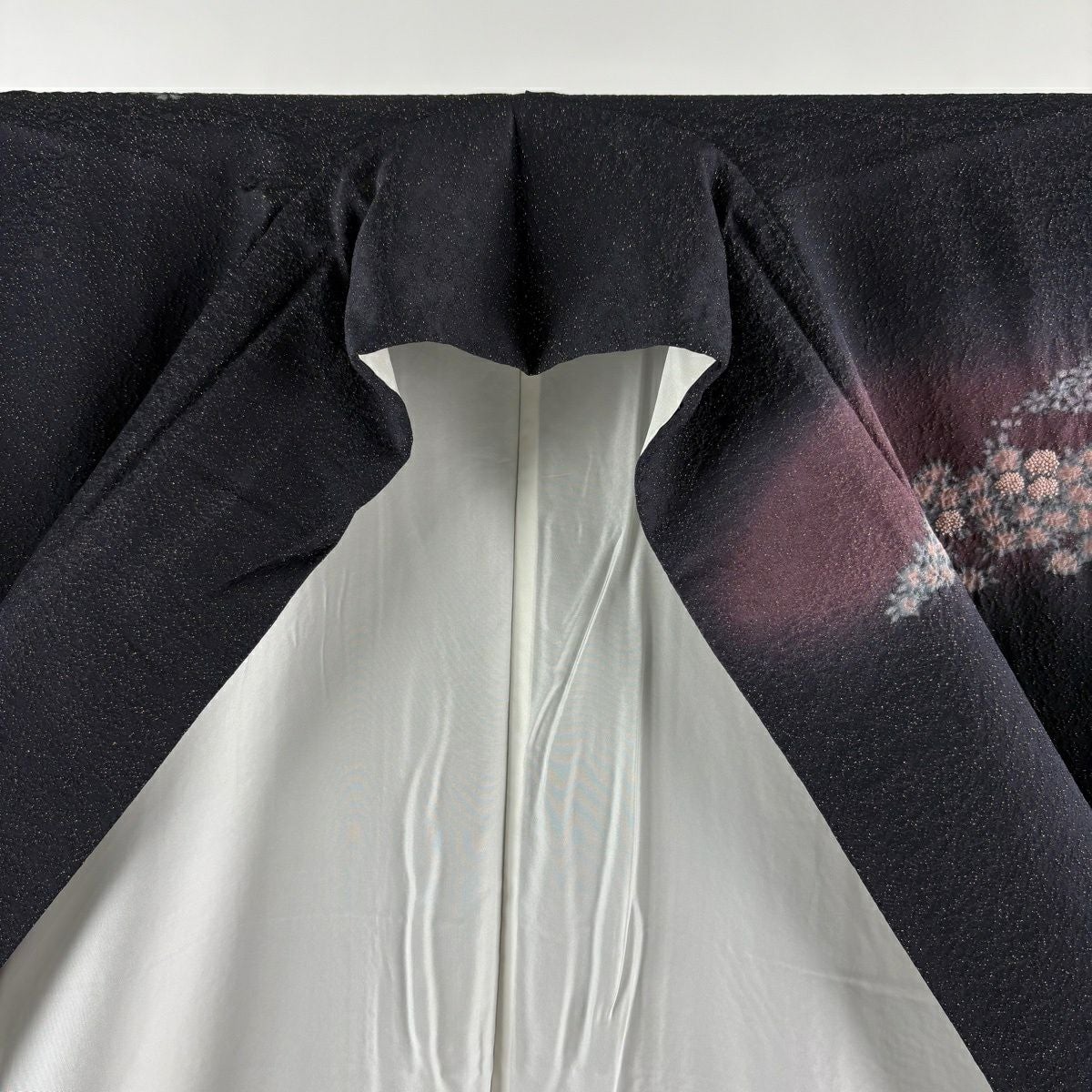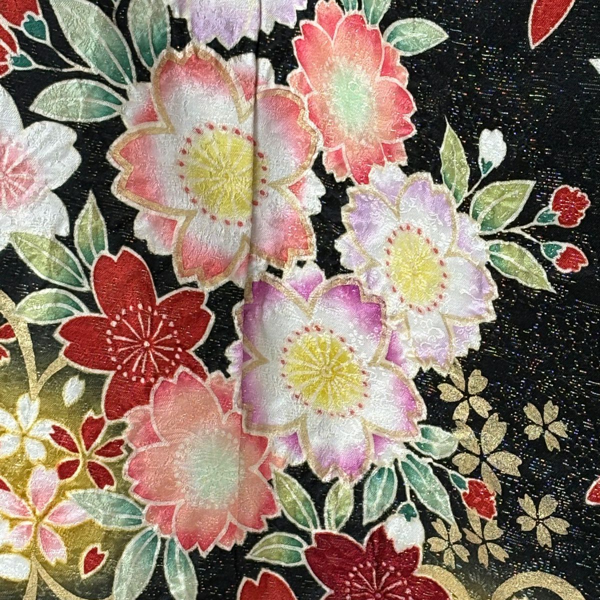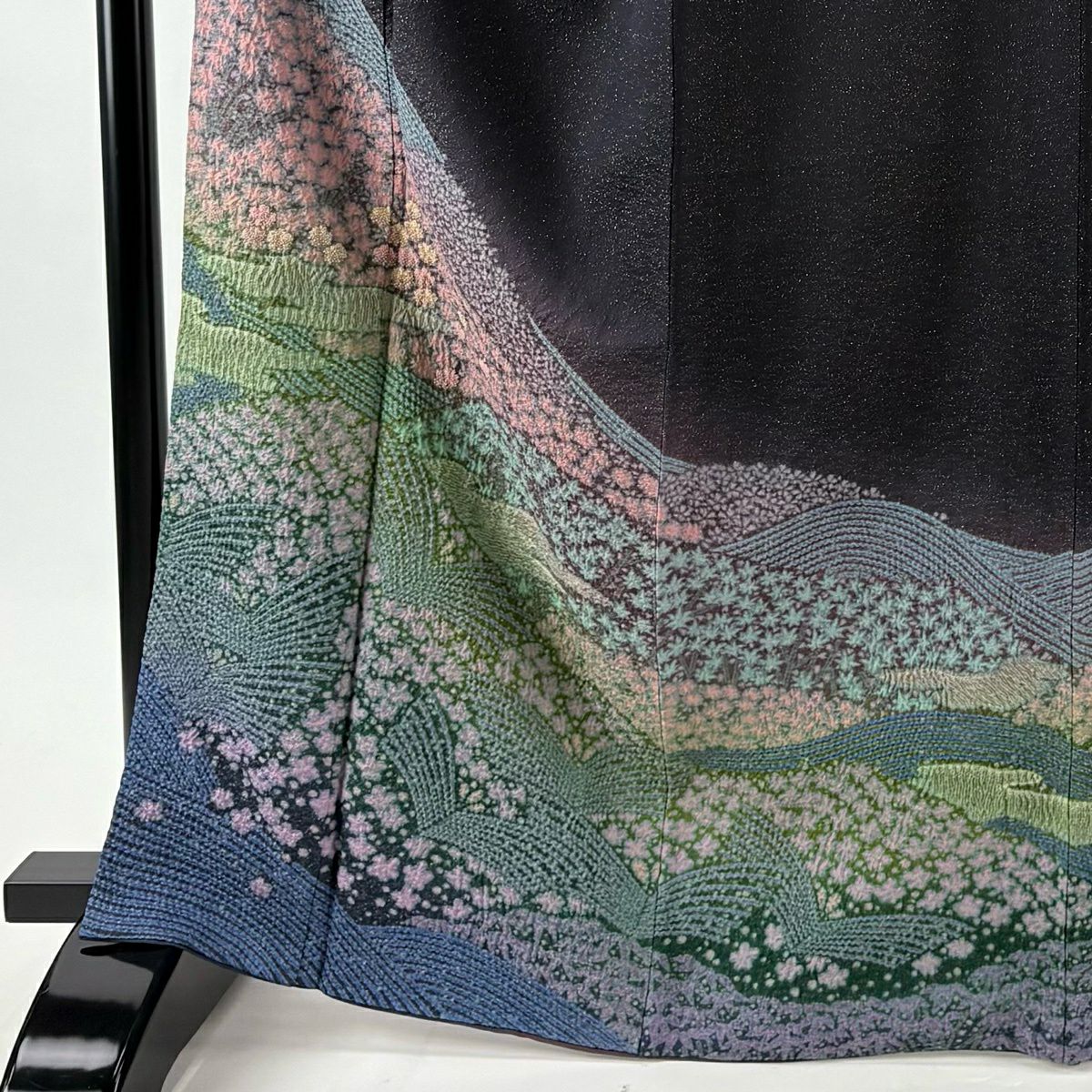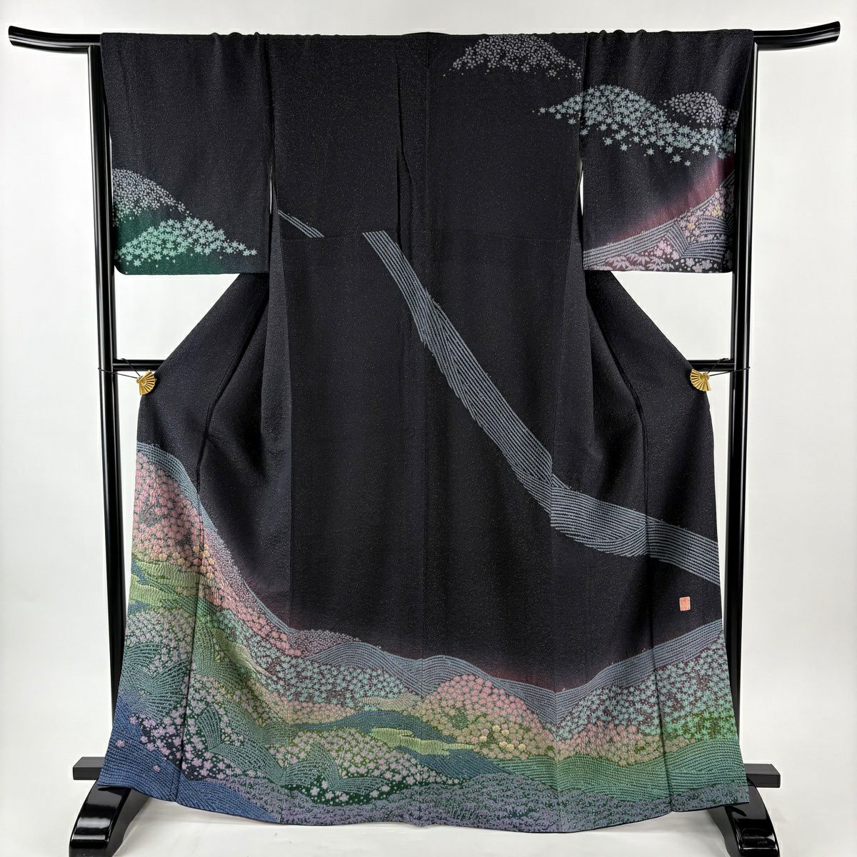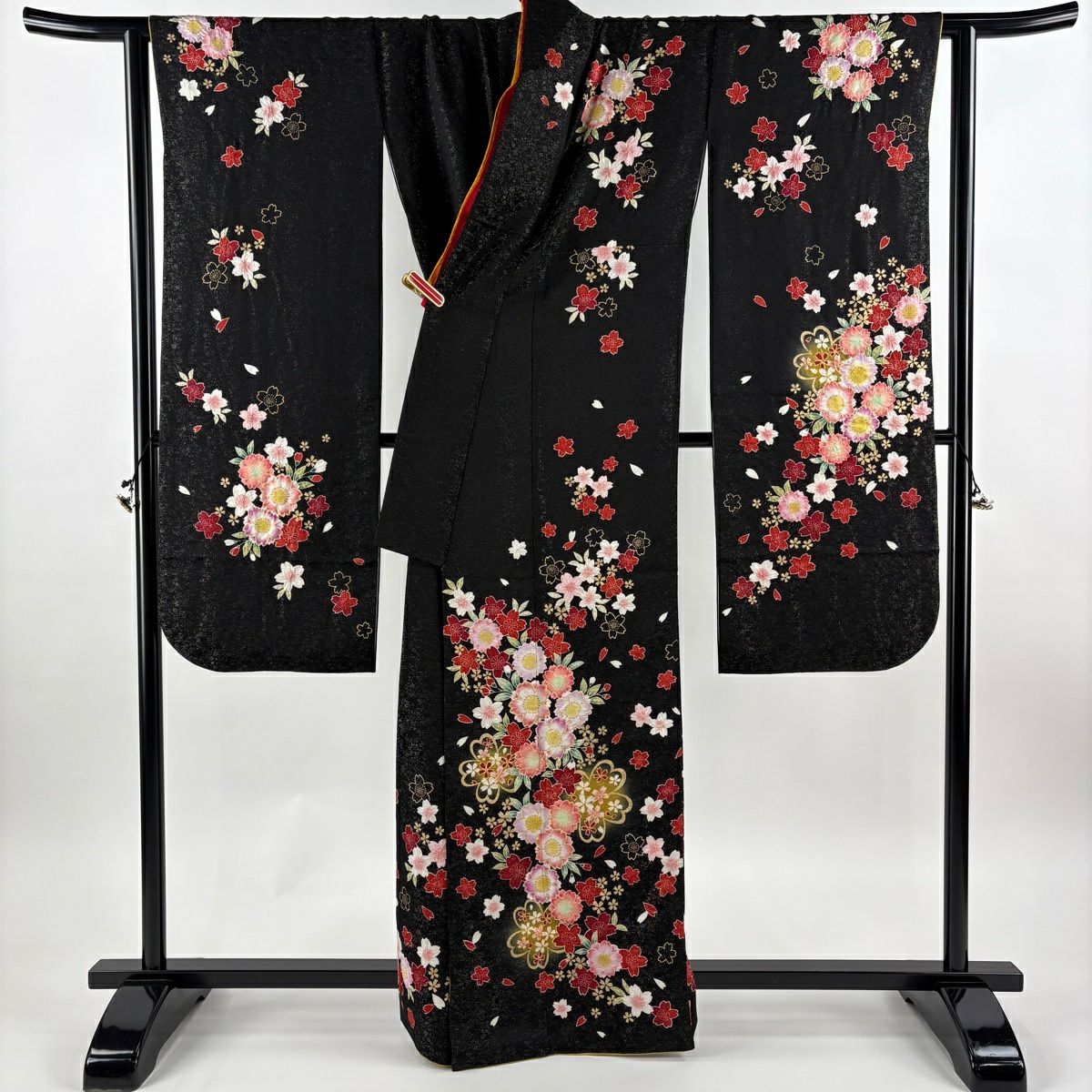 【美品】 振袖 身丈163cm 裄丈67.5cm L 袷 徳永憲峯 落款あり 桜 花びら 金通し 金彩 黒 正絹 逸品