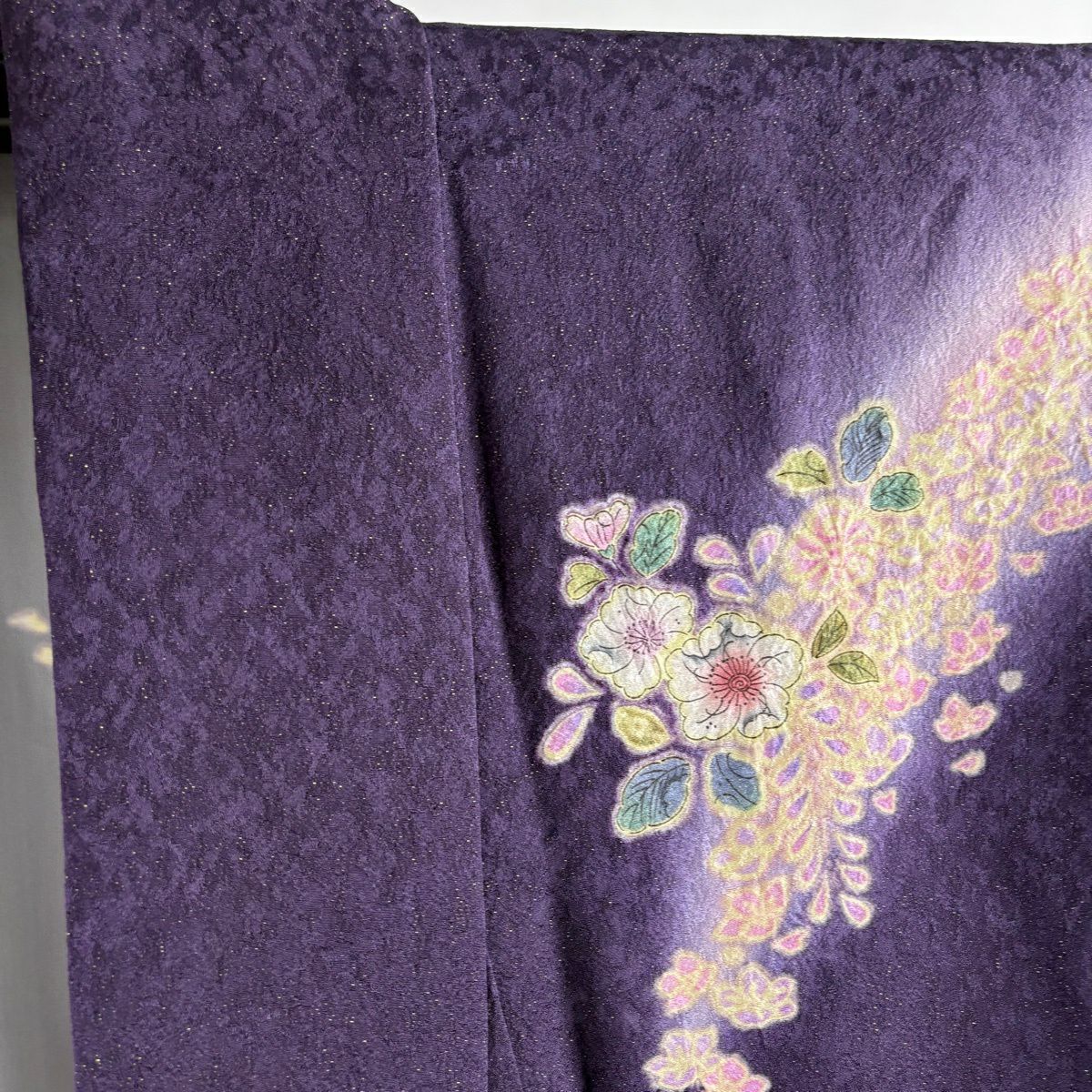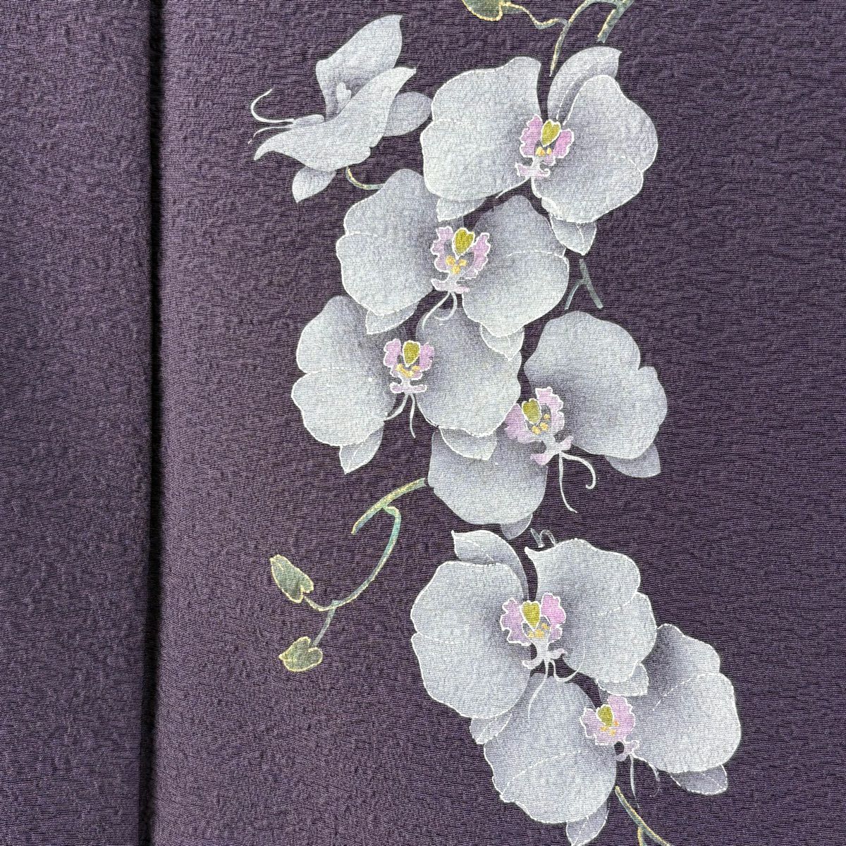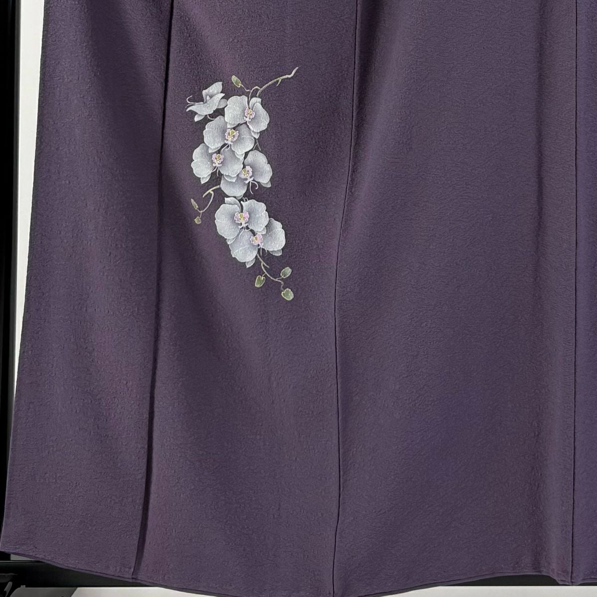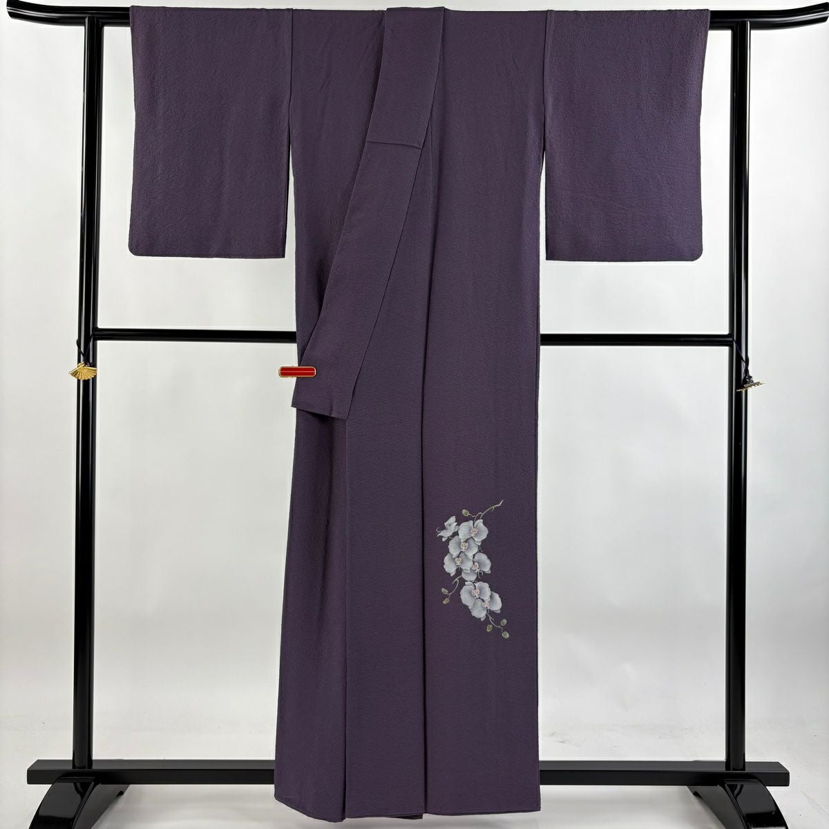 【在庫一掃】 付下げ 身丈157cm 裄丈63cm S 袷 菅有鬼一 落款あり 胡蝶蘭 地紋 金彩 紫 正絹 逸品