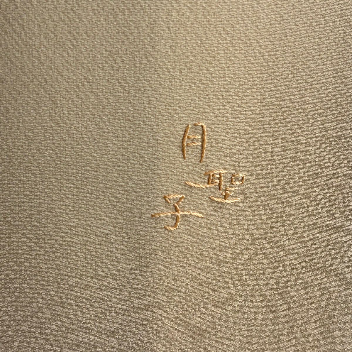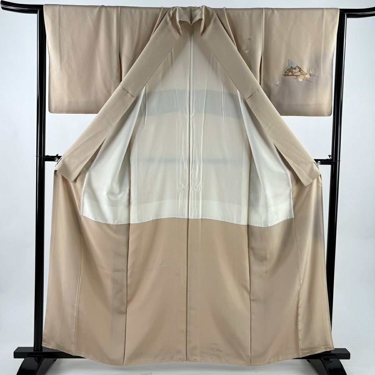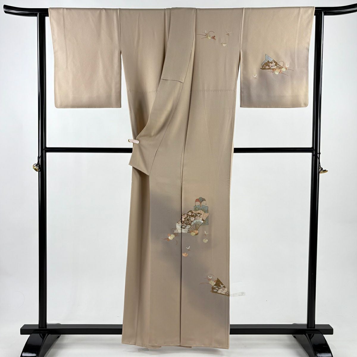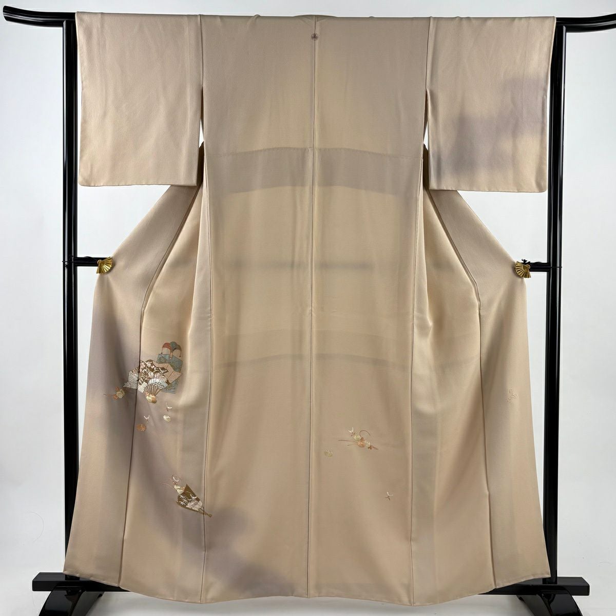 付下げ 身丈161cm 裄丈64cm M 袷 月聖子 落款あり 扇 菊 金糸 刺繍 ベージュ 正絹 逸品 一つ紋