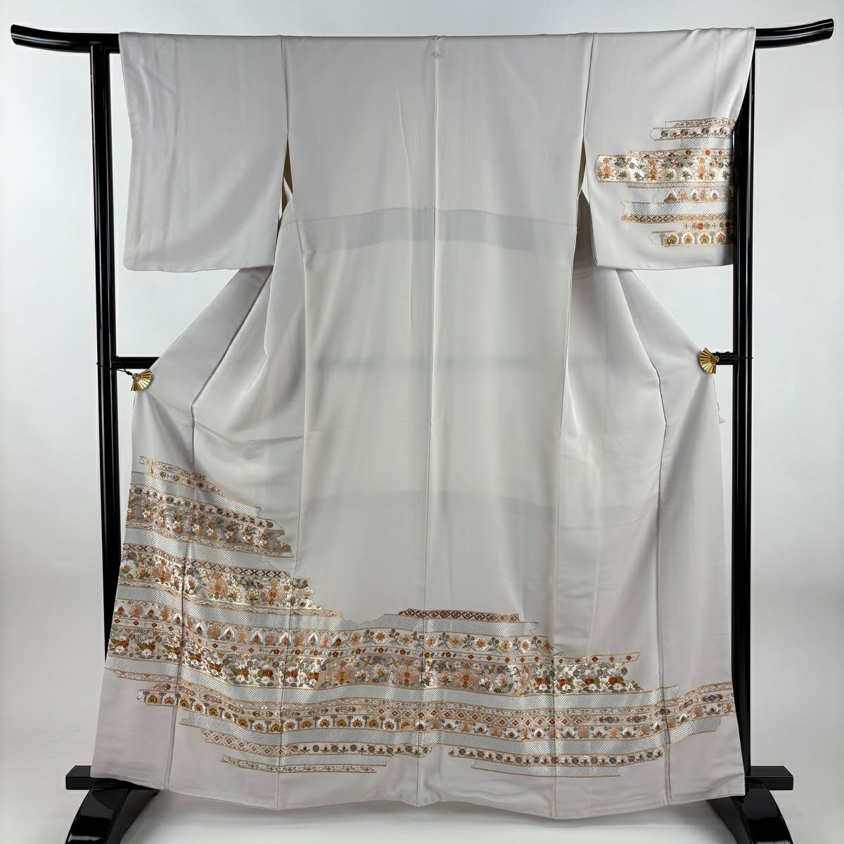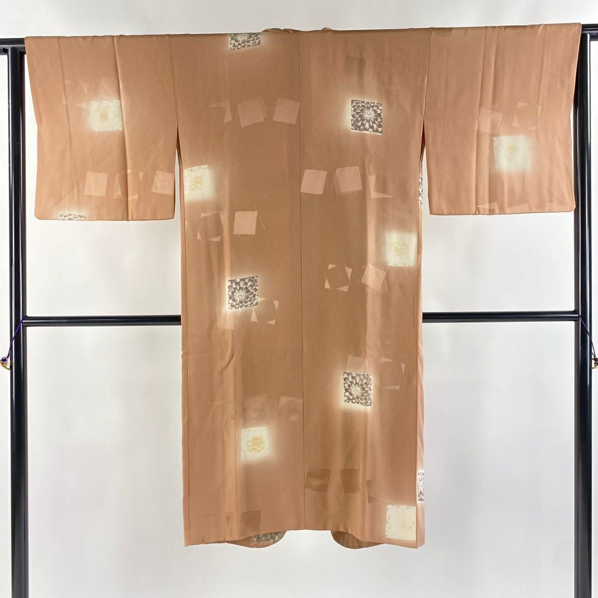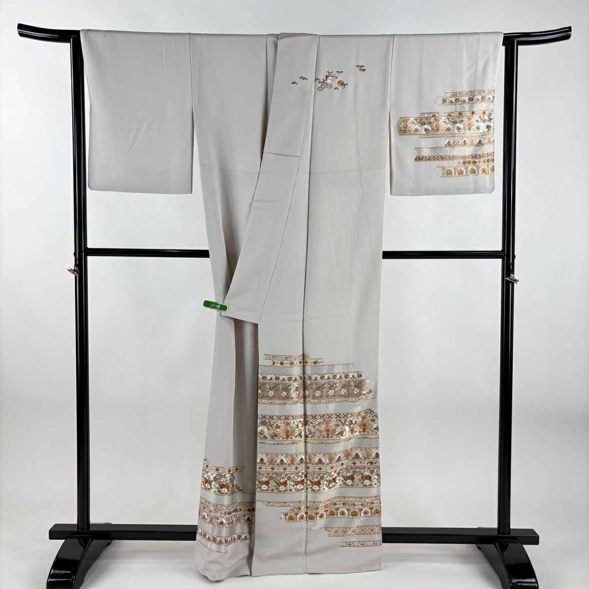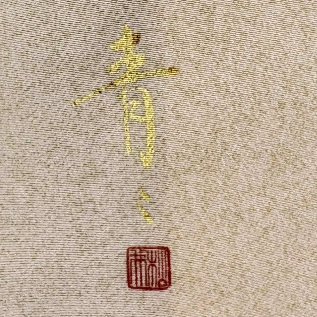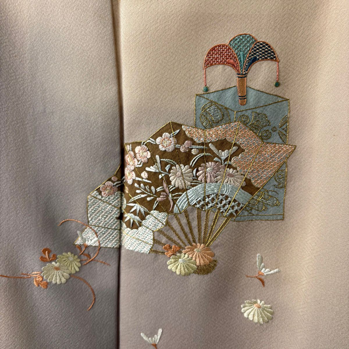 付下げ 身丈161cm 裄丈64cm M 袷 月聖子 落款あり 扇 菊 金糸 刺繍 ベージュ 正絹 逸品 一つ紋