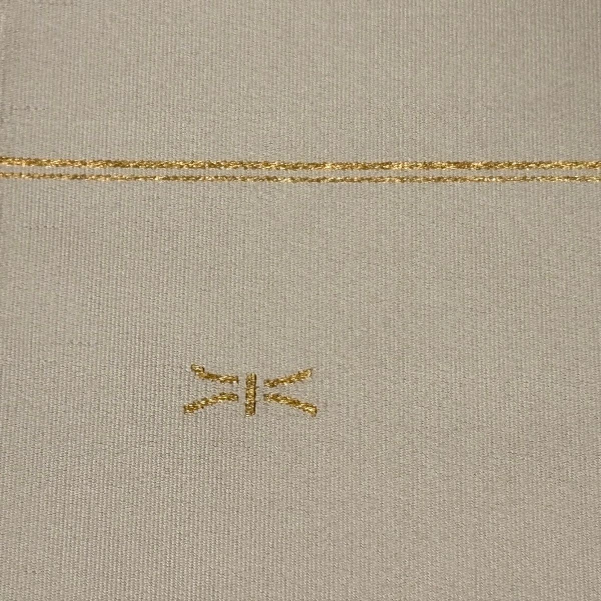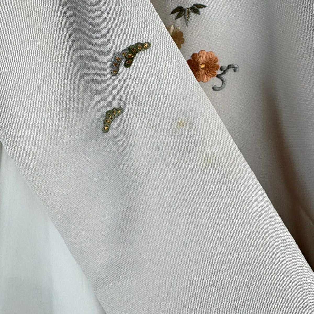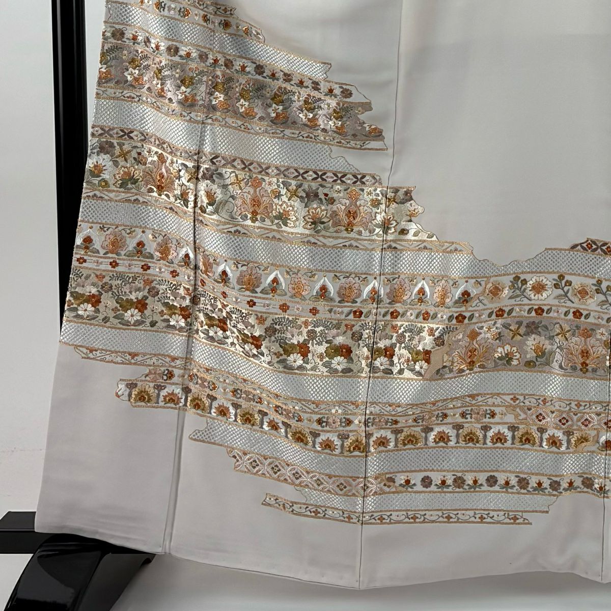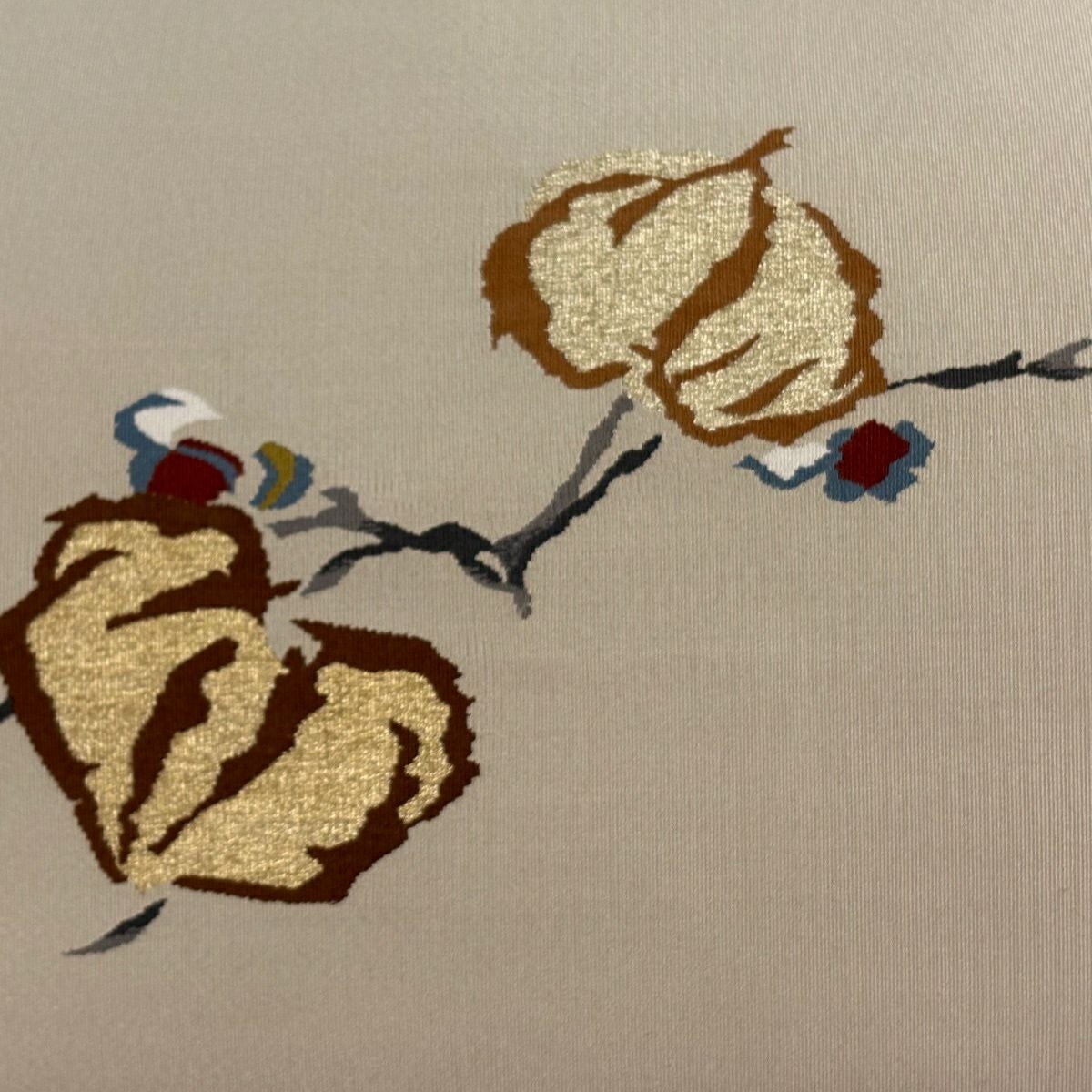 付下げ 身丈161cm 裄丈64cm M 袷 月聖子 落款あり 扇 菊 金糸 刺繍 ベージュ 正絹 逸品 一つ紋