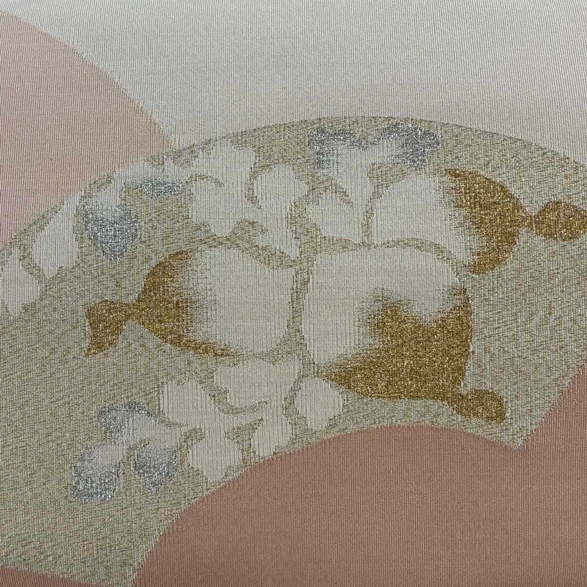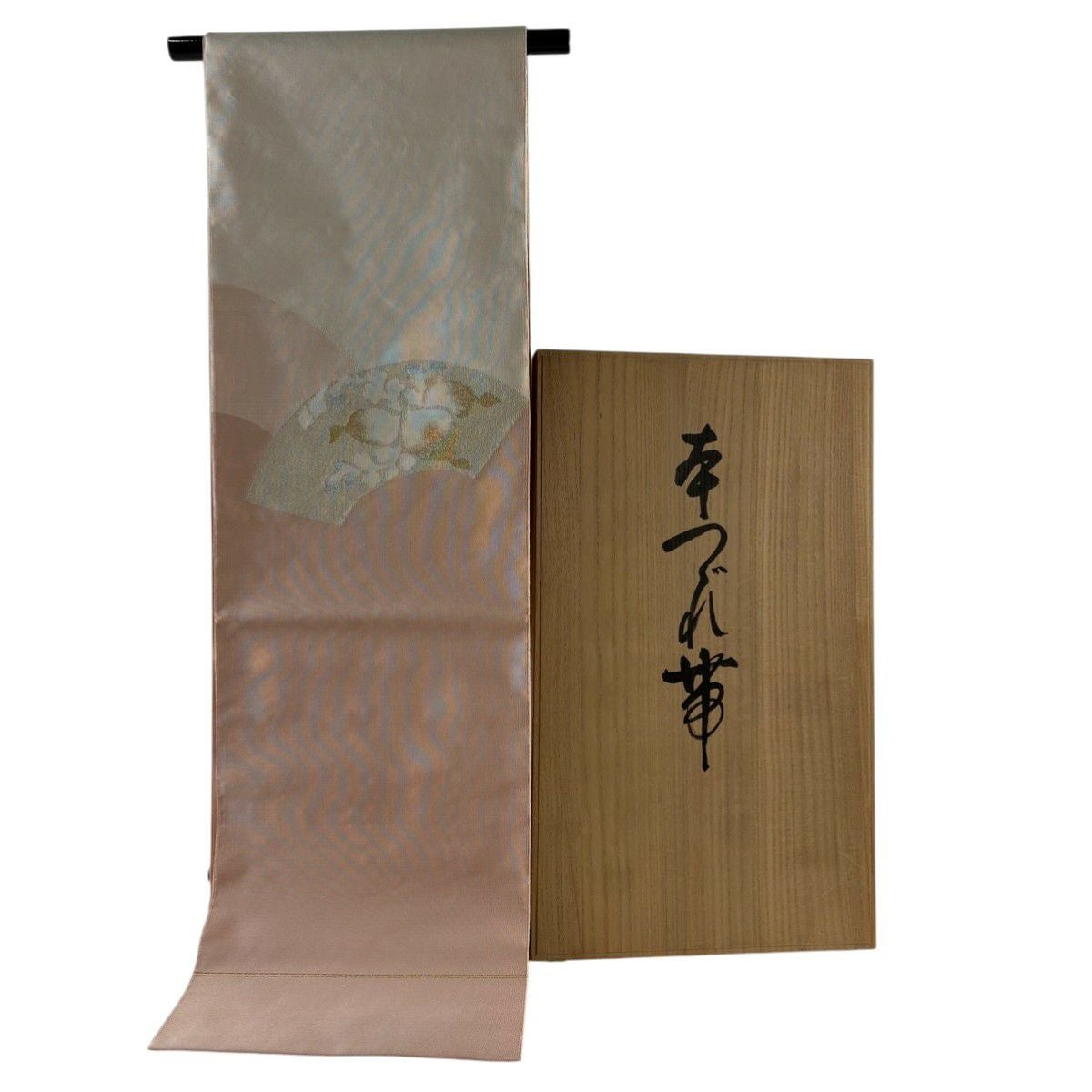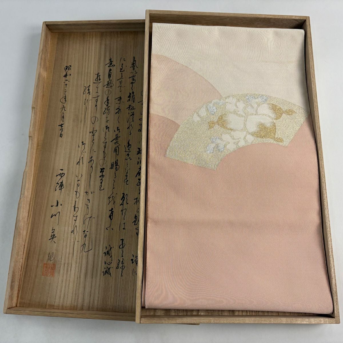 名古屋帯 逸品 落款あり 証紙あり 八寸名古屋帯 松葉仕立て 西陣 小川英 共箱付き 扇面 葉柄 金銀糸 薄ピンク 正絹