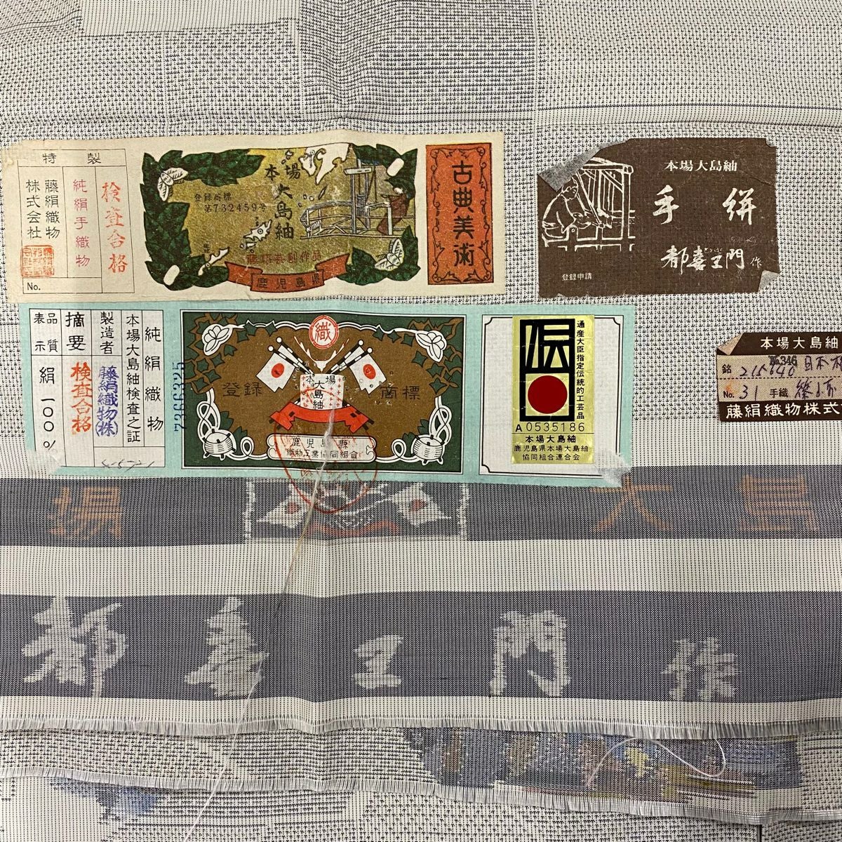 【美品】 大島紬 身丈158.5cm 裄丈65cm M 袷 都喜ヱ門 純泥染 証紙あり 幾何学模様 焦茶色 正絹 逸品
