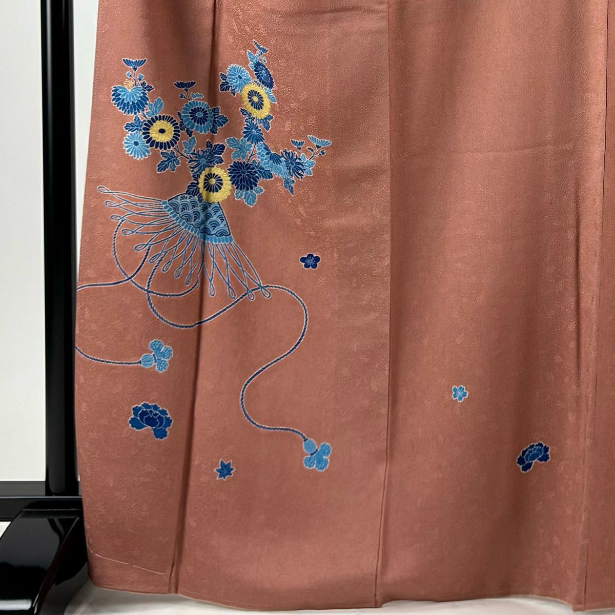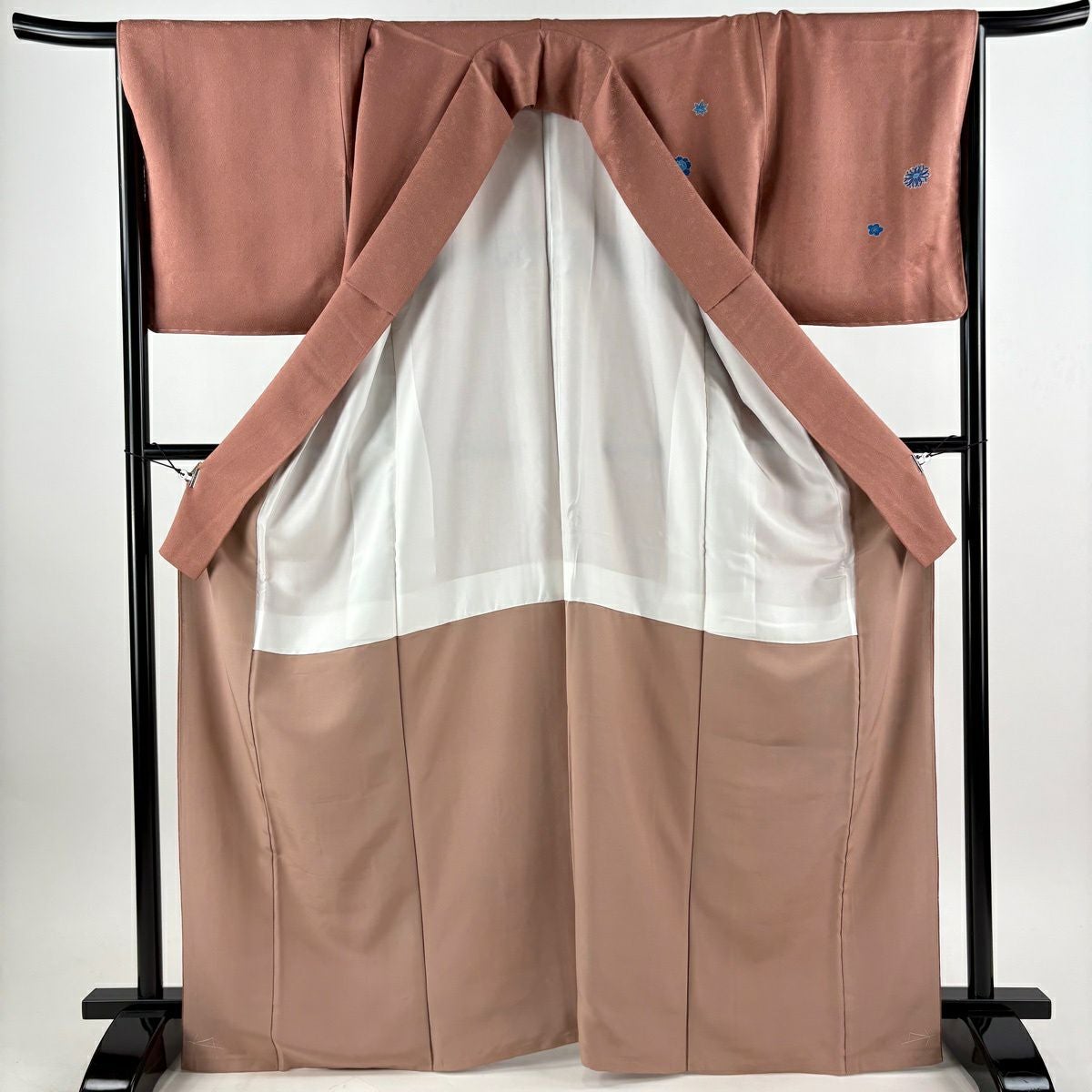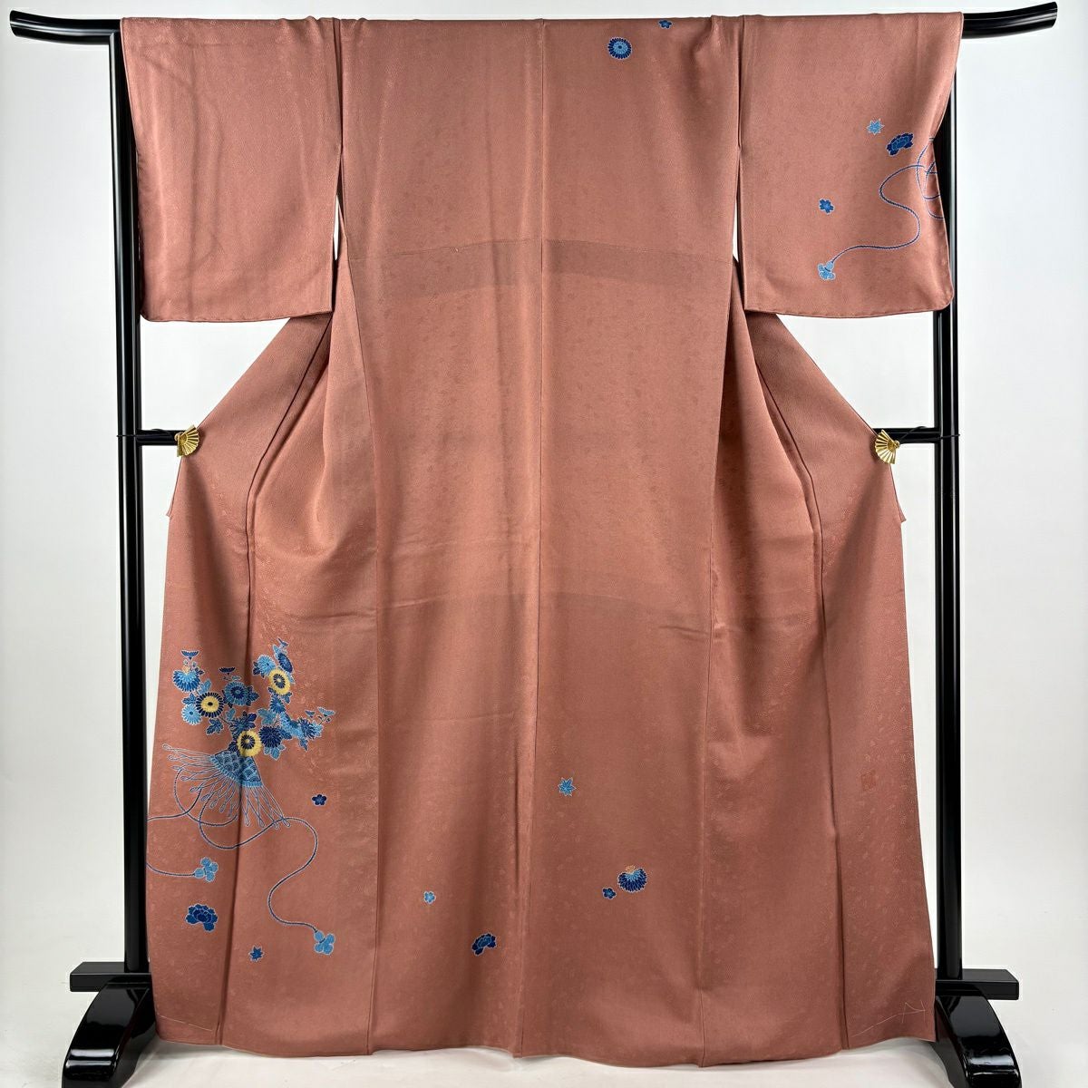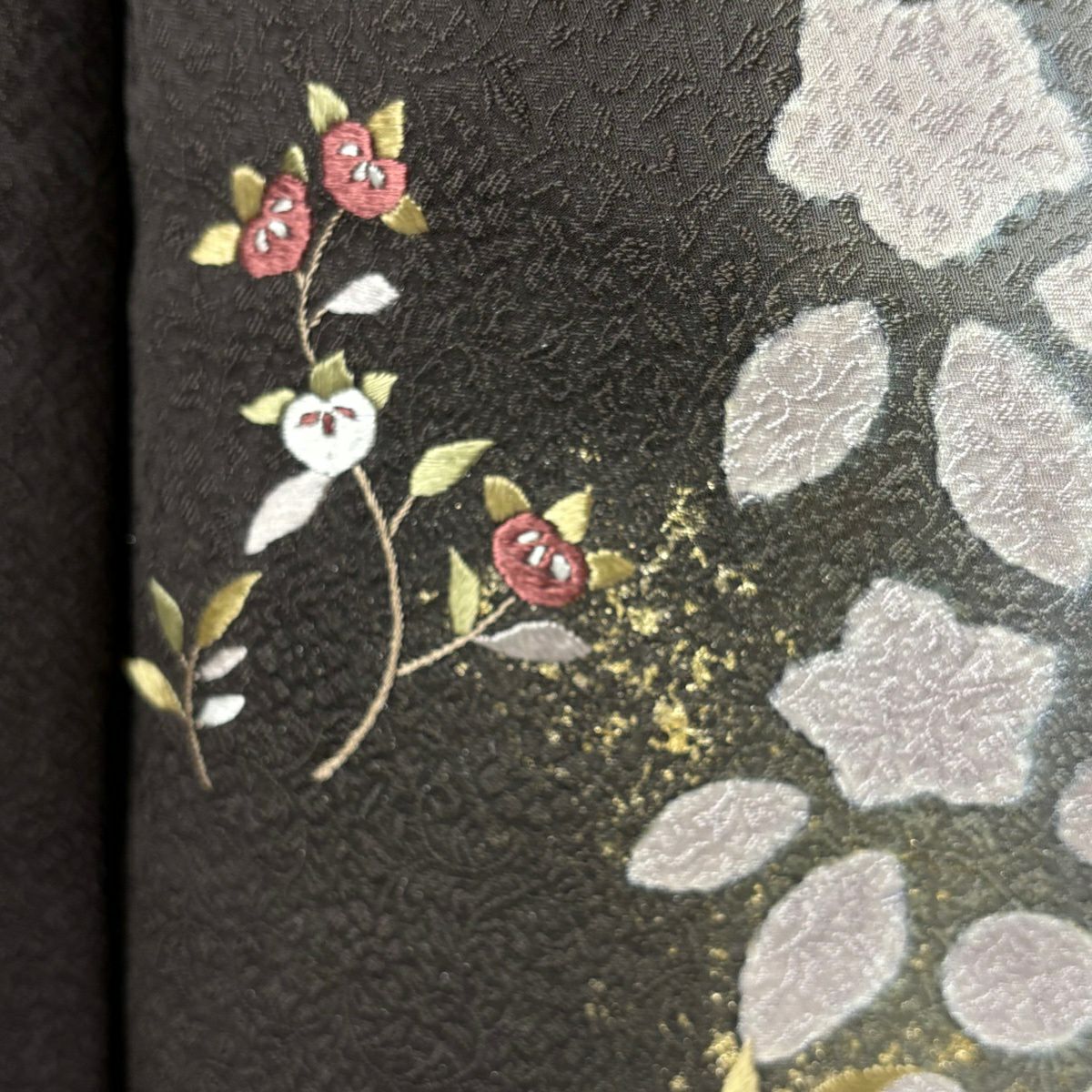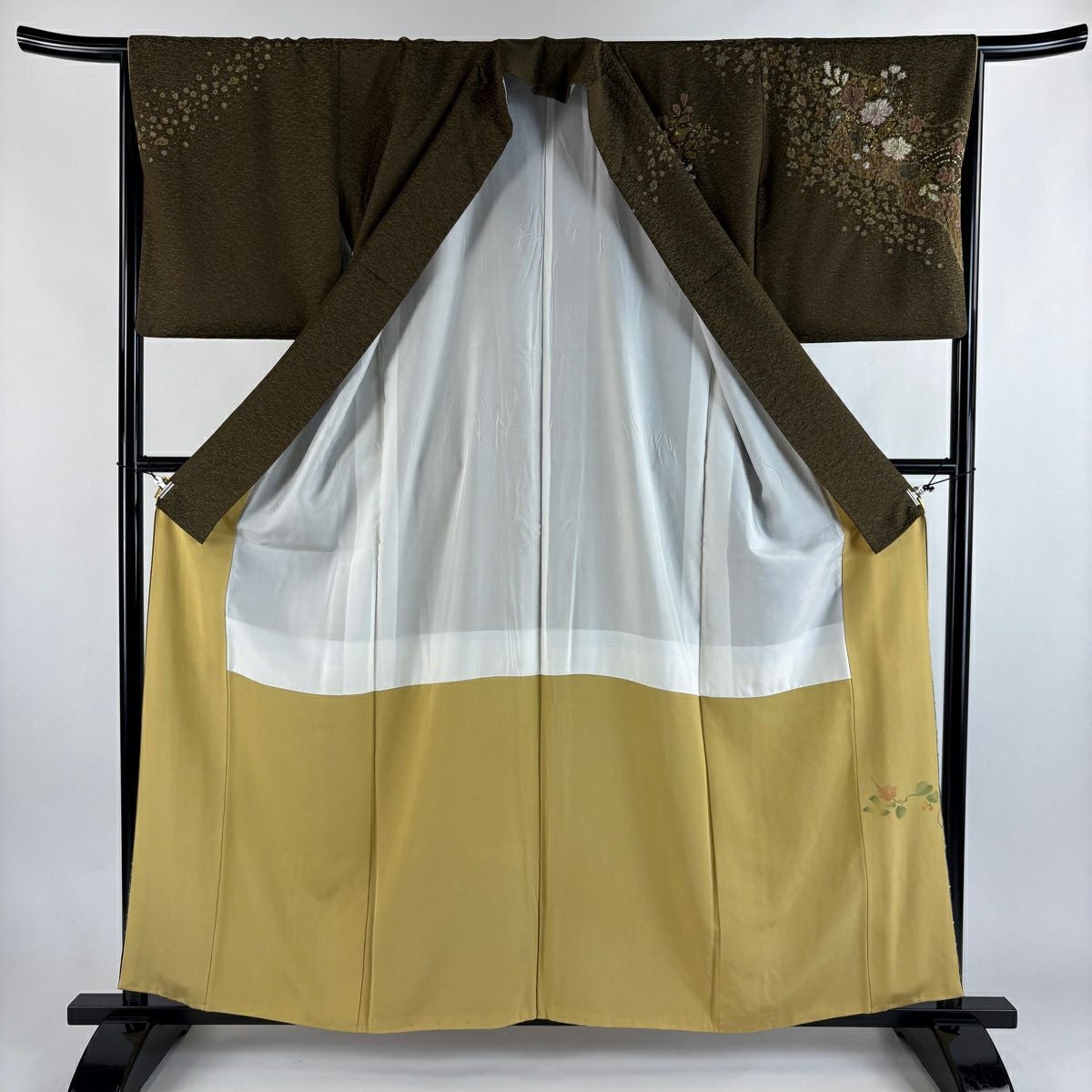 付下げ 身丈160cm 裄丈66cm M 袷 大喜百花 やまと 落款あり 橘花 草花 刺繍 金彩 焦茶色 正絹 逸品